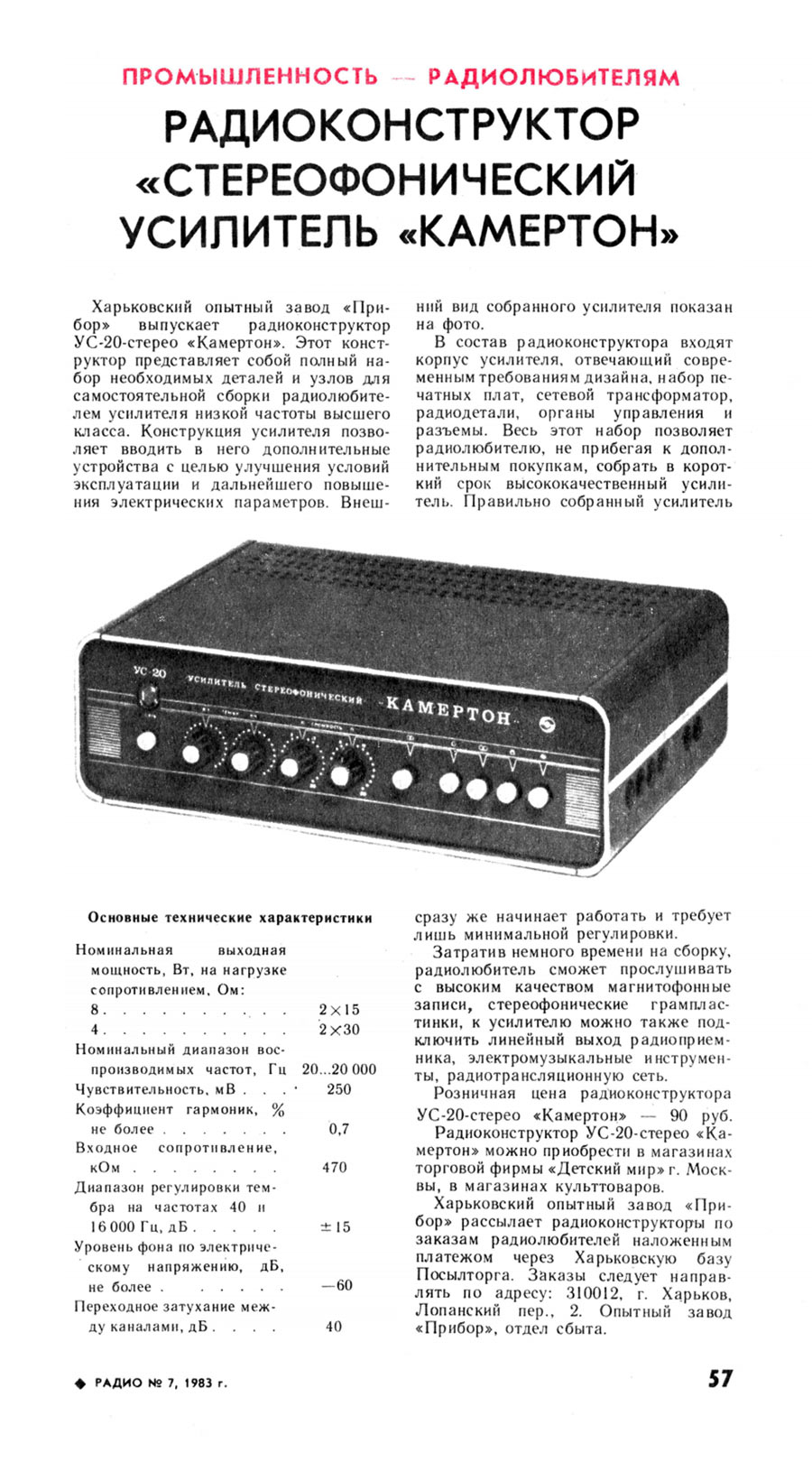 Стереофонический усилитель *Камертон УС-20C* с 1983 года выпускал Харьковский опытный завод *Прибор*. РК представляет собой набор необходимых деталей и узлов для самостоятельной сборки усилителя высшего класса. Конструкция позволяет вводить в него дополнительные устройства с целью улучшения условий эксплуатации и дальнейшего повышения электрических параметров. Цена радиоконструкора 90 рублей.