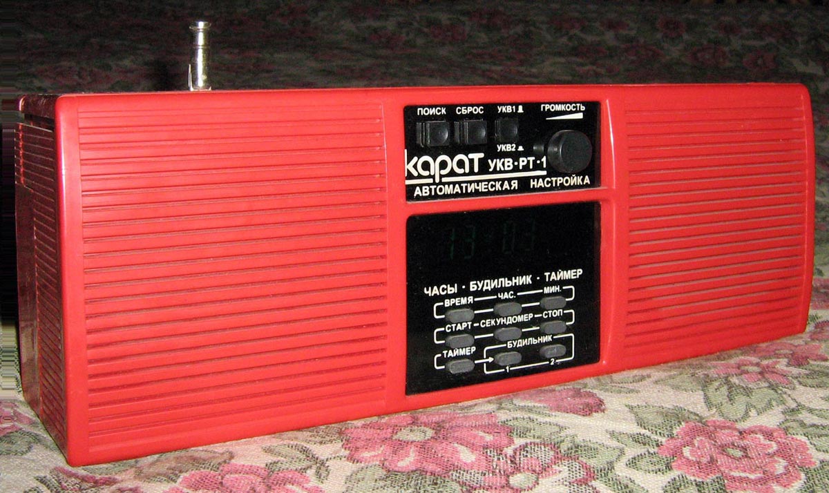 Стационарный транзисторный радиоприёмник *Карат УКВ РТ-1* с 1996 года выпускал Пензенский радиозавод. Радиотаймер **Карат УКВ РТ-1** предназначен для приёма радиовещательных станций работающих в диапазонах: ЧМ - 65,8...74,0 МГц (УКВ-1) и FM - 87,5...108,0 МГц (УКВ-2), а также включение и выключение радиоприёмника по встроенному таймеру. Таймер имеет функцию индикации текущего времени. Питание осуществляется от электросети 220 В. Диапазон звуковых частот воспроизводимых по звуковому давлению не уже 160...10000 Гц. Выходная номинальная мощность не менее 1 Вт. Потребляемая от сети мощность 10 Вт. Габариты радиотаймера 310х125х100 мм. Вес 1,8 кг. Антенна телескопическая. Питание для сохранения информации текущего времени при отключения сети осуществляется от батареи 9 В.