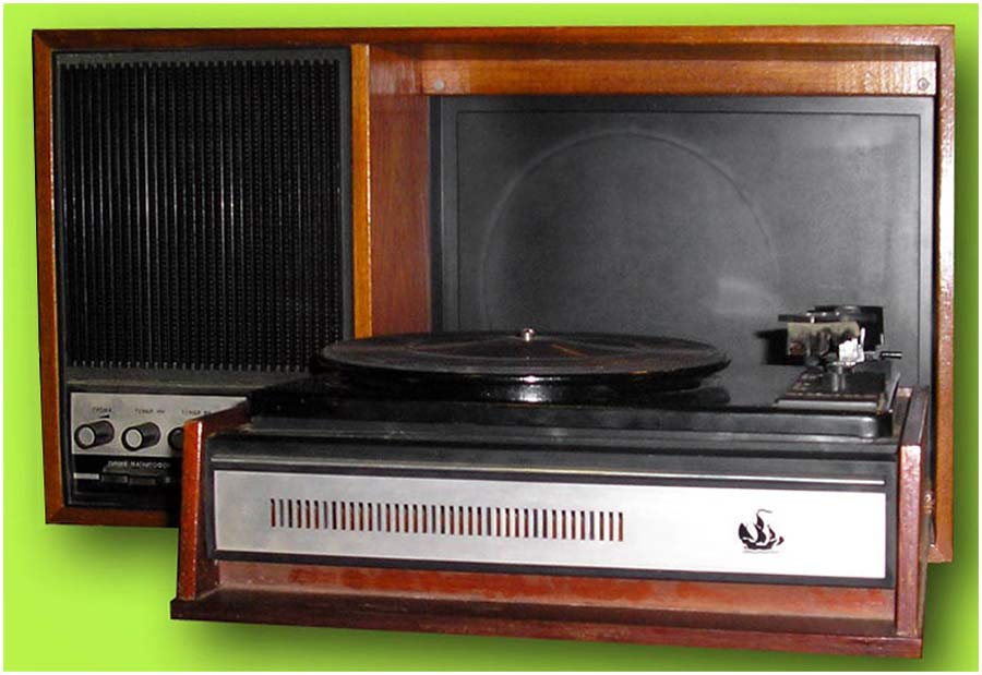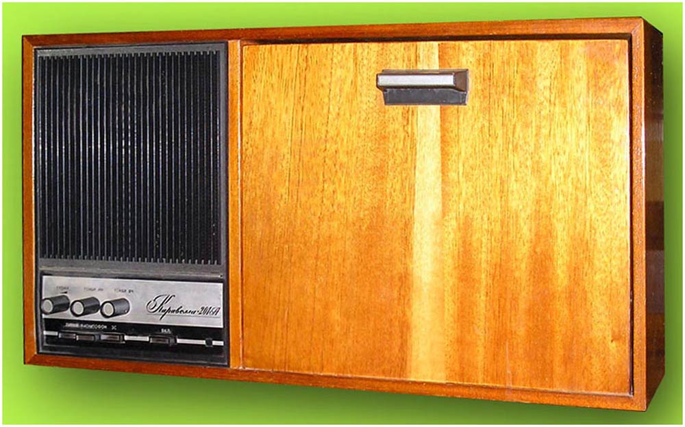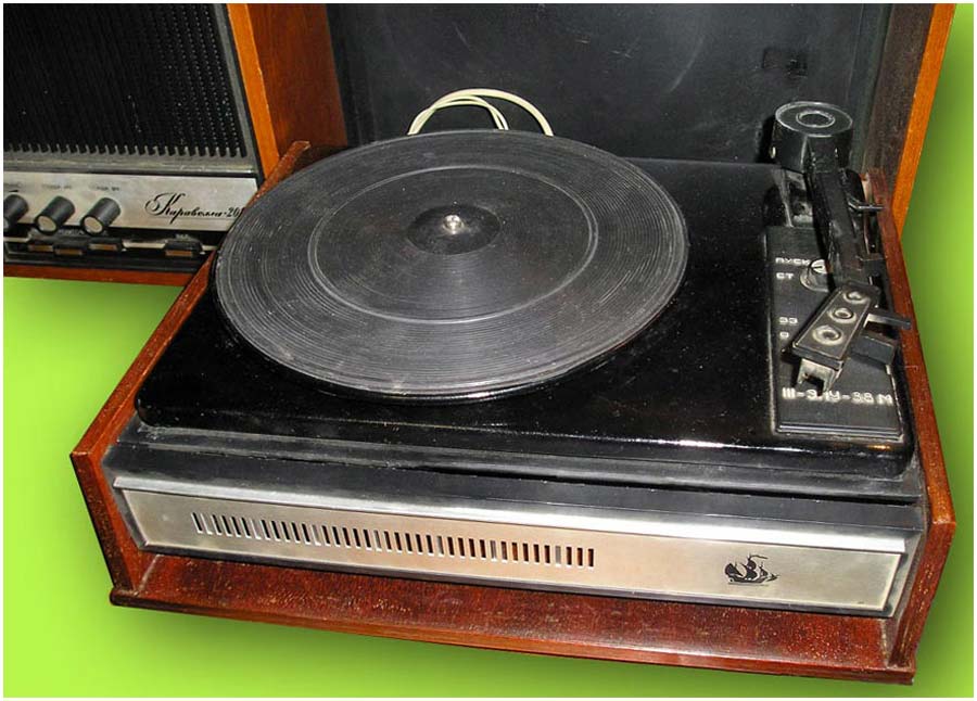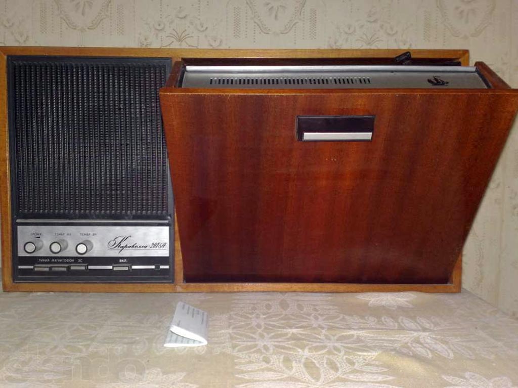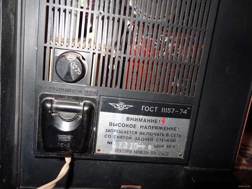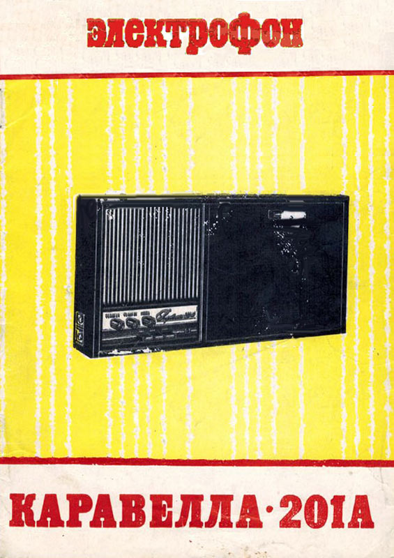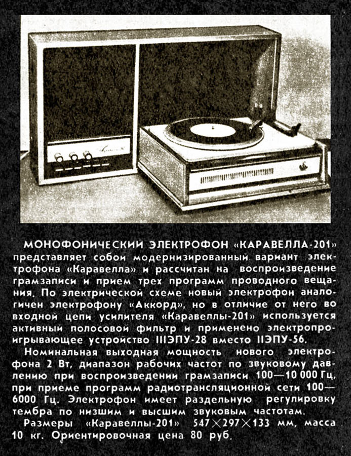 Электрофон сетевой транзисторный *Каравелла-201/А* с начала 1974 года выпускал Кировский завод *Ладога*. Электрофон **Каравелла-201** представляет собой модернизированный вариант электрофона **Каравелла**. Он рассчитан на воспроизведение грамзаписи с грампластинок всех форматов, а также имеет встроенный приёмник для приёма трёхпрограммного проводного радиовещания. По электрической схеме в тракте грамзаписи он аналогичен электрофону **Аккорд**, но здесь во входной цепи усилителя используется активный полосовой фильтр и III-ЭПУ-28 (позже III-ЭПУ-38М) вместо II-ЭПУ-76 установленного в модели **Аккорд-201**. Номинальная выходная мощность электрофона - 2 Вт, диапазон частот при воспроизведении грамзаписи 100...10000 Гц, при приёме радиотрансляции - 100...6000 Гц. Имеется регулировка тембра по НЧ и ВЧ. Размеры электрофона - 547х297х133 мм, вес - 10 кг. Электрофон **Каравелла-201А** не имеет трёхпрограммного приёмника. По внешнему оформлению и конструкции обе модели одинаковы. Цена ЭФ **Каравелла-201** - 80 или 78 рублей, **Каравелла-201А** - 66 рублей.