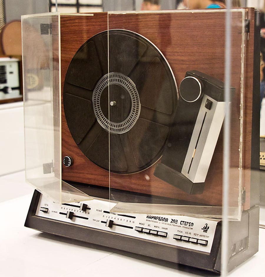 Электрофон сетевой транзисторный *Каравелла-203-стерео* с 1982 года выпускал Кировский завод *Ладога*. Электрофон предназначен для воспроизведения записи с моно и стереофонических пластинок. Особенность данного электрофона - вертикальное положение проигрываемой грампластинки. Всё это потребовало решения технических задач, связанных с устранением влияния дисбаланса грампластинки приводящего к изменению скорости воспроизведения, повышенными требованиями к тонарму звукоснимателя и узлу диска. Для ЭФ 2-й группы сложности оказались непригодны решения, допустимые по затратам для моделей высшей группы, поэтому нужные параметры были получены иначе - применением быстродействующей системы стабилизации частоты вращения диска и тангенциального тонарма оригинальной конструкции. От других электрофонов **Каравелла-203-стерео** отличается и рядом новых потребительских качеств. Так был использован непосредственный привод диска, от сверх-тихоходного асинхронного дугостаторного двигателя с электронной стабилизацией частоты вращения, применён звукосниматель на основе тангенциального тонарма и пьезокерамической головки типа ГЗК-208, предусмотрен стробоскоп со встроенной подсветкой и плавная регулировка частоты вращения диска, верньерное устройство ручного перемещения головки звукоснимателя с блокировкой перемещения рабочего положения, фиксатор для пластинки на оси диска ЭПУ, очиститель пластинки. ЭФ комплектуется двумя широкополосными АС фазоинверсного типа, НЧ тракт отличается низким уровнем нелинейных искажений. Электрофон имеет свойства для моделей второй группы сложности: Это раздельные регуляторы громкости, тембра по ВЧ и НЧ частотам звука, переключатели **моно и стерео**, входов и формата пластинок, устройство отключения автостопа. Частота вращения диска 33 и 45 об/мин. Коэффициент детонации 0,2%. Номинальная выходная мощность 2х3 Вт. Диапазон звуковых частот по напряжению 40...20000 Гц, по звуковому давлению 80...16000 Гц. Коэффициент гармоник 0,5%. Отношение сигнал/шум -63 дБ. Переходное затухание каналов -50 дБ. Габариты электрофона 420х437х185 мм. АС 332х475х165 мм. Масса электрофона 13 кг. АС 6 кг Цена комплекта 347 руб.