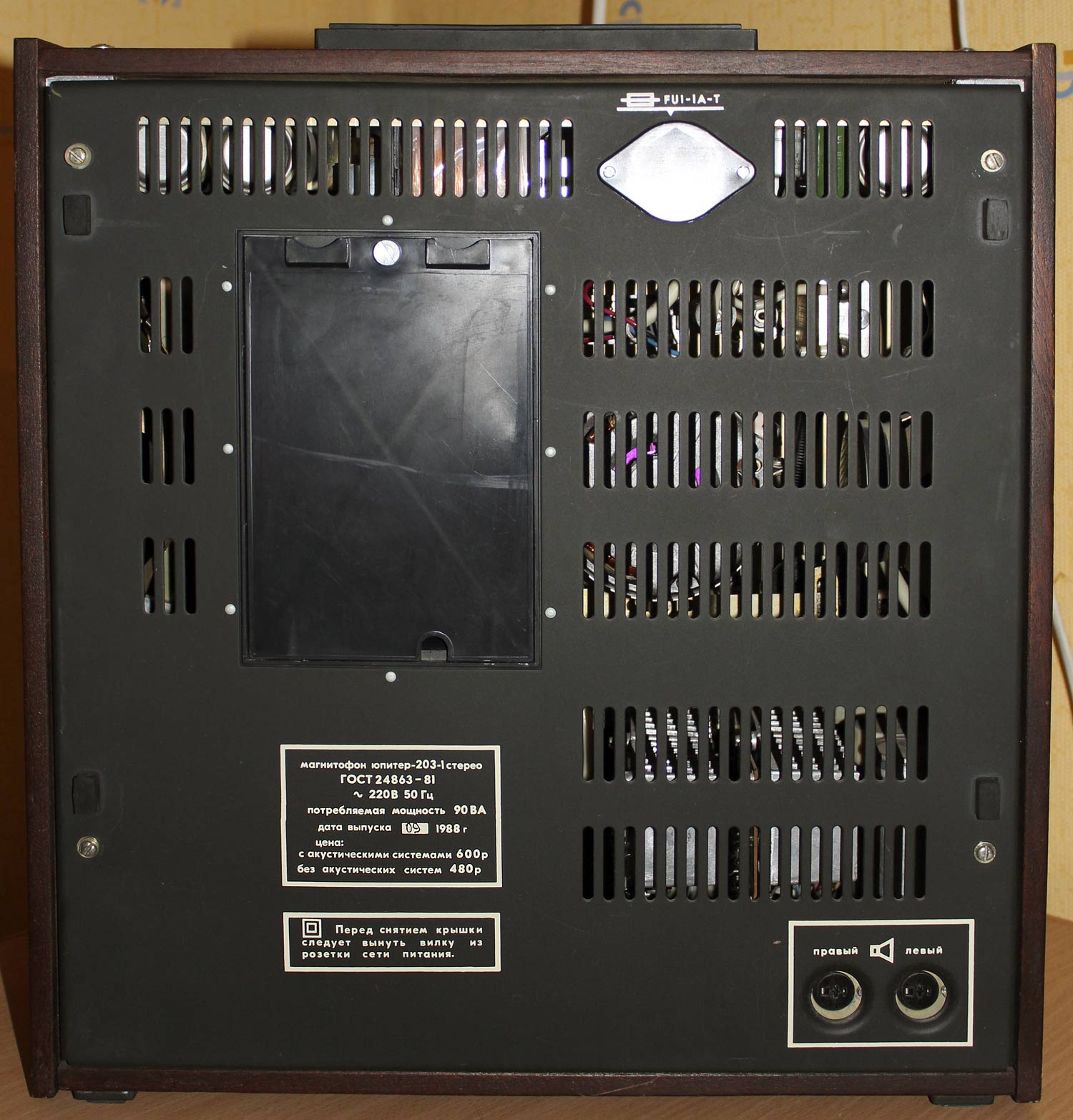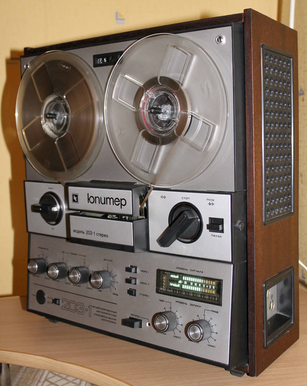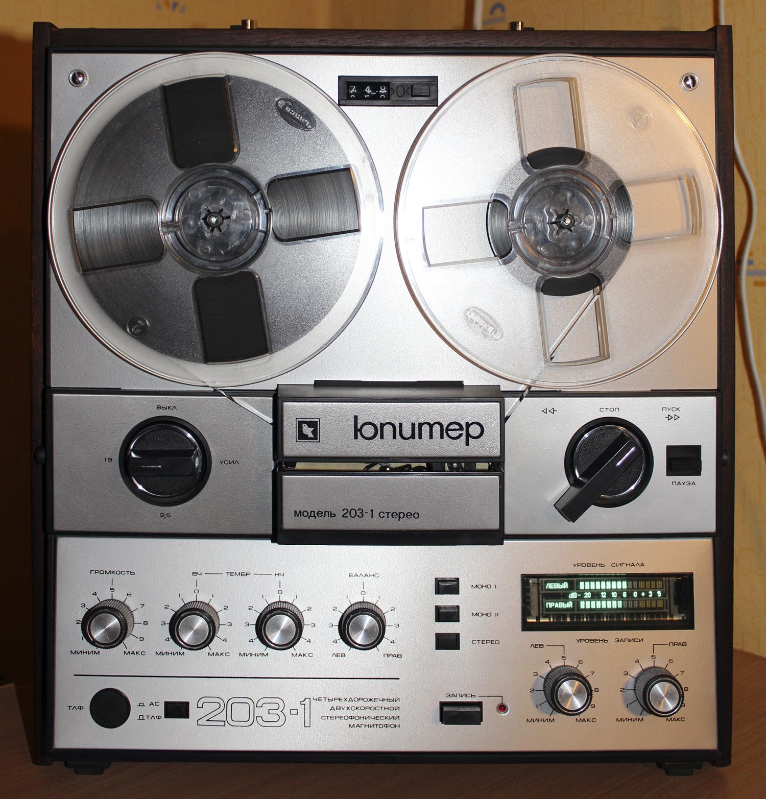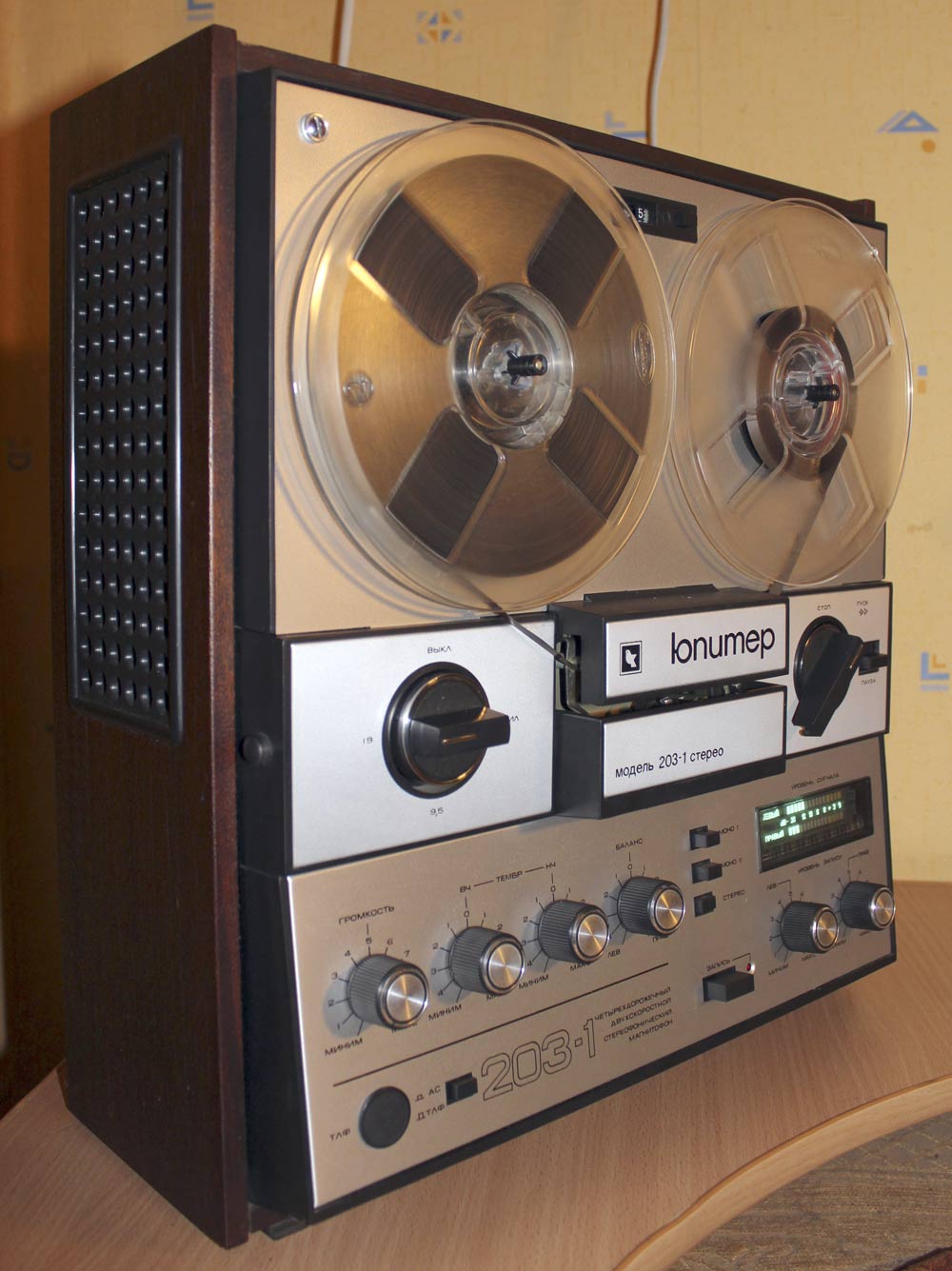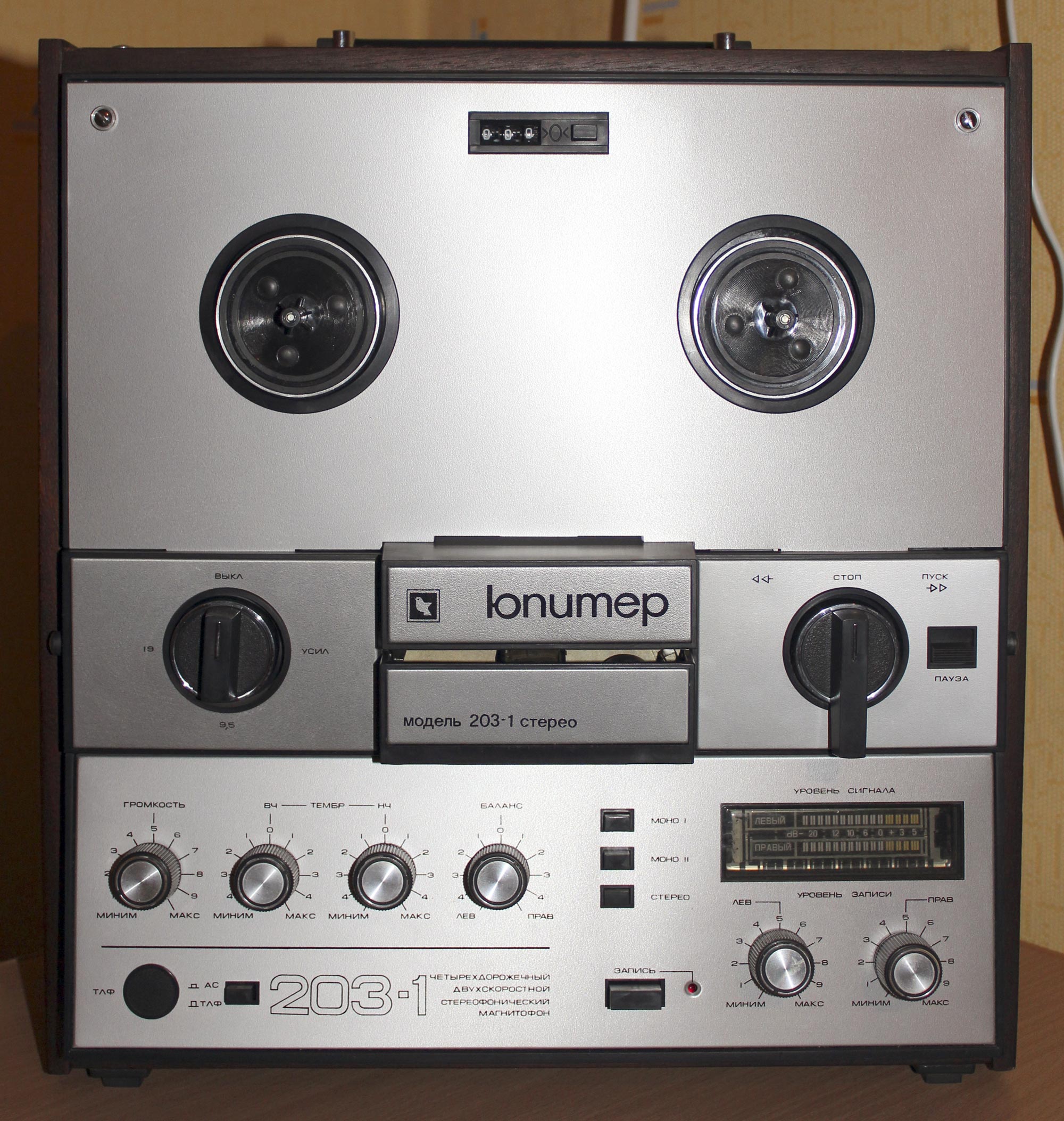 Катушечный магнитофон *Юпитер-203-1-стерео* с 1982 года выпускал Киевский завод *Коммунист*. Магнитофон отличается от магнитофона **Юпитер-203-стерео** оформлением, люминесцентным индикатором и изменениями схемы направленными на улучшение параметров. Он обеспечивает запись моно и стереофонических фонограмм с последующим воспроизведением через внутренние или выносные громкоговорители и стереотелефоны. Предусмотрена возможность: автоматического останова ЛПМ по окончании или обрыве ленты; регулировки уровней громкости; регулировки стереобаланса; раздельной регулировки уровня записи; контроля уровня записи и пиковых перегрузок по индикаторам; работы в режиме **Усилитель**; световой индикации включения. Наличие трехдекадного счётчика расхода магнитной ленты с кнопкой сброса, позволяет находить записи и определять расход ленты. Корпус магнитофона деревянный, облицован шпоном ценных пород, с глянцевым покрытием. В комплект входит 2 **10АС-222**, 2 микрофона **МД-201**, 3 катушки (в том числе 2 с магнитной лентой А4309-6Б). Тип ленты А4309-6Б или А4409-6Б. Номер катушки 18. Скорости 19,05 и 9,53 см/с. Время записи 2х45; 2х90 мин. Диапазон частот звука 40...18000, 40...12500 Гц. Коэффициент детонации ±0,14, ±0,25%. Коэффициент гармоник на ЛВ 3,0%. Относительный уровень шумов и помех канала З-В -54 дБ. Номинальная выходная мощность 2х6, максимальная 2х15 Вт. Входное сопротивление АС - 4 Ом. Потребляемая от сети мощность 90 Вт. Габариты магнитофона 408х444х196 мм. Масса 16 кг. Цена 480 рублей. Экспортный вариант магнитофона выпускался под наименованием *Kashtan-1*.