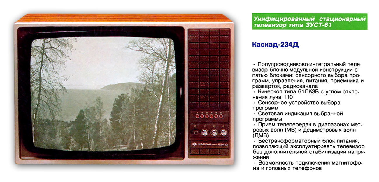 Телевизор *Каскад-234/Д* подготовило к выпуску с 1985 года Куйбышевское ПО *Экран*. Унифицированный п/п-интегральный телевизор **Каскад-234/Д** предназначен для приёма телевизионных программ в МВ диапазоне волн. В телевизоре имеется ряд автоматических регулировок, обеспечивающих высококачественное изображение и звуковое сопровождение. Отличительная особенность телевизора - применение импульсного источника питания и новой элементной базы, позволившей уменьшить габариты и массу ТВ, потребляемую мощность, увеличить надежность работы. В телевизоре применены: взрывобезопасный кинескоп 61ЛКЗБ, с углом отклонения луча 110 °; всеволновый селектор программ СВП-4-10; селектор каналов метрового диапазона СК-М-24. Предусмотрена возможность: установки селектора каналов СК-Д-24 для приёма передач в ДМВ диапазоне, подключения магнитофона для записи звукового сопровождения передач и прослушивания звукового сопровождения на головные телефоны. Размер изображения 375х481 мм. Чувствительность (не хуже) 55 мкВ. Диапазон воспроизводимых частот 100...10000 Гц. Номинальная выходная мощность канала звукового сопровождения 2,5 Вт. Напряжение питания 220 В. Потребляемая мощность 40 В-А. Габариты телевизора 490х710х400 мм. Масса 26 кг. Цена 330 рублей. В серийное производство телевизор был запущен под наименованием *КАСКАД 61ТБ-301*, полностью аналогичный описанному выше.