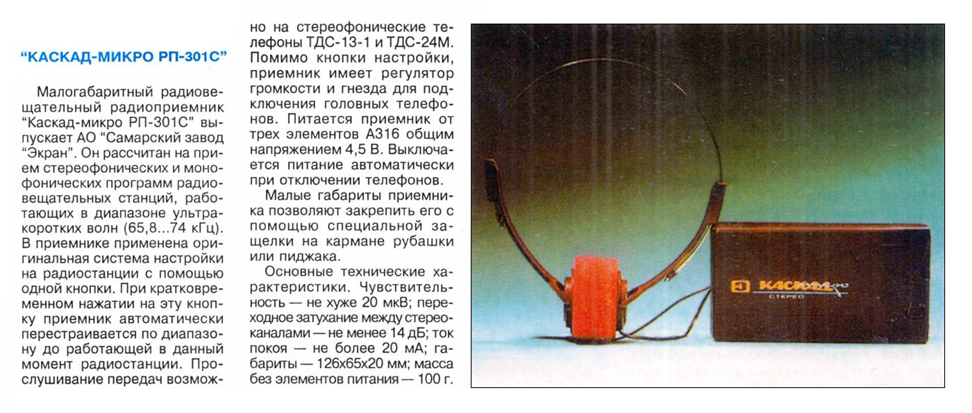 Малогабаритный радиоприёмник *Каскад-Микро РП-301С* с 1998 года планировал выпускать АО Самарский завод *Экран*. Приёмник рассчитан на приём моно и стереофонических радиовещательных программ в диапазоне УКВ - 65,8...74 МГЦ. Подробнее в журнале Радио № 12 за 1996 г.