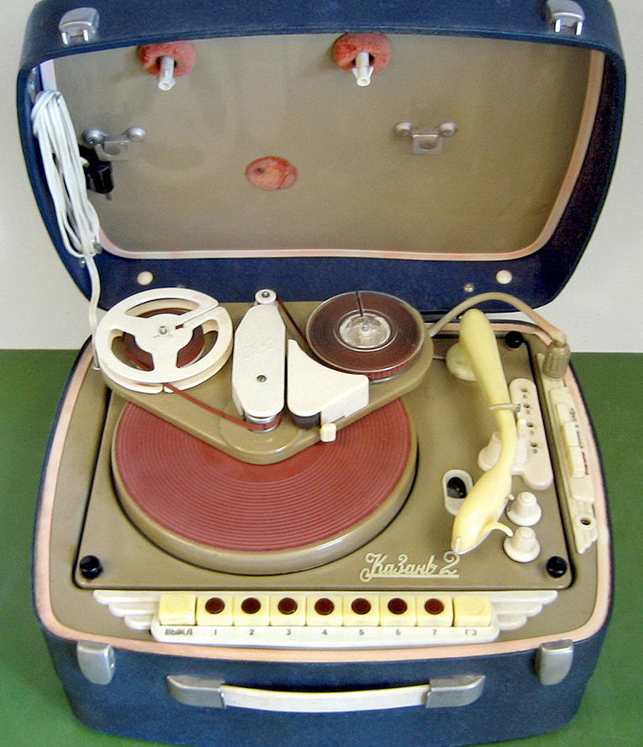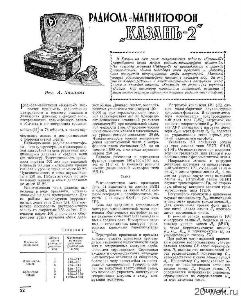 Комбинированная установка *Казань-2* (радиола-магнитофон) с 1959 года выпускалась Казанским заводом *Радиоприбор*. Модель разработана на базе радиолы **Казань-57**. КУ работает в диапазонах ДВ и СВ, а так же воспроизводит грамзапись с обычных и долгоиграющих пластинок. МП осуществляет запись и воспроизведение фонограмм. Приёмник - супер с фиксированной настройкой на семь различных частот в двух диапазонах. Чувствительность приёмника 500 мкВ. Чувствительность с гнёзд звукоснимателя 250 мВ. Избирательность по каналам приёма 15 дБ. МП устанавливается на диск ЭПУ. При записи используется ферромагнитная лента типа 2 или СН. Скорость протяжки ленты 9,53 см/сек. При ёмкости кассет 100 метров, время звучания обеих дорожек составляет 36 мин. Диапазон записываемых или воспроизводимых частот 100...6000 Гц. Коэффициент искажений 5%, при выходной мощности 1 Вт. Установка размещена в оклеенном деревянном футляре размером 380х300х100 мм. Вес установки 11 кг. В комплекте динамический микрофон МД-41. Описание и схема Радио №4/1961 ст.22