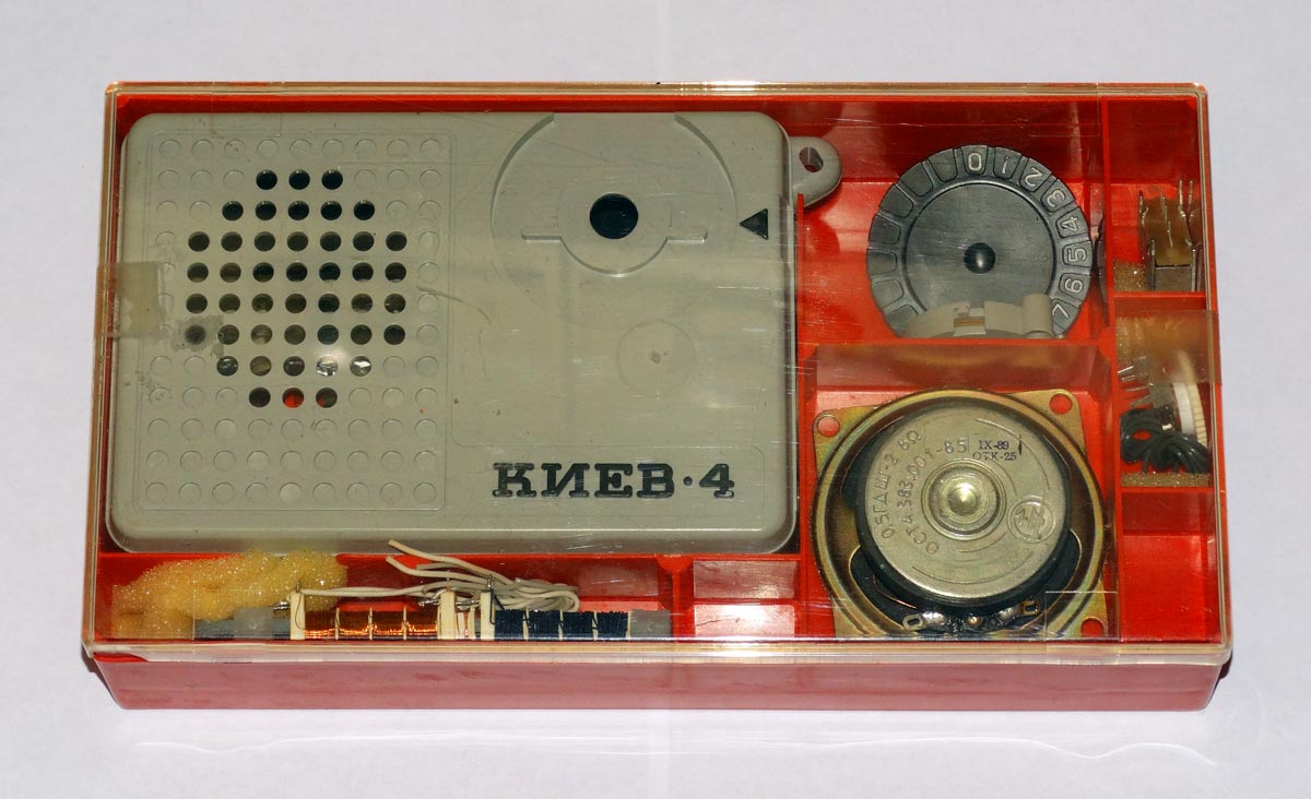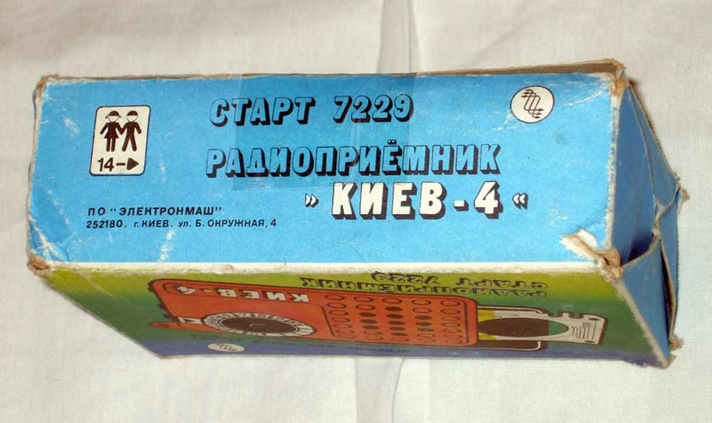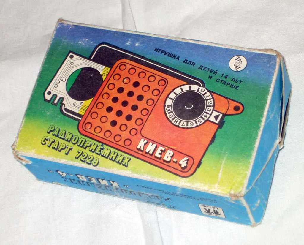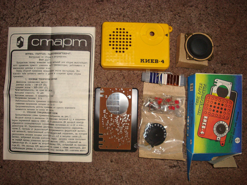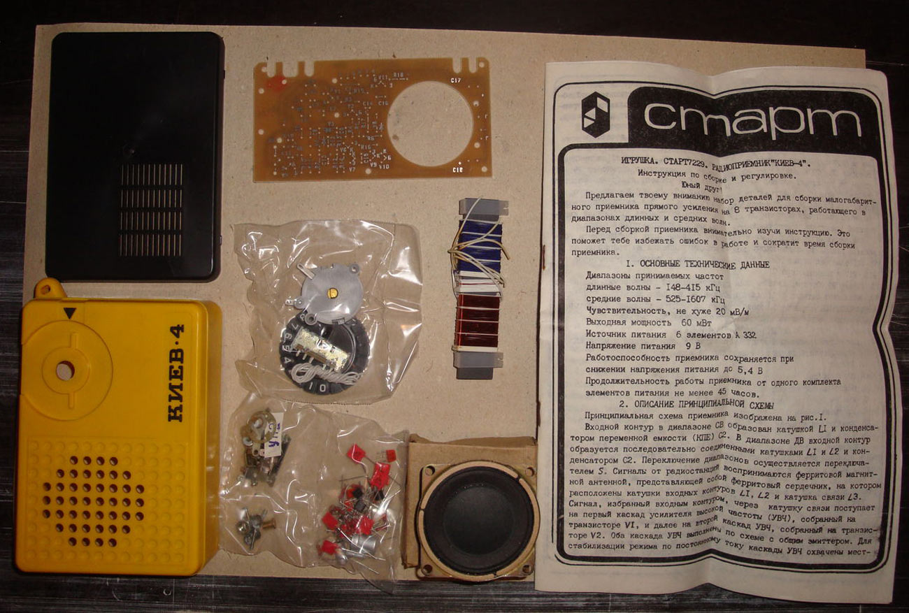 Радиоприёмник *Киев-4* из набора *Старт 7229* с начала 1980 года выпускало Киевское ПО *Электронмаш*. Набор деталей и узлов позволяет собрать приёмник прямого усиления *Киев-4* на 8 транзисторах и 3 диодах, работающий в диапазонах ДВ и СВ. Чувствительность собранного и настроенного приёмника 20 мВ/м. Номинальная выходная мощность 60 мВт. Питание напряжением 9 вольт от 6 элементов А-332. Цена набора конструктора 14 руб.