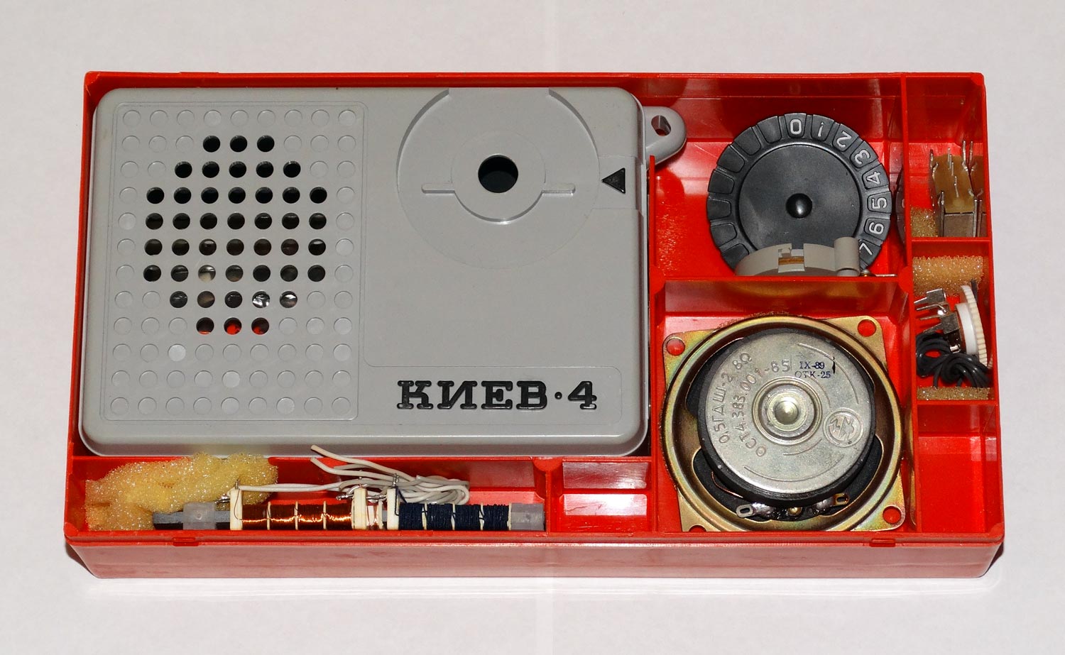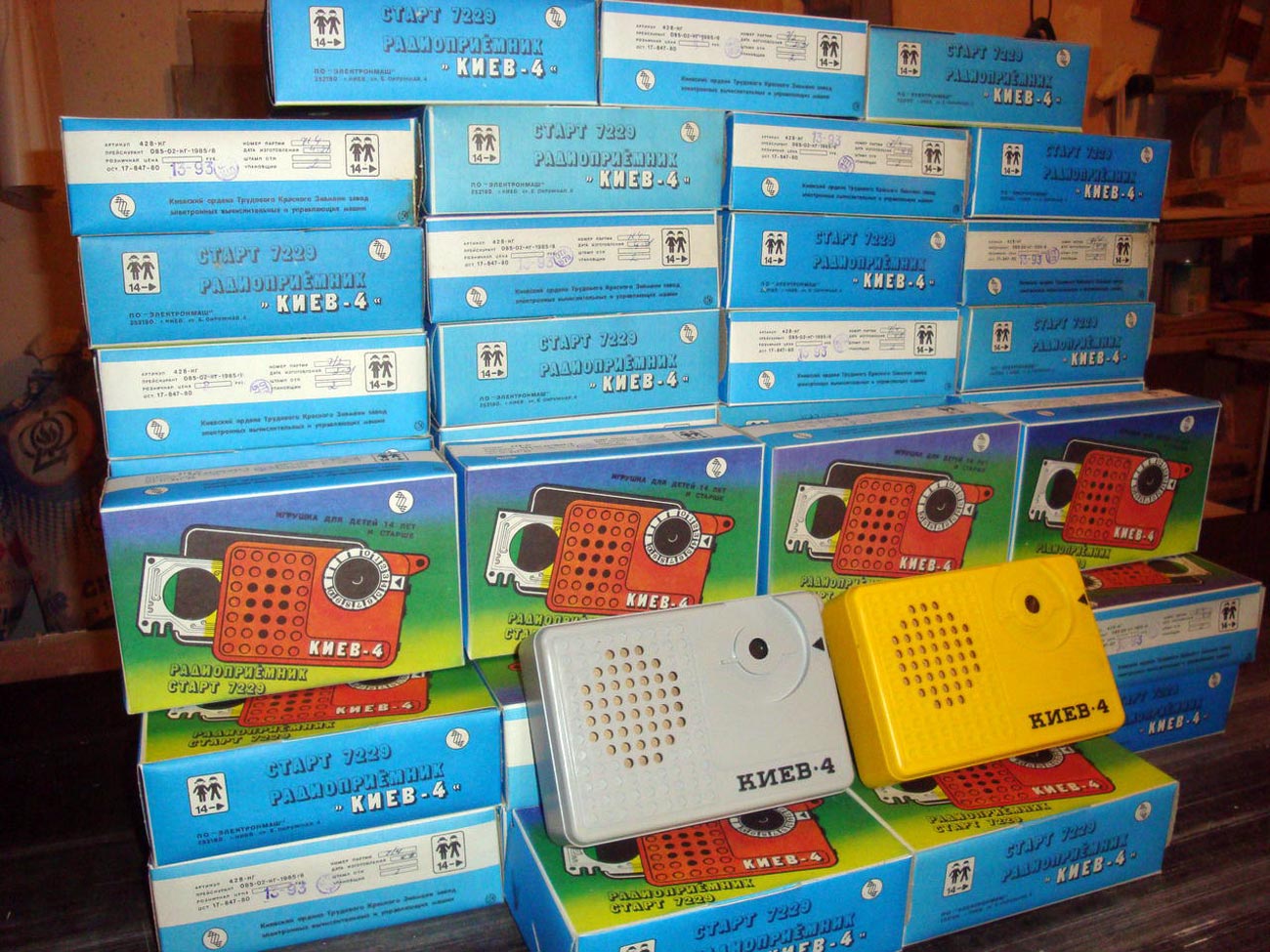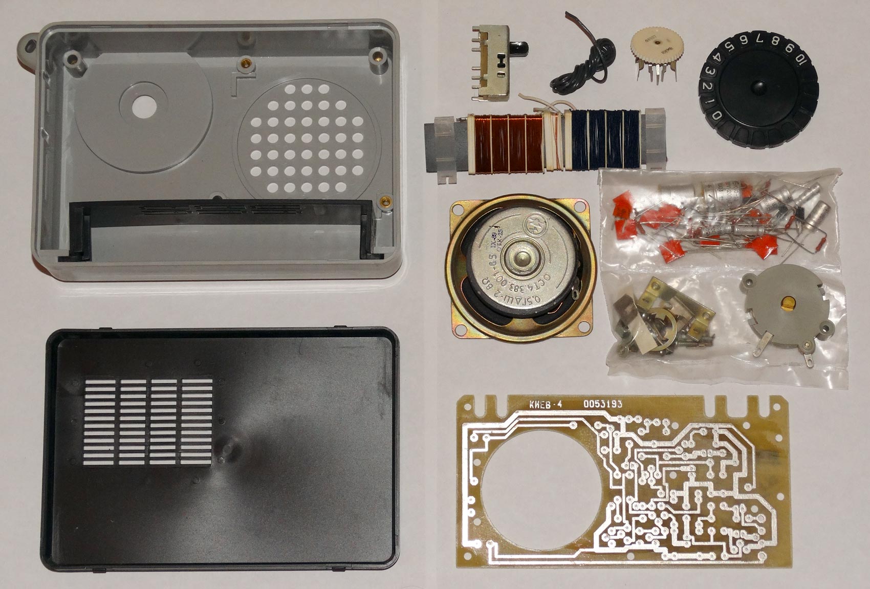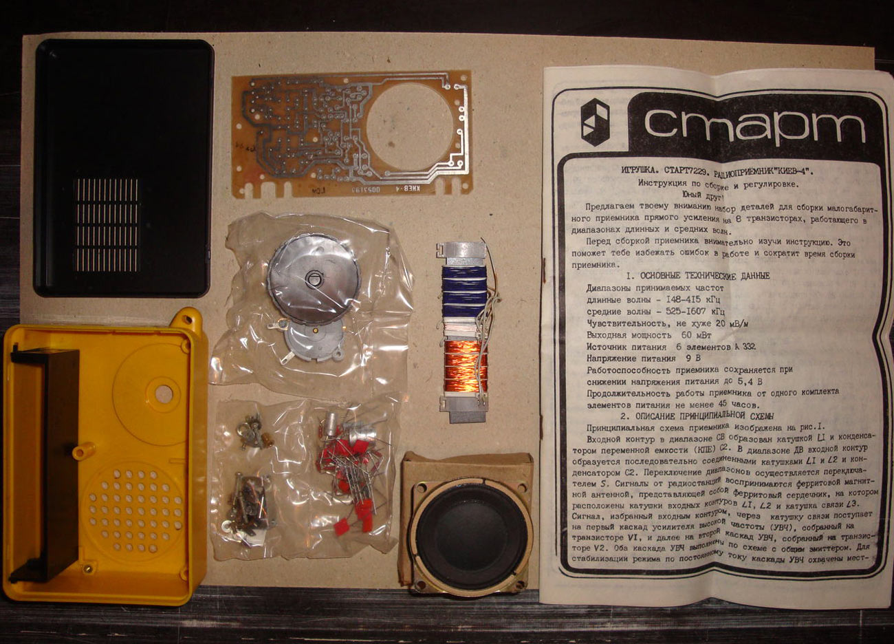 Радиоприёмник *Киев-4* из набора *Старт 7229* с начала 1980 года выпускало Киевское ПО *Электронмаш*. Набор деталей и узлов позволяет собрать приёмник прямого усиления *Киев-4* на 8 транзисторах и 3 диодах, работающий в диапазонах ДВ и СВ. Чувствительность собранного и настроенного приёмника 20 мВ/м. Номинальная выходная мощность 60 мВт. Питание напряжением 9 вольт от 6 элементов А-332. Цена набора конструктора 14 руб.