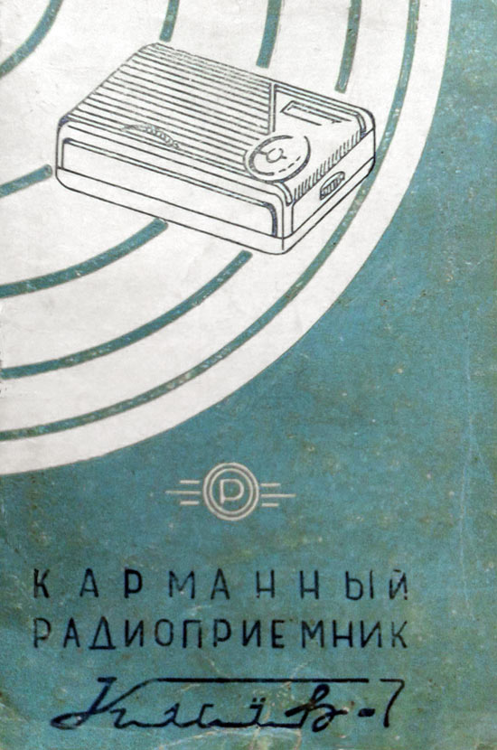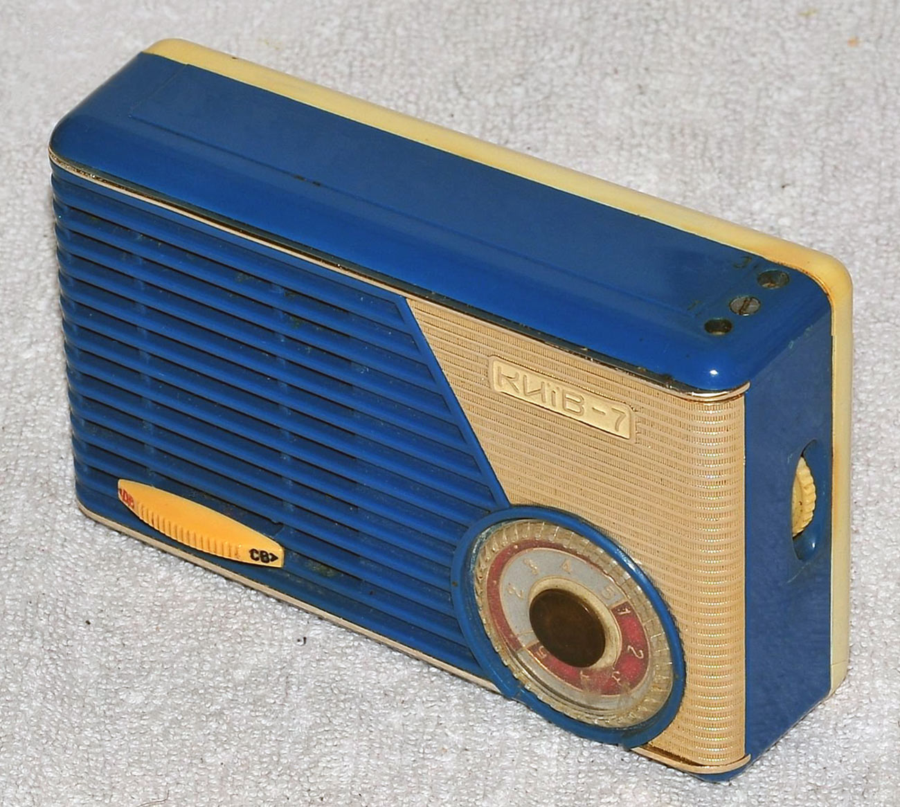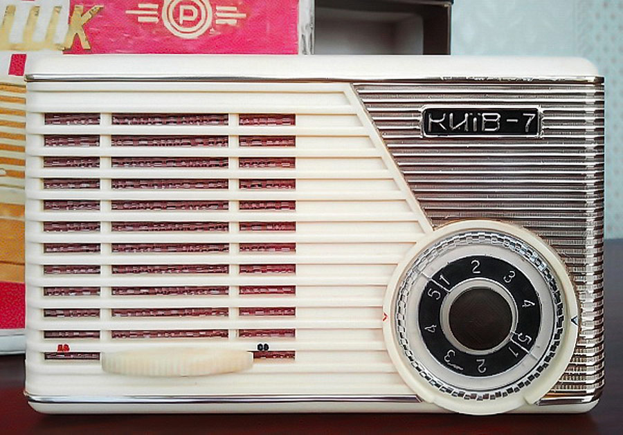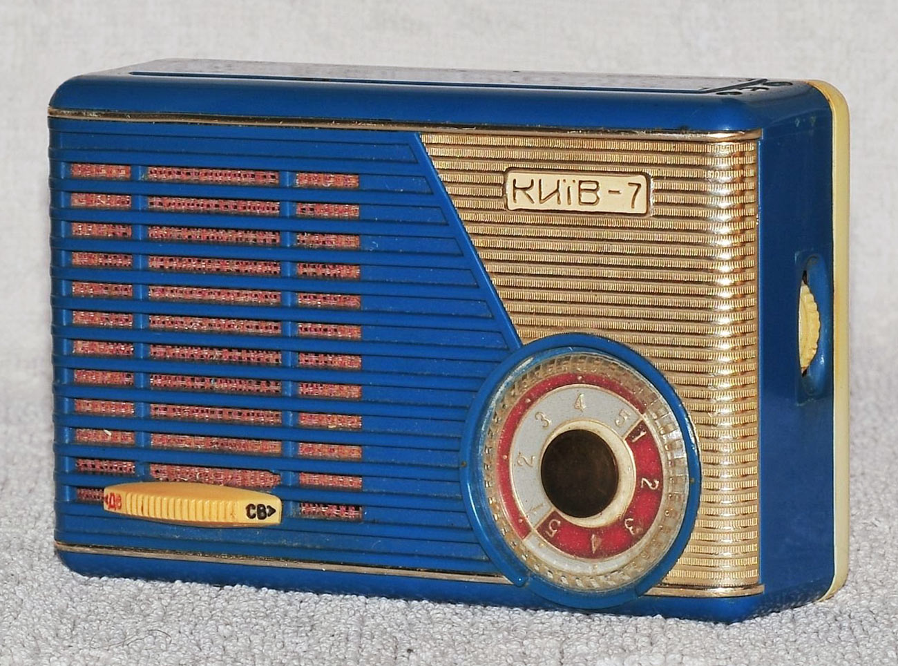 Портативный транзисторный радиоприёмник *Киев-7* с начала 1963 года выпускал Киевский завод *Радиоприбор*. Супергетеродин на 7-ми транзисторах. Предназначен для приёма в диапазонах ДВ и СВ на магнитную антенну. Комплектуется футляром из натуральной кожи. Максимальная чувствительность на ДВ - 1,0 мВ/м, СВ - 0,8 мВ/м. Избирательность по соседнему каналу - 16 дБ. Ослабление зеркального канала - 14 дБ. ПЧ - 465 кГц. Действие АРУ: при изменении сигнала на входе на 26 дБ, сигнал на выходе меняется на 12 дБ. Полоса воспроизводимых частот звука 450...3000 Гц. Номинальная выходная мощность - 60 мВт. Источники питания батарея **Крона** или аккумулятор 7Д-0,1. Потребляемый ток при отсутствии сигнала 5,6 мА. Длительность работы приёмника при средней громкости: от батареи **Крона** 30 часов, аккумулятора 10 часов. Габариты радиоприёмника - 125 х 78 x 36 мм. Масса- 400 грамм.