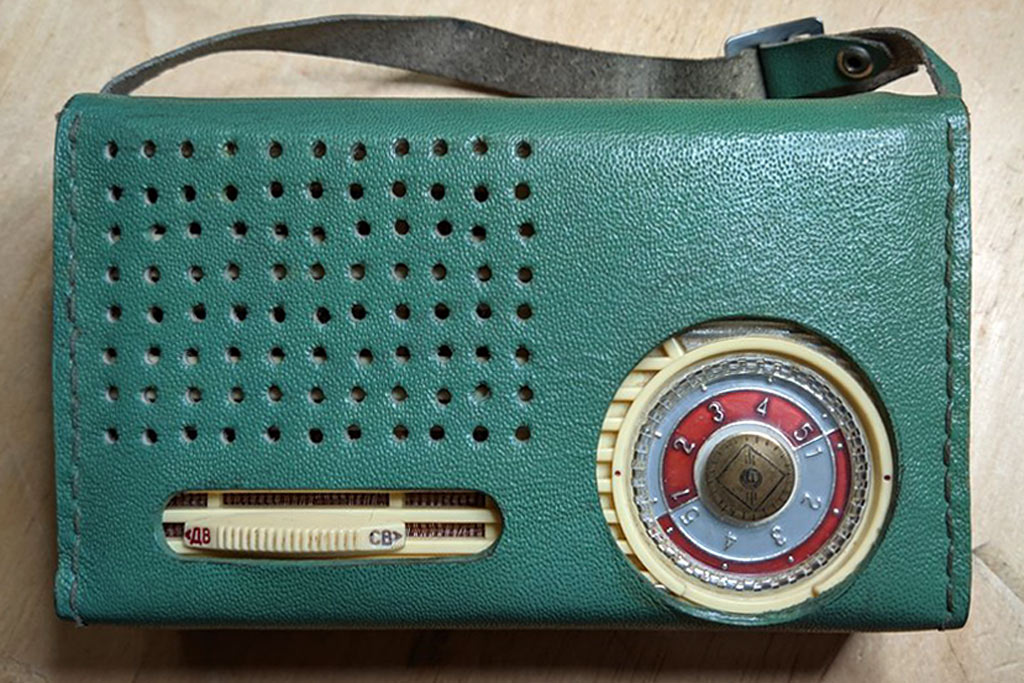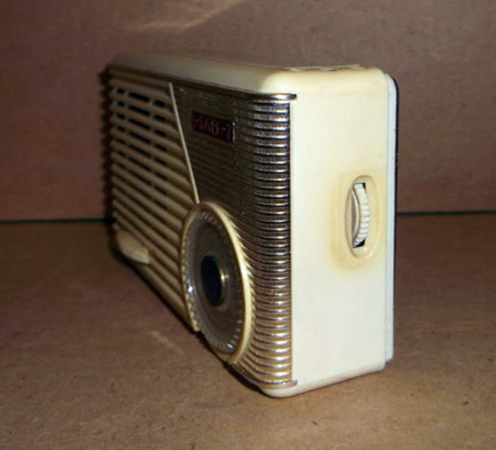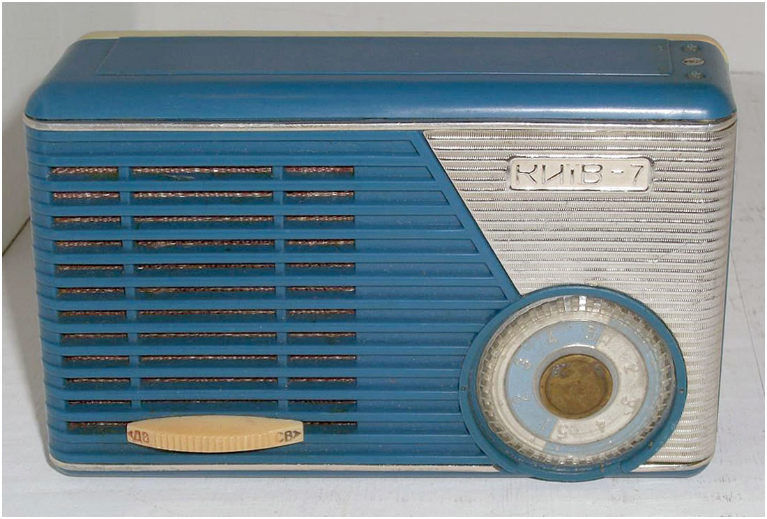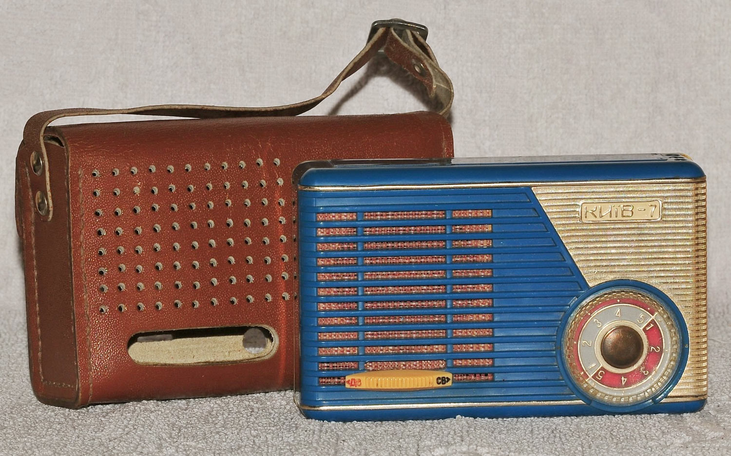Портативный транзисторный радиоприёмник *Киев-7* с начала 1963 года выпускал Киевский завод *Радиоприбор*. Супергетеродин на 7-ми транзисторах. Предназначен для приёма в диапазонах ДВ и СВ на магнитную антенну. Комплектуется футляром из натуральной кожи. Максимальная чувствительность на ДВ - 1,0 мВ/м, СВ - 0,8 мВ/м. Избирательность по соседнему каналу - 16 дБ. Ослабление зеркального канала - 14 дБ. ПЧ - 465 кГц. Действие АРУ: при изменении сигнала на входе на 26 дБ, сигнал на выходе меняется на 12 дБ. Полоса воспроизводимых частот звука 450...3000 Гц. Номинальная выходная мощность - 60 мВт. Источники питания батарея **Крона** или аккумулятор 7Д-0,1. Потребляемый ток при отсутствии сигнала 5,6 мА. Длительность работы приёмника при средней громкости: от батареи **Крона** 30 часов, аккумулятора 10 часов. Габариты радиоприёмника - 125 х 78 x 36 мм. Масса- 400 грамм.