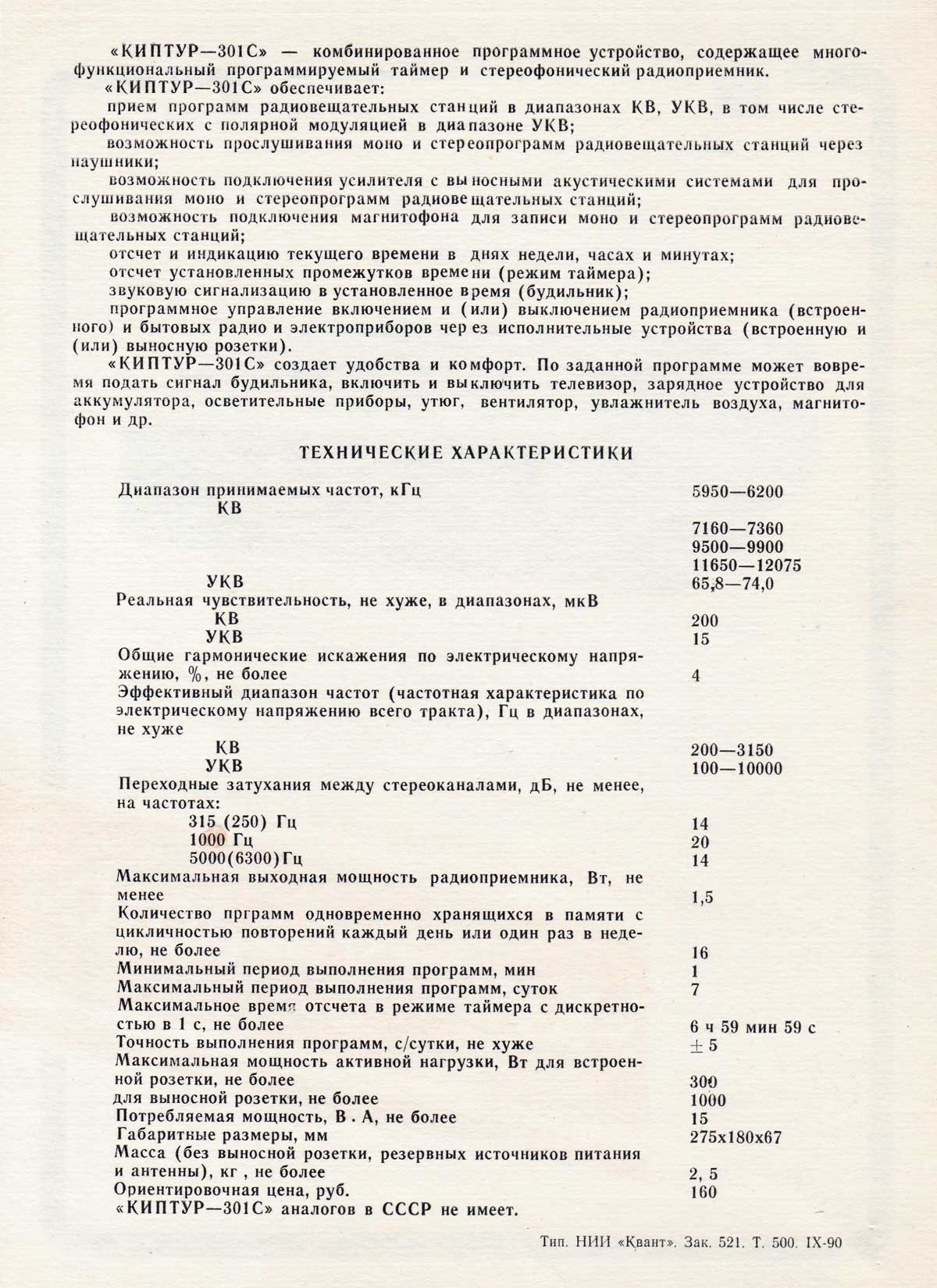 Комбинированное программное устройство *Киптур-301С* подготовлено к выпуску с 1991 года НПО *Квант* (Киевский завод *Буревестник*).