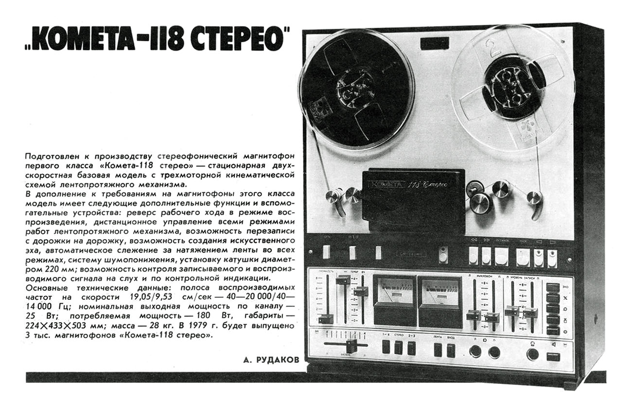 Сетевой катушечный магнитофон *Комета-118-стерео* в 1978 году разработан на Новосибирском заводе Точного машиностроения. Магнитофон был подготовлен к серийному производству с 1980 года, но по ряду причин так и не был запущен в серию. Было изготовлено несколько опытных образцов, причём в нескольких вариантах оформления. Магнитофон *Комета-118-стерео* предназначен для записи и воспроизведения речевых музыкальных фонограмм. Лентопротяжный механизм - трехмоторный. В магнитофоне предусмотрены дистанционное управление всеми режимами работы ЛПМ, перезапись фонограмм с дорожки на дорожку, реверс рабочего хода в режиме воспроизведения, контроль записываемого или воспроизводимого сигналов через встроенные громкоговорители или АС и по стрелочным индикаторам. Имеется подавитель шума в паузах фонограмм и устройство создания искусственной реверберации. Натяжение ленты стабилизировано во всех режимах работы. Рекомендемая магнитная лента типа А4409-6Б. Скорость протяжки магнитной ленты 19,05; 9,53 см/сек. Коэффициент детонации на скорости: 19,05 см/сек ±0,1 %, 9,53 см/сек ±0,2 %. Номинальная выходная мощность на нагрузке 4 0м - 2х25 Вт. Диапазон частот на линейном выходе на скоростях: 19,05 см/сек - 40...20000 Гц, 9,53 - 40...14000 Гц. Потребляемая от эл. сети мощность - 180 Вт. Габариты магнитофона - 433х503х224 мм. Масса 28 кг.