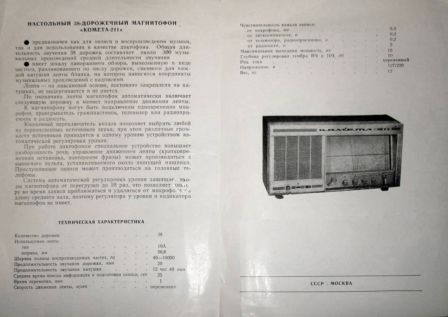 38-дорожечный магнитофон *Комета-211* подготовлен к выпуску предположительно в 1970 году предположительно Новосибирским заводом *Точмаш*. В производство магнитофон не пошёл, а был передан на Куйбышевский завод имени Масленникова, где выпускался серийно с 1973 года под наименованием *Садко-501*. Новосибирский магнитофон имел более высокие параметры и относился ко 2-му классу, а Куйбышевский был вне класса.