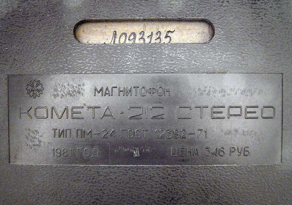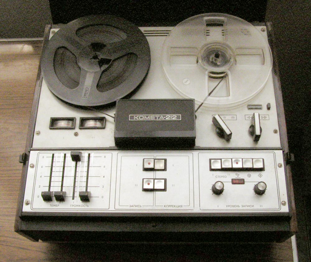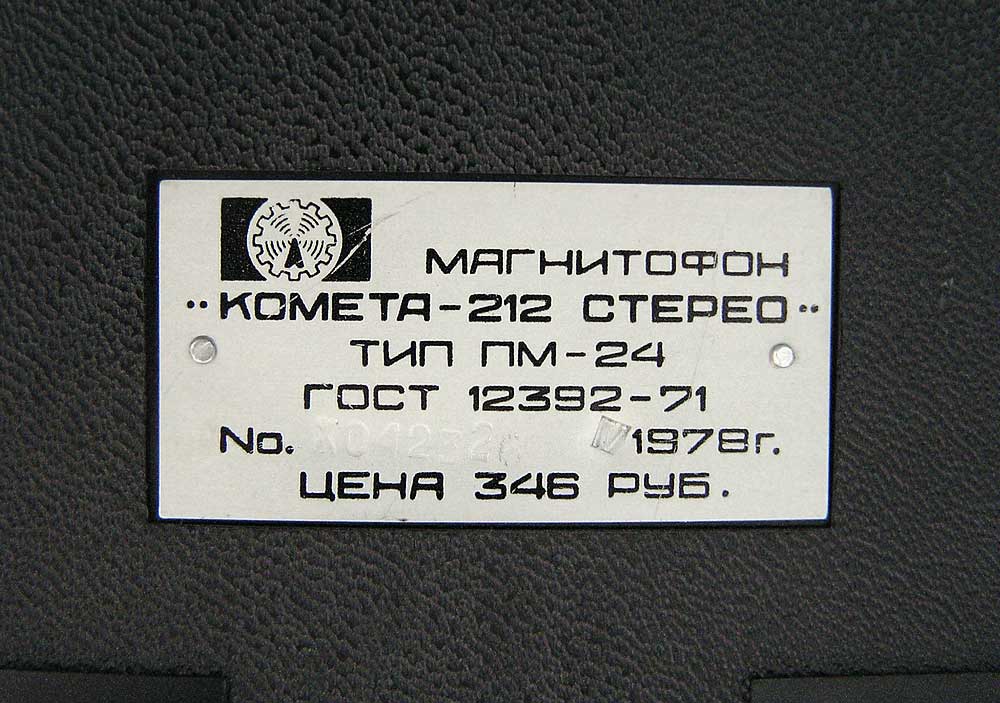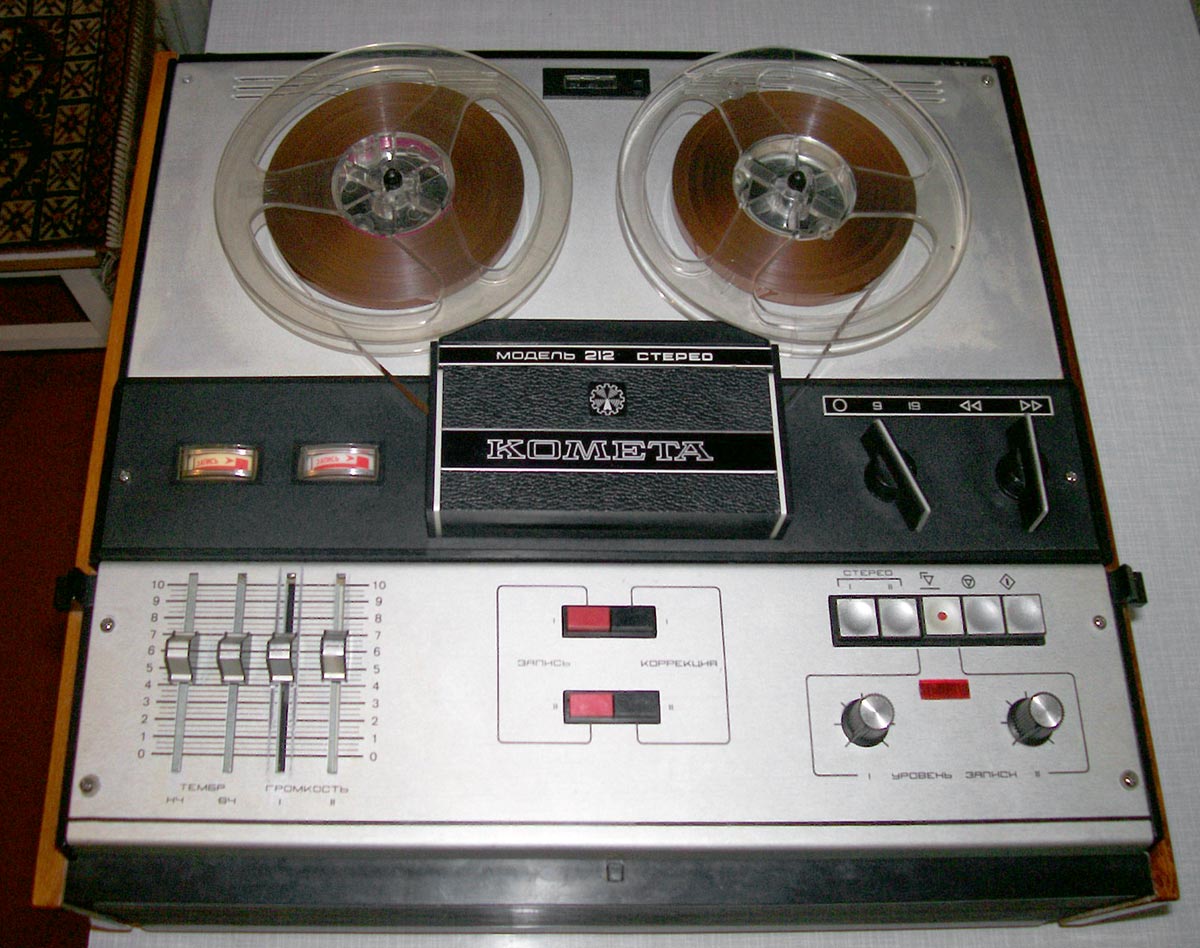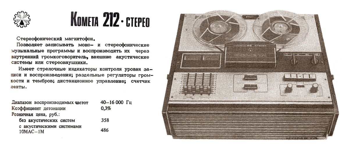 Катушечный магнитофон *Комета-212-стерео* с октября 1976 года выпускал Новосибирский завод *ТочМаш*. Магнитофон служит для записи на магнитную ленту звуковых фонограмм и их последующее воспроизведение через встроенные громкоговорители в монофоническом режиме или через выносные АС в монофоническом или стереофоническом режиме. ЛПМ двухмоторный, имеет скорости: 19,05 и 9,53 см/сек. Полоса записываемых и воспроизводимых частот 40...18000 Гц и 63...12500 Гц соответственно. Номинальная выходная мощность на свою АС - 3, внешнюю 12 Вт. Потребляемая мощность 50 Вт. Коэффициент детонации 0,16 и 0,3%. Габариты аппарата 405х372х170 мм. Масса 12,5 кг. В процессе производства было несколько модернизаций эл. схемы и оформления.