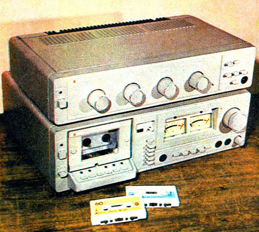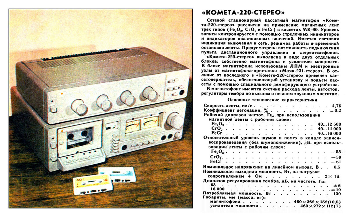 Стационарный кассетный магнитофон *Комета-220-стерео* с 1983 года подготовил к выпуску Новосибирский завод ТочМаш. Он рассчитан на применение магнитных лент трёх типов в кассетах МК-60. Уровень записи контролируется стрелочными индикаторами и индикаторами квазипиковых значений. Имеется световая индикация включения, режимов работы и временной остановки ленты, возможность подключения пульта ДУ и стереотелефонов. Аппарат выполнен в виде двух блоков: магнитофона и усилителя мощности. В нём использованы ЛПМ и электронные узлы от магнитофона-приставки **Маяк-231-стерео**. В отличие от него, здесь применён кассетодержатель обеспечивающий установку и подъем кассеты с помощью специального демпфирующего устройства. В магнитофоне имеются счетчик контроля расхода ленты, автостоп. Есть регуляторы тембра по ВЧ и НЧ. Основные технические характеристики: скорость протяжки ленты 4,76 см/с; коэффициент детонации ±0,2%; рабочий диапазон воспроизводимых частот при использовании ленты Fe 40...12500 Гц, Сг 40...14000 Гц, FeCr 40...16000 Гц; относительный уровень шумов и помех без ШП на ленте Fe -55 дБ, Сг -59 дБ, FeCr -61 дБ; номинальное напряжение на линейном выходе 0,5 В; номинальная выходная мощность на нагрузке 4 Ом 2х10 Вт; диапазон регулирования тембра на частоте 63 Гц - ±6 дБ, 16000 Гц - ±10 дБ. Потребляемая мощность 130 Вт. Габариты магнитофона - 460х362х152 мм, масса 10,5 кг. Габариты УМ - 460х272х112 мм, масса - 7 кг.