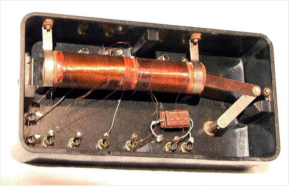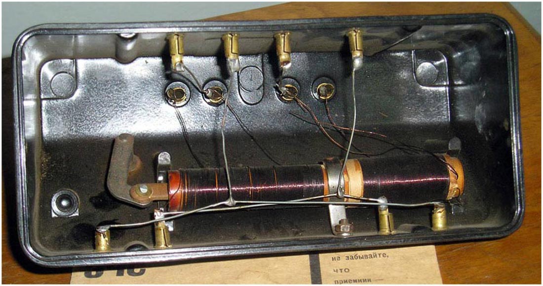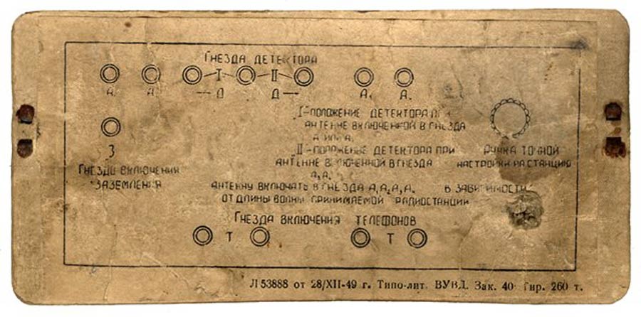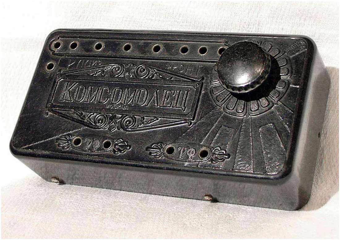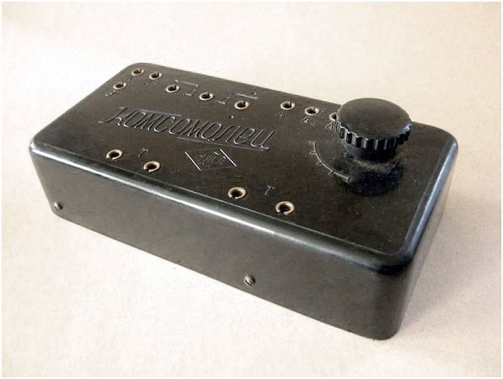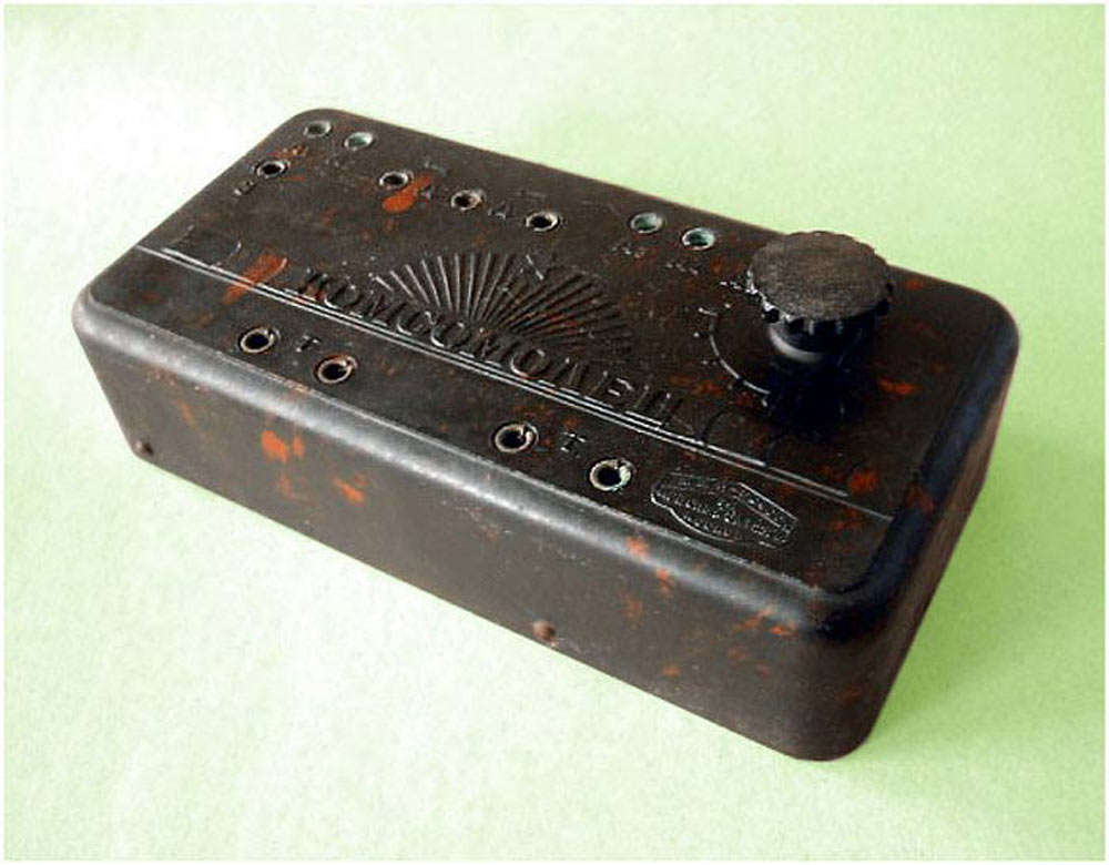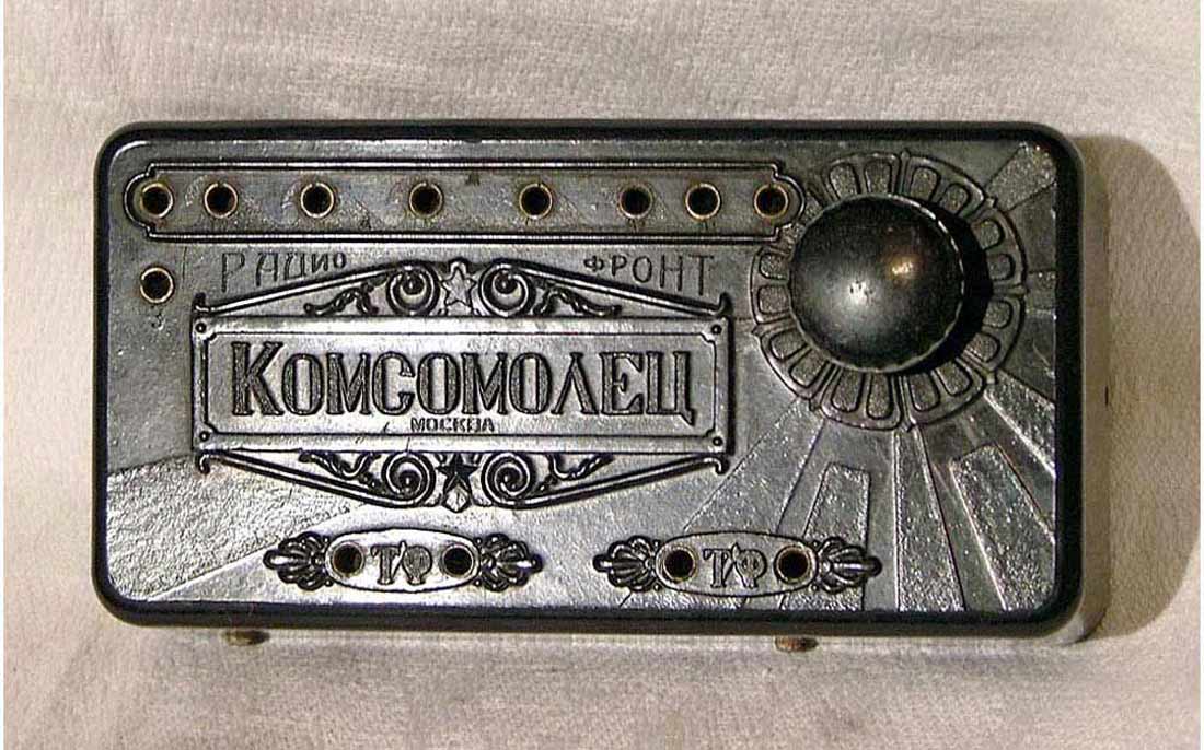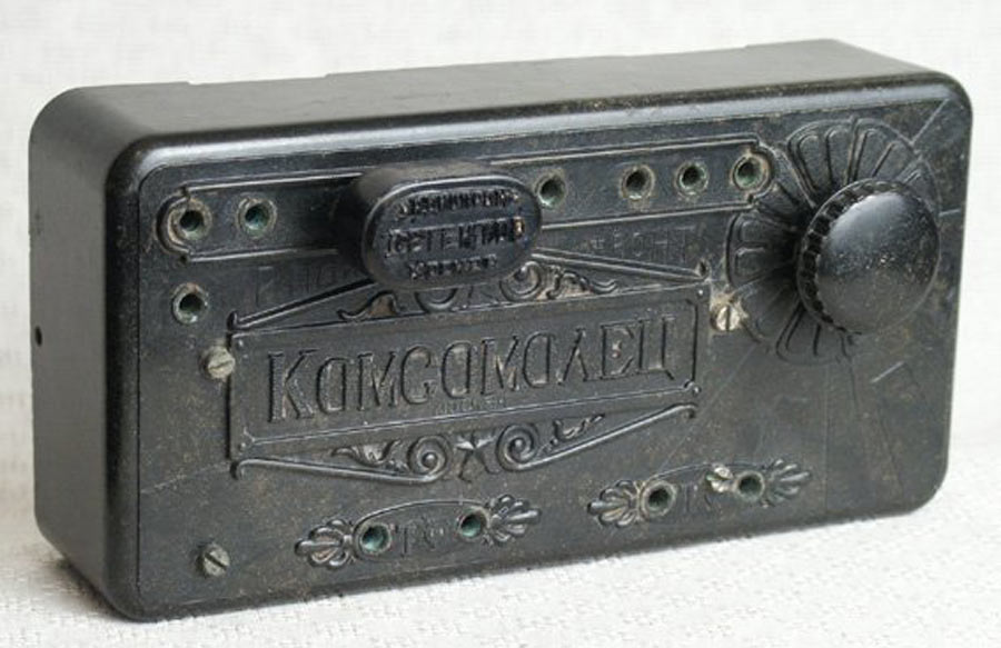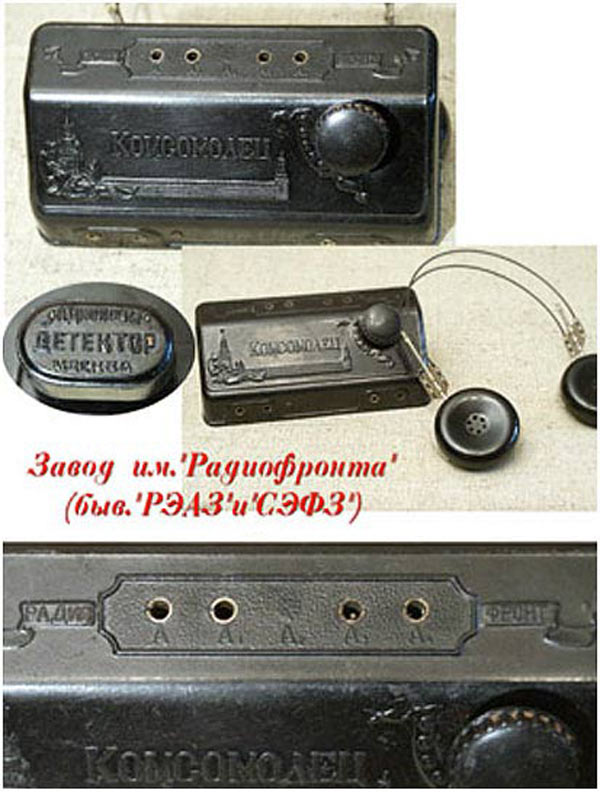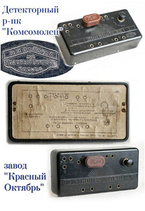 Радиоприёмник детекторный *Комсомолец* с октября 1947 по март 1957 года изготавливали: Молотовский завод *Урал*, Минский радиозавод, Артель *Радиофронт*, Калининградский горпромкомбинат, лаборатория *Радиофронт*, Московский завод *Красный Октябрь*, завод им. Радиофронта и несколько других. Конструктор радиоприёмника - Мурад Рашидович Капланов, хотя в технической литературе указывается имя и отчество как Михаил Романович Капланов - инженер НИИ МПСС. Радиоприёмник **Комсомолец** предназначен для приёма на головные телефоны местных и мощных не особенно отдаленных вещательных радиостанций, работающих в диапазонах длинных в средних волн от 2000 до 250 м. В контурных катушках приёмника находится передвижной альсиферовый сердечник для осуществления плавкой настройки приёмника. Рекомендуемая антенна: наружная, с общей длиной 40-50 м и высотой подвеса не менее 10...16 м. Антенный провод, подходящий к приёмнику, заделывается в однополюсную вилку, вставляемую в гнёзда А-1, А-2, А-3, А-4 или А-5 в зависимости от длины волны принимаемой радиостанции. В качестве заземления используется металлический лист размером 60х60 см и более, закопанный в землю на глубину от 1 м. Провод от заземления заделывается в однополюсную вилку и эта вилка должна быть вставлена в гнездо 3. Головные телефоны применены пьезоэлектрического или электромагнитного типа. Вилки от головных телефонов вставляются в гнёзда Т. Для предварительной грубой настройки приёмника на радиостанцию, вилку с антенным проводом и детектор вставляют в соответствующие гнёзда верхней панели приёмника. Если вилка с антенным проводом вставлена в гнезда А-1, А-2 то детектор своими вилками должен вставлен в левую пару детекторных гнёзд 1 и 2; если вилка с антенным проводом вставляется в гнезда A-3, А-4 или А-5, то детектор нужно переставлять в правую пару детекторных гнезд 2 и 3. Точная настройка на станцию достигается медленным вращением ручки настройки, связанной с альсиферовым сердечником. При вращении этой ручки можно настроиться на радиостанцию, работающие примерно на следующих волнах: От 2000 до 1100 м, ели вилка с антенным проводом вставлена в гнеэдо А-1, от 1200 до 670 м в А-2, от 800 и до 470 м в А-3, от 570 до 340 м в А-4 и от 350 до 250 м в А-5. Рекомендация справедлива при описанной выше антенне. Для приёма московских радиостанций, работающих на волнах 1724 и 1293 м, вилку с антенным проводом надо вставить в гнездо A-1 и медленно изменять настройку до появления лучшей слышимости в головных телефонах принимаемой станции. Размеры радиоприёмника 180х90х42 мм. Вес без упаковки 350 г. Приёмник выпускали в различных оформлениях футляра. На некоторых фотографиях нижних картонных крышек указаны даты выпуска приёмников, такие как 1939, 1940 годы, что не подтверждено в радиотехнической литературе тех лет.