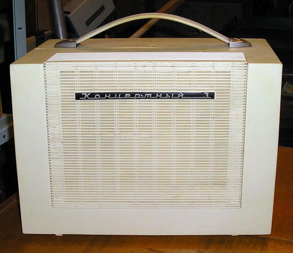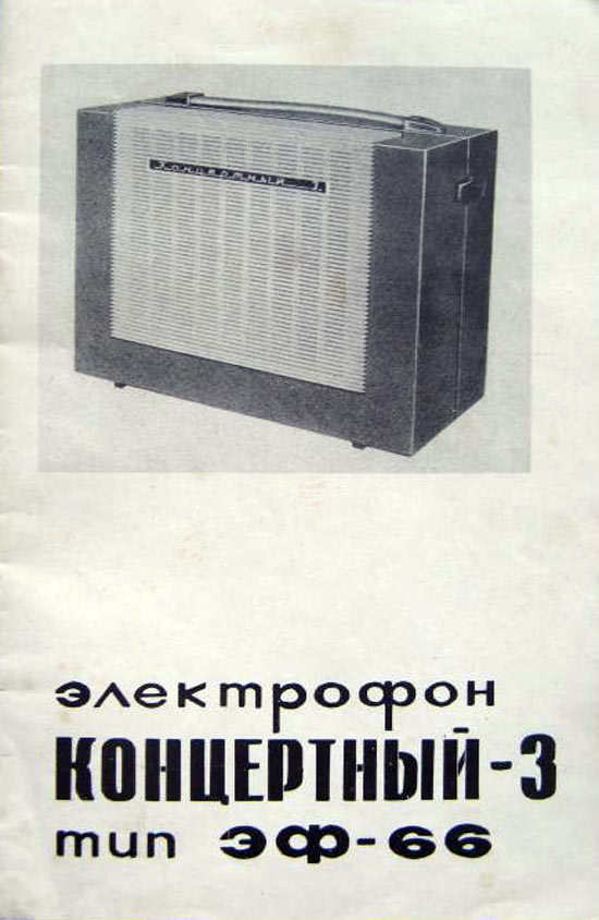 Электрофон сетевой транзисторный *Концертный-3* с начала 1967 года выпускал Московский опытный завод ВНИИ *Электропривод* и Московский завод *Агрегат*. Электрофон **Концертный-3** (тип ЭФ-66) предназначен для проигрывания обычных и долгоиграющих грампластинок на скоростях: 16, 33, 45 и 78 об/мин. АС состоит из двух громкоговорителей 1ГД-28 и может быть отнесена до 1 метра. Номинальная выходная мощность 1, максимальная 3 Вт. Диапазон воспроизводимых частот - 100...10000 Гц. Потребляемая от сети мощность 30 Вт. Масса ЭФ - 7 кг. В течении выпуска электрофон претерпел изменения в своей электрической схеме и конструкции.