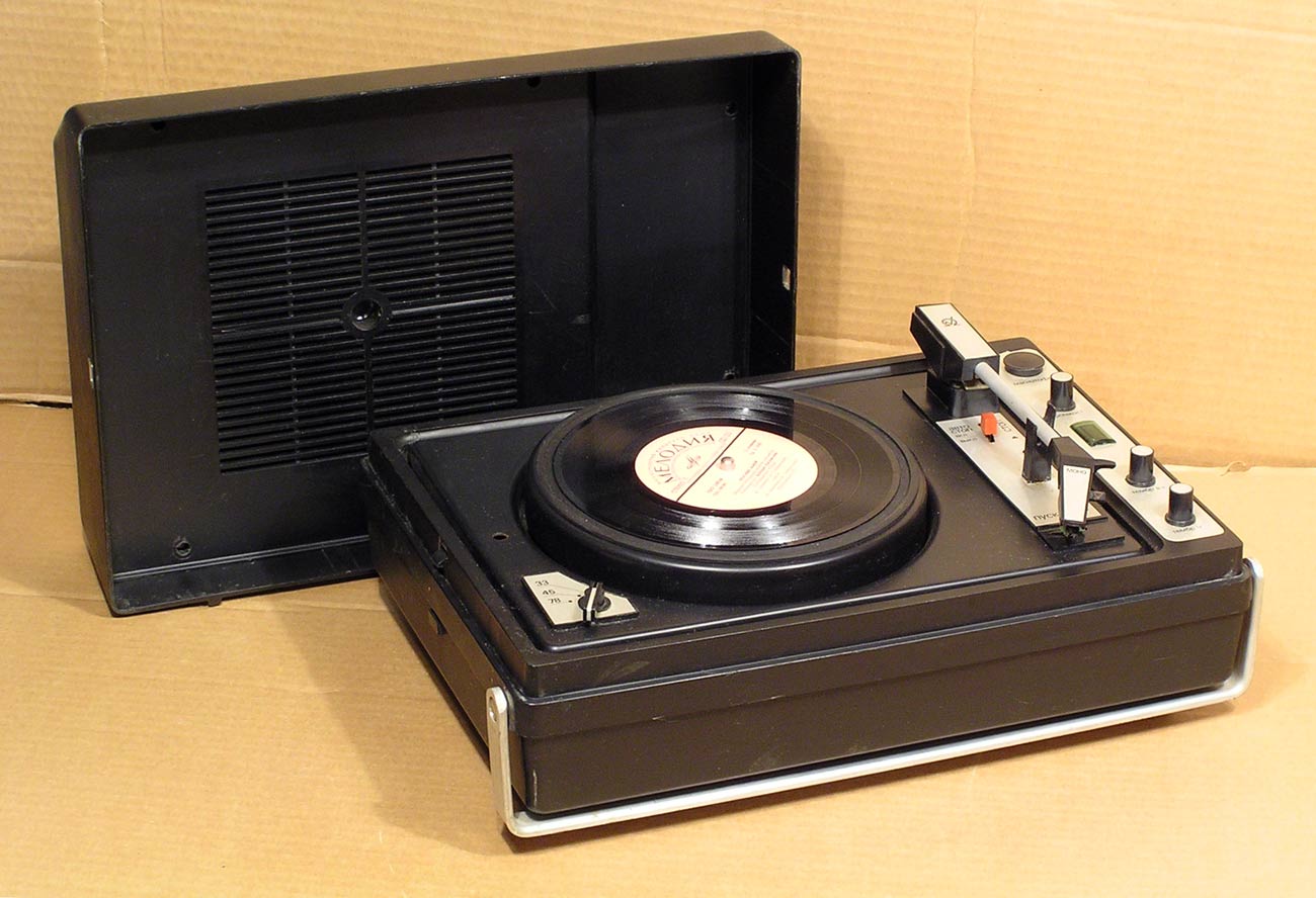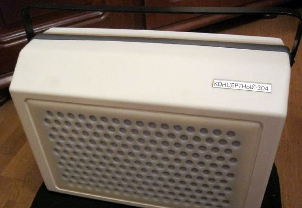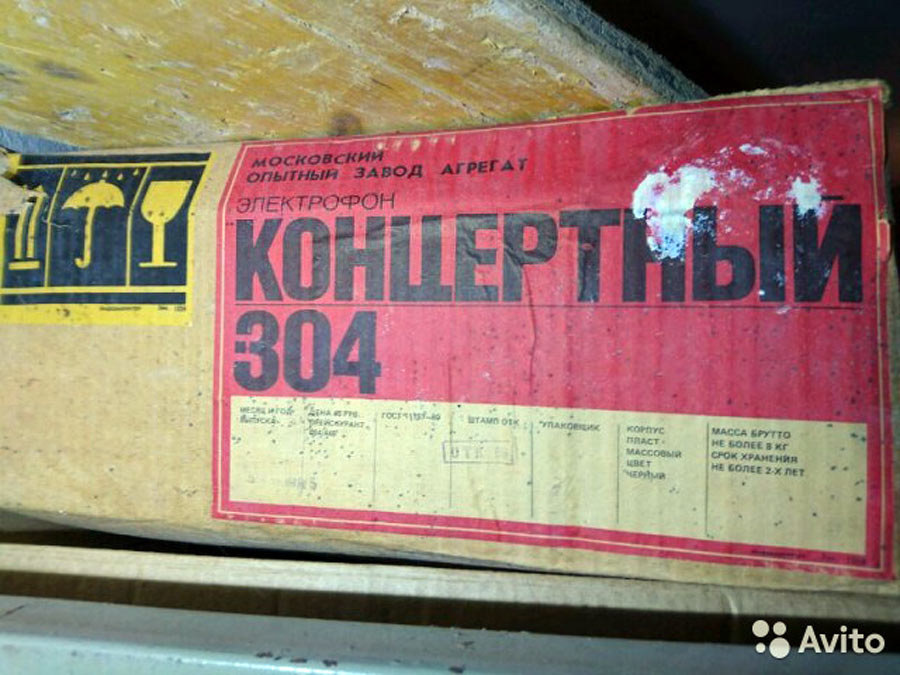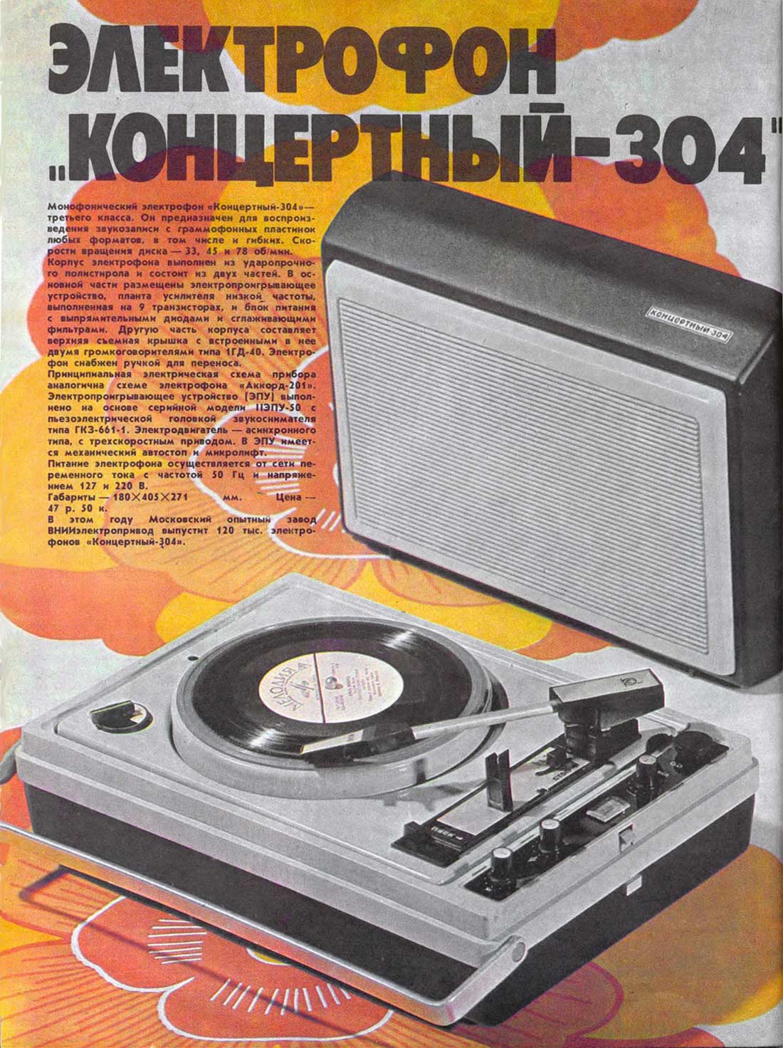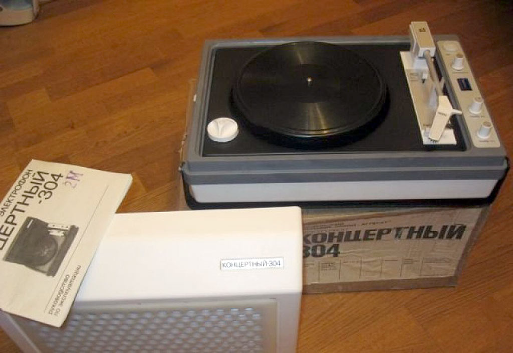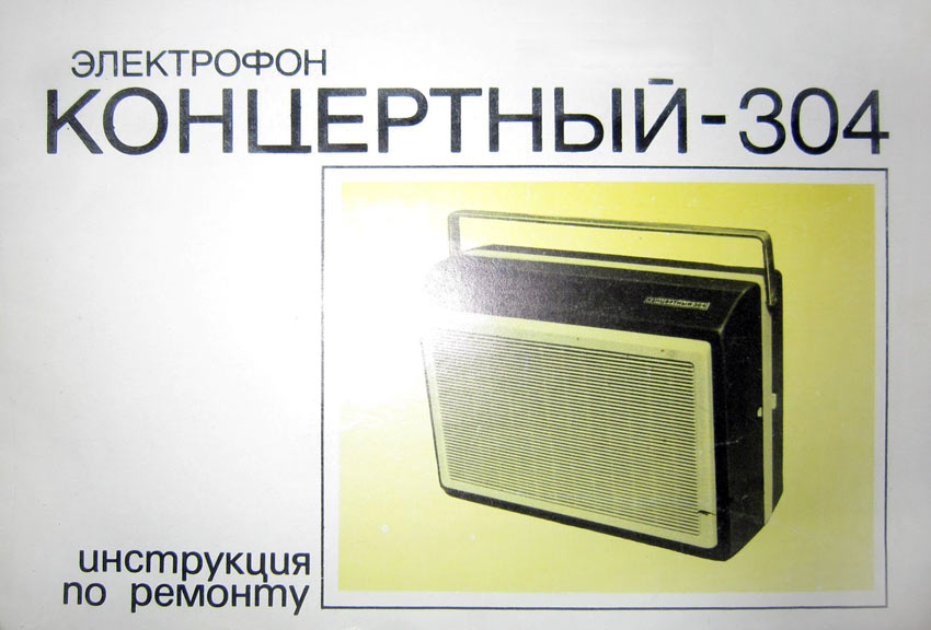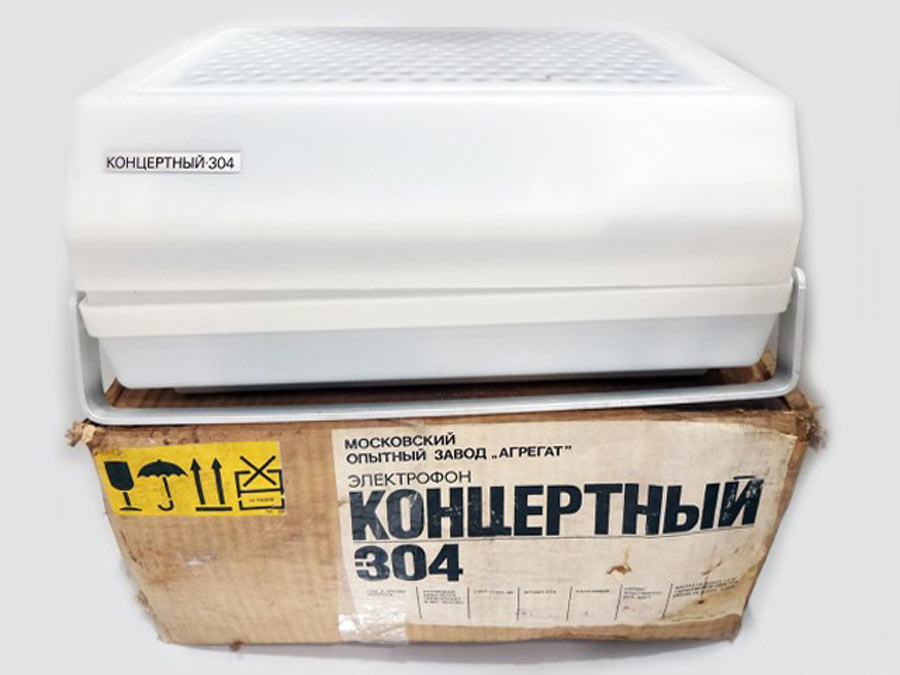 Электрофон *Концертный-304* с 1977 года выпускал Московский опытный завод *Агрегат*.ЭФ предназначен для воспроизведения пластинок на отделяемую АС. В ЭФ установлено трёхскоростное II-ЭПУ-50, имеющее автостоп по окончании проигрывания грампластинки. В АС установлено два громкоговорителя 1ГД-40. Диапазон рабочих частот 100...10000 Гц. Номинальная выходная мощность 1,5 Вт, максимальная 3 Вт. Усилитель НЧ собран на девяти транзисторах (микросхеме и транзисторе). Потребляемая мощность 20 Вт. Габариты ЭФ с АС - 410х275х185 мм. Вес 7,5 кг.