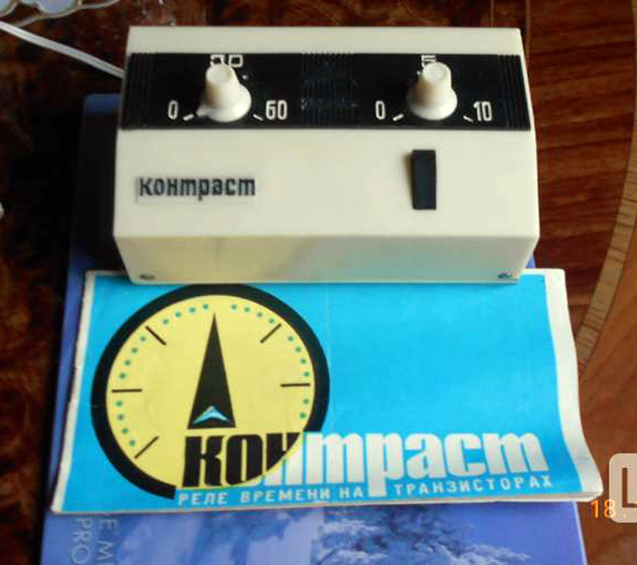 Реле времени на транзисторах *Контраст* предположительно с 1972 года выпускалось Тушинским машиностроительным заводом. Реле времени *Контраст* предназначено для полуавтоматического определения выдержек (времени горения ламп в сек.) при контактной или проекционной печати.
