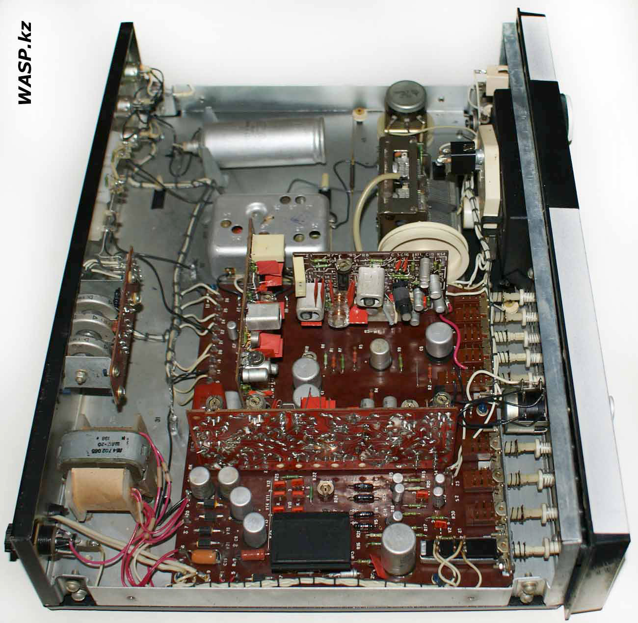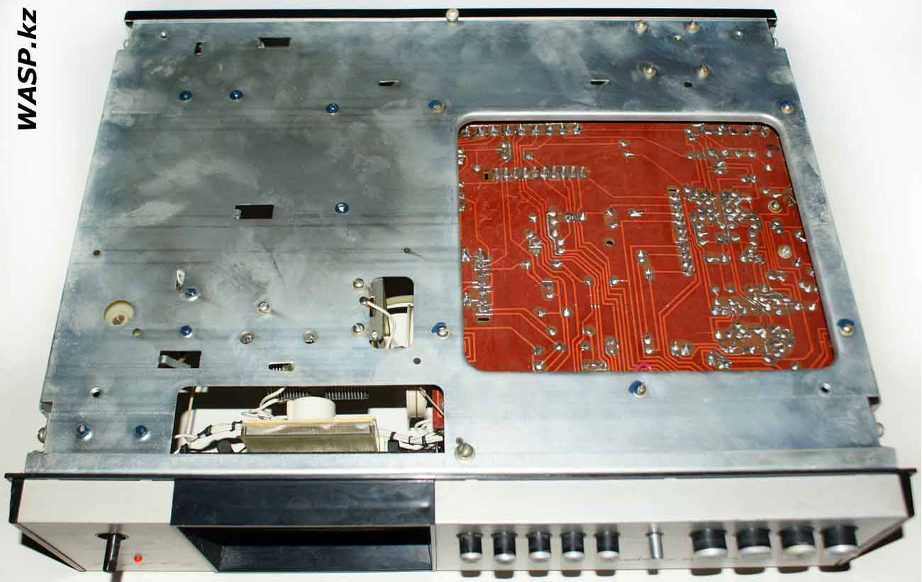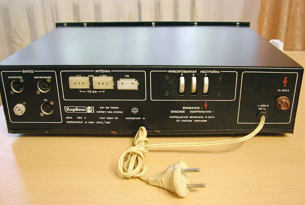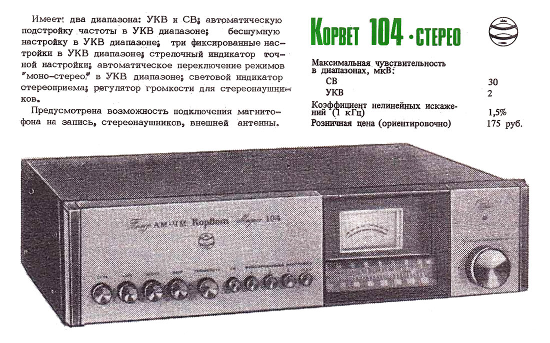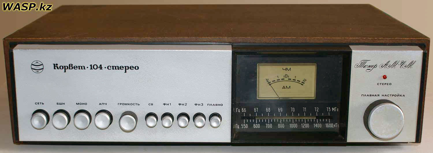 Стационарный транзисторный тюнер *Корвет-104-стерео* с 1982 года выпускал Таганрогский завод *Прибой*. Тюнер собран на 42 транзисторах и 5 интегральных микросхемах. В тюнере применён стереодекодер с временным разделением каналов, предусмотрена индикация точной настройки и наличия стереосигнала. Приём производится в диапазонах УКВ и СВ. В диапазоне УКВ возможен приём моно и стереофонических передач. В УКВ тракте имеется возможность включения БШН, имеется АПЧ и фиксированная настройка на три заранее выбранные станции. Переключение тюнера на стереофонический приём с индикацией происходит автоматически при приёме стереопередач. О точности настройки можно судить по стрелочному индикатору. Прослушивать радиопередачи можно на стереофонические телефоны или громкоговорители через внешний стереоусилитель НЧ с АС. Высокие параметры тюнера позволяют использовать его с высококачественными УКУ. Диапазон частот: СВ 525...1605 кГц и УКВ 65,8...73 МГц. Чувствительность в диапазоне: СВ 100 мкВ, УКВ 3 мкВ. Селективность в диапазоне СВ - 36 дБ, УКВ - 46 дБ. Переходное затухание между каналами 27 дБ. Частотная характеристика тюнера по звуку в диапазоне: УКВ стерео 50...15000 Гц, УКВ моно 31,5...16000 Гц, СВ 125...3550 Гц. Потребляемая мощность 7 Вт. Габариты тюнера 405х325х110 мм. Масса 5 кг. Тюнер разработан в 1980 году.