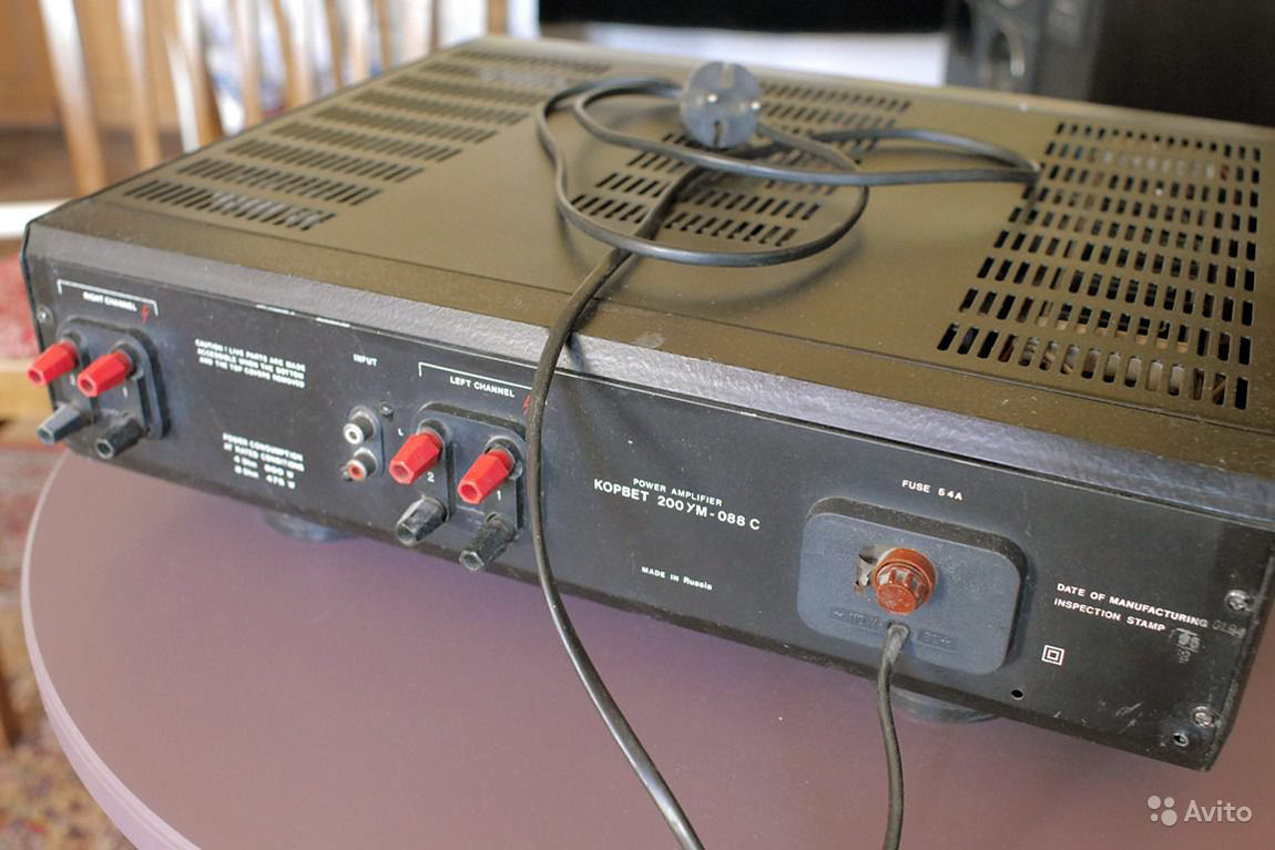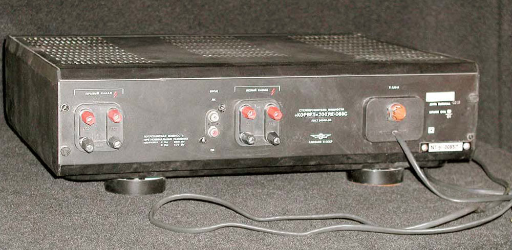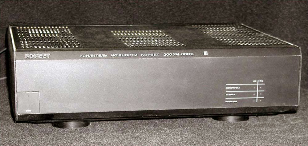 Усилитель мощности *Корвет 200УМ-088С* с 4-кв 1990 года выпускал Кировский завод *Ладога*. Стереоусилитель мощности предназначен для усиления электрической мощности сигналов звуковой частоты. Особенности модели - предельно низкие собственные шумы и искажения, большой запас мощности, работа с любой нагрузкой. Вместе с усилителем рекомендуется применять АС **Корвет 75АС-001** или аналогичные; предварительный стереоусилитель **Корвет УП-078С** или другой высшей группы сложности. Усилитель имеет следующие удобства: концентрические гнёзда входа для подключения предусилителя или эквалайзера, исключающие взаимосвязь каналов; клеммы для подключения двух комплектов АС; световые индикаторы включения питания, перегрузки выхода, срабатывания устройств защиты; защиту выходов от короткого замыкания; защиту АС от постоянного напряжения (тока) при неисправности; защиту выходных транзисторов от перегрева. Основные параметры: Выходная мощность каждого канала: долговременная ограниченная общими гармоническими искажениями 1% не менее 180 Вт. Потребляемая мощность 200...500 Вт. Эффективный диапазон рабочих частот 20...20000 Гц. Неравномерность частотной характеристики 0,3 дБ. Отношение сигнал/фон 110 дБ. Уровень акустического шума 20 дБ. Полное входное сопротивление 47 кОм. Габаритные размеры модели 430х375х130 мм. Масса 13 кг.