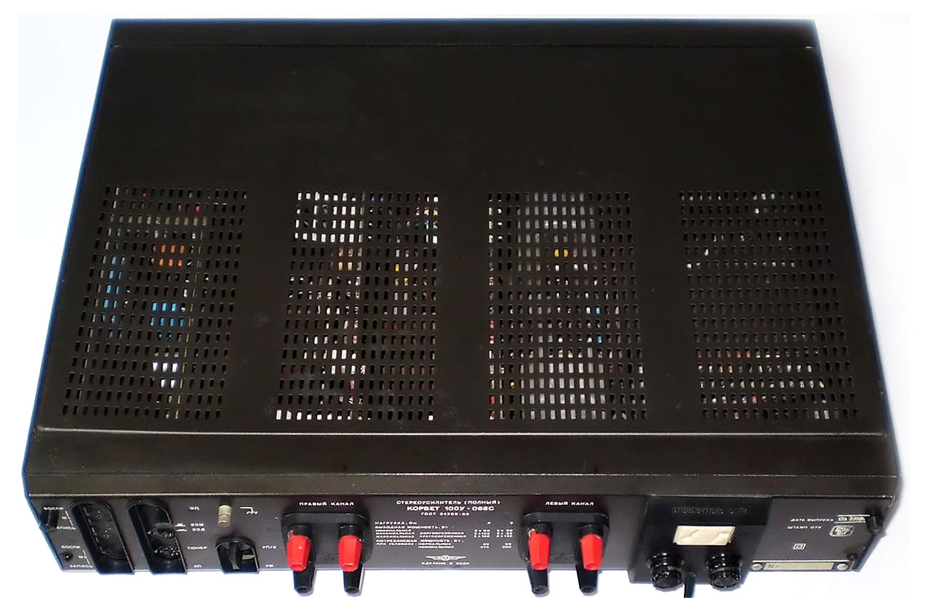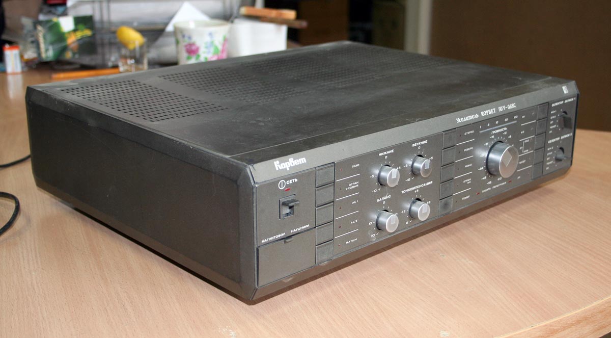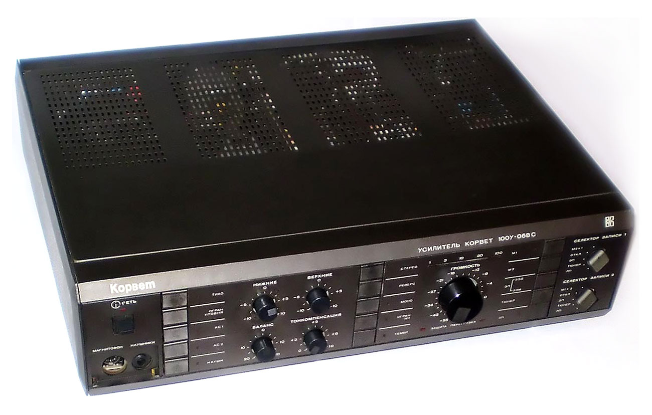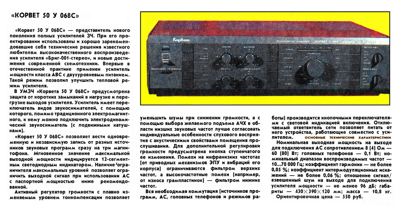 Полный усилитель *Корвет 50У-068С* с 1987 года выпускал АООТ Кировский завод *Ладога*. **Корвет 50-У-068С** это представитель нового поколения полных усилителей. В его создании использованы технические решения усилителя **Бриг-001-стерео**. Впервые здесь применён усилитель мощности класса ЛВС с двухуровневым питанием, что позволило улучшить тепловой режим усилителя. В УМЗЧ имеется защита от КЗ в нагрузке или при перегрузке. Есть переключатель звукоснимателей, с помощью которого кроме электромагнитного можно подключить и электродинамический. Значение максимальной мощности индицируется индикатором. Ограничитель уровня сигнала уменьшает сигнал при использовании АС с мощностью ниже рекомендованной. Регулятор громкости с изменяемой тонкомпенсацией позволяет уменьшить шумы при снижении уровня громкости, а выбор АЧХ в области НЧ согласовывает особенности слухового восприятия с акустическими свойствами помещения. Помехи на инфранизких частотах с ЭПУ ограничиваются фильтром НЧ, а помехи от грампластинок фильтром ВЧ. Коммутация программ, АС и головных телефонов производится кнопочными переключателями, со световой индикацией. Отключаемый выход эл. сети позволяет питать аппараты, работающие вместе с усилителем. Номинальная выходная мощность на выходе для АС сопротивлением 8 (4) Ом 60 (80) Вт. Диапазон рабочих частот 10...70000 Гц. Коэффициент гармоник 0,05 %. Коэффициент интермодуляционных искажений 0,06%. Отношение сигнал/взвешенный шум на выходе для УМ 96 дБ. Габариты усилителя - 430х390х120 мм. Вес 10,8 кг. Цена 650 рублей. Первые выпуски усилителей именовались как *Корвет У-068С* и *Корвет 50-068С*. С начала 1989 года завод совместно с описанным усилителем начал выпуск усилителя *Корвет 100У-068С* с номинальной выходной мощностью на выходе для АС сопротивлением 8 (4) Ом - 65 (95) Вт.