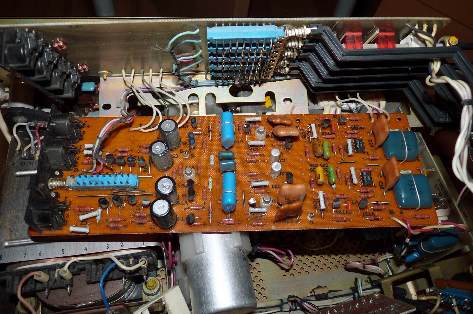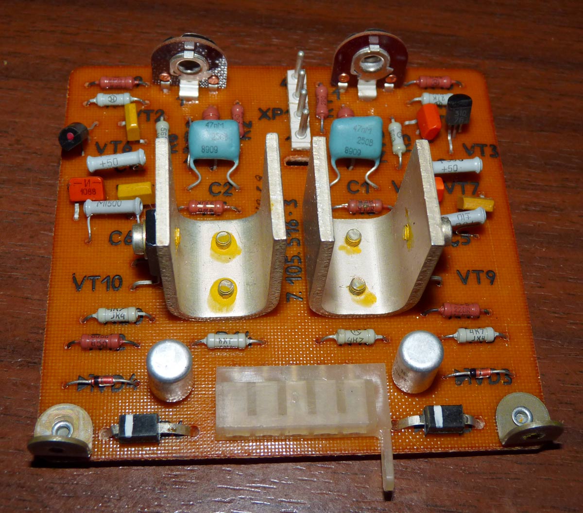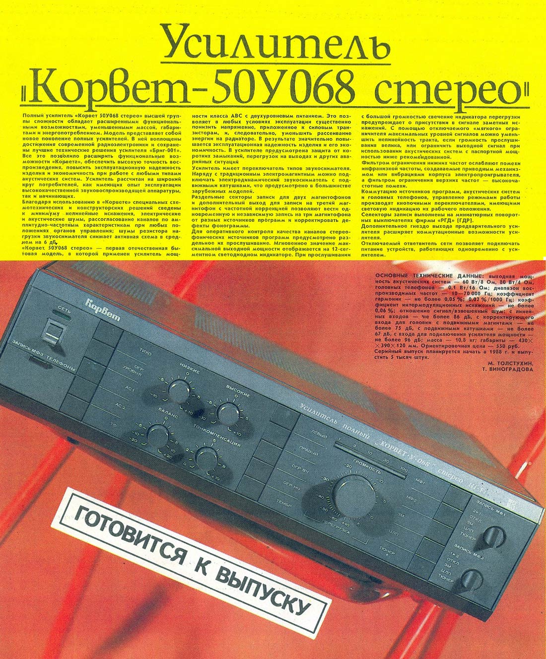 Полный усилитель *Корвет 50У-068С* с 1987 года выпускал АООТ Кировский завод *Ладога*. **Корвет 50-У-068С** это представитель нового поколения полных усилителей. В его создании использованы технические решения усилителя **Бриг-001-стерео**. Впервые здесь применён усилитель мощности класса ЛВС с двухуровневым питанием, что позволило улучшить тепловой режим усилителя. В УМЗЧ имеется защита от КЗ в нагрузке или при перегрузке. Есть переключатель звукоснимателей, с помощью которого кроме электромагнитного можно подключить и электродинамический. Значение максимальной мощности индицируется индикатором. Ограничитель уровня сигнала уменьшает сигнал при использовании АС с мощностью ниже рекомендованной. Регулятор громкости с изменяемой тонкомпенсацией позволяет уменьшить шумы при снижении уровня громкости, а выбор АЧХ в области НЧ согласовывает особенности слухового восприятия с акустическими свойствами помещения. Помехи на инфранизких частотах с ЭПУ ограничиваются фильтром НЧ, а помехи от грампластинок фильтром ВЧ. Коммутация программ, АС и головных телефонов производится кнопочными переключателями, со световой индикацией. Отключаемый выход эл. сети позволяет питать аппараты, работающие вместе с усилителем. Номинальная выходная мощность на выходе для АС сопротивлением 8 (4) Ом 60 (80) Вт. Диапазон рабочих частот 10...70000 Гц. Коэффициент гармоник 0,05 %. Коэффициент интермодуляционных искажений 0,06%. Отношение сигнал/взвешенный шум на выходе для УМ 96 дБ. Габариты усилителя - 430х390х120 мм. Вес 10,8 кг. Цена 650 рублей. Первые выпуски усилителей именовались как *Корвет У-068С* и *Корвет 50-068С*. С начала 1989 года завод совместно с описанным усилителем начал выпуск усилителя *Корвет 100У-068С* с номинальной выходной мощностью на выходе для АС сопротивлением 8 (4) Ом - 65 (95) Вт.