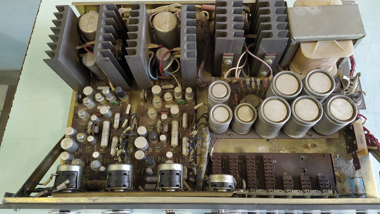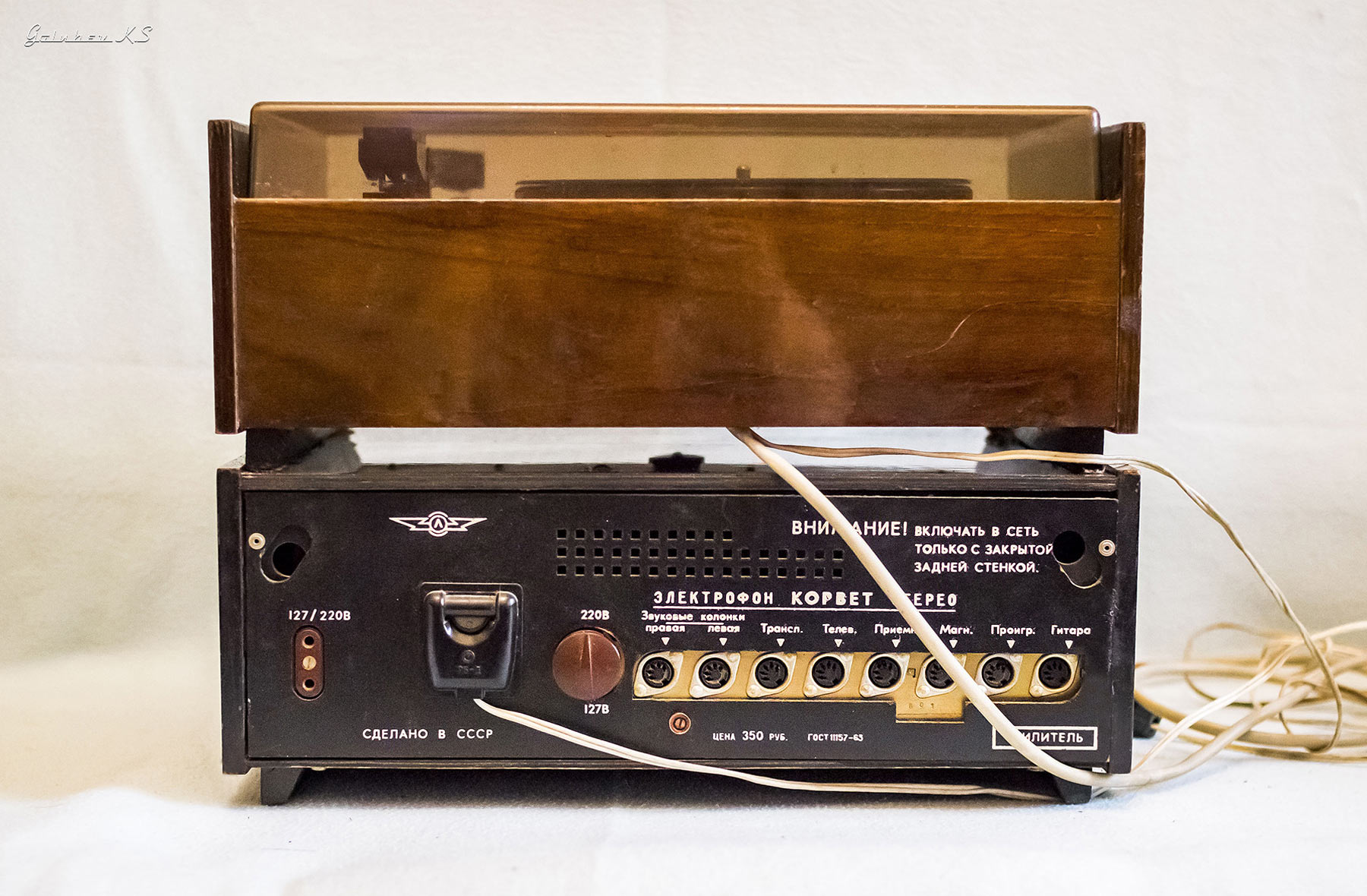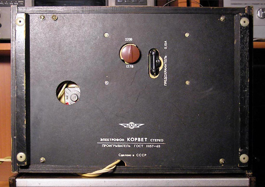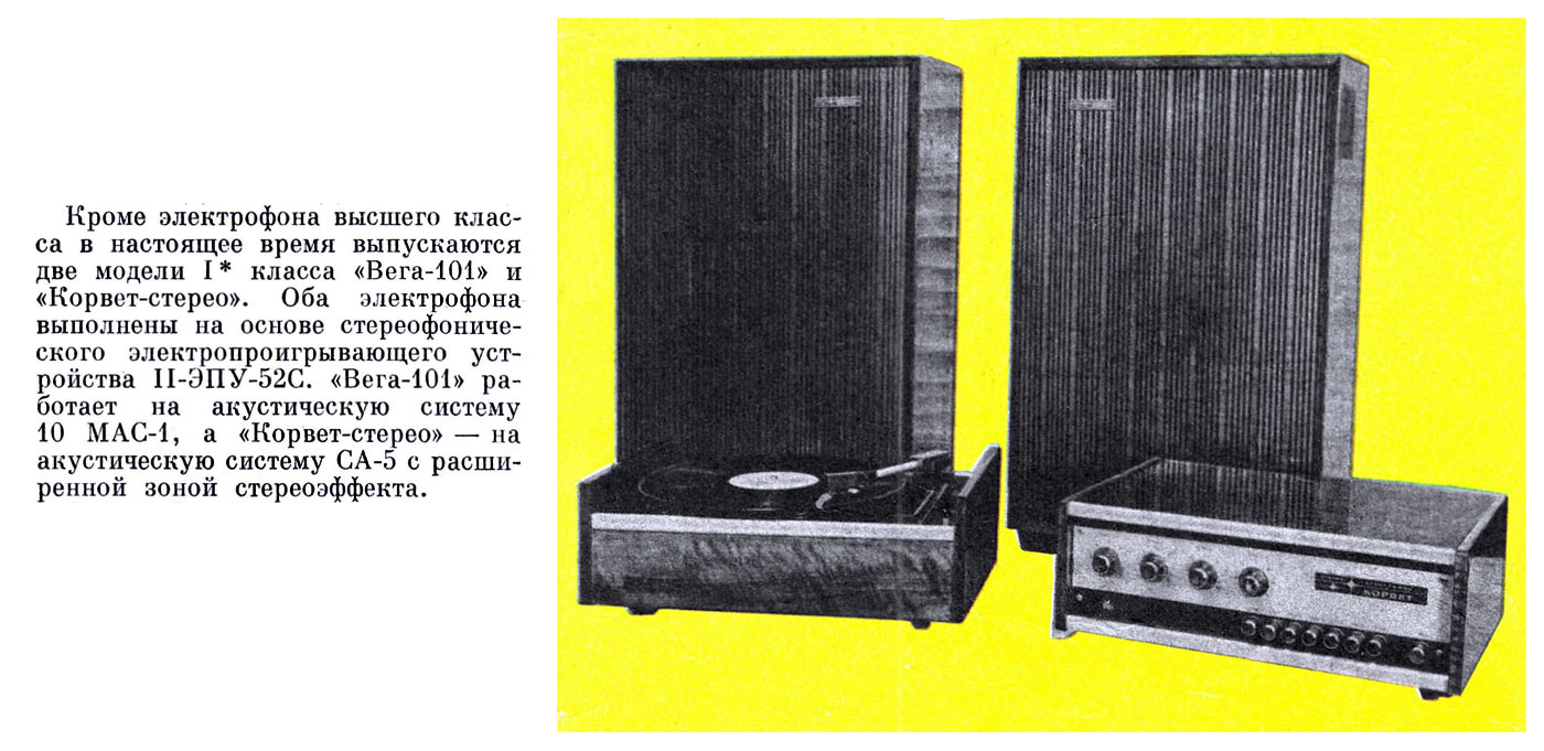 Электрофон сетевой транзисторный *Корвет-Стерео* с 1972 года выпускал Ленинградское ЛПТО *Водтрансприбор*. Блочный стереофонический электрофон 1-го класса **Корвет-стерео** (I-ЭФ-71С) - предназначен для проигрывания моно и стереофонических пластинок. Электрофон состоит из трёхскоростного ЭПУ типа II-ЭПУ-52С, стереофонического усилителя и двух АС. Усилитель выполнен на транзисторах, его максимальная выходная мощность 2х10 Вт, полоса рабочих частот на которую рассчитаны и АС - 80...12000 Гц. АС типа **СА-5** обеспечивают стабилизацию стереоэффекта по площади акустической линзой, создавая направленное излучение при расширенной зоне стереоэффекта. В каждой из АС размещено по четыре громкоговорителя: два типа 4ГД-28 и два типа 1ГД-28. Громкоговорители типа 1ГД-28 расположены в акустической линзе под углом 40°. Электрофон имеет гнёзда для внешних сигналов: это ЭПУ, приёмник, телевизор, трансляционная сеть, электрогитара и др. Питается электрофон от сети, потребляя мощность 60 Вт. Габариты блока электропроигрывателя и усилителя ЗЧ - 400х162х280 мм, каждой из АС - 400х628х228 мм. Вес 5,5, 6,5 и 10 кг соответственно. Электрофон по схемному решению, дизайну и конструкции на 1972 год был одним из самых совершенных электрофонов выпущенных радиопромышленностью. Электрофон выпускали до 1976 года, а электрическая схема с 1973 года выпуска несколько раз модернизировалась. Экспортный вариант модели именовался как *Rigonda-Corvette*.