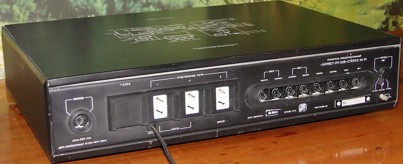 Усилитель предварительный *Корвет УП-028С* с I-кв 1986 года производил Кировский завод *Ладога*. Стереофонический предварительный усилитель **Корвет УП-028С** предназначен для высококачественного усиления, коммутации и частотной коррекции сигналов с проигрывателя c электромагнитной головкой звукоснимателя, проигрывателя компакт-дисков, тюнера, магнитофона и др. Усилитель предварительный имеет низкие собственные шумы и искажения, широкий диапазон усиливаемых частот. Подробнее о параметрах в инструкции по эксплуатации.