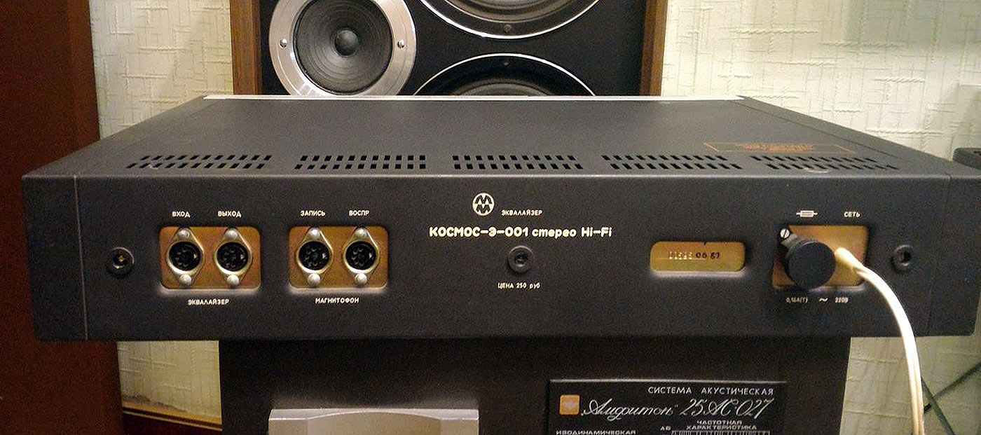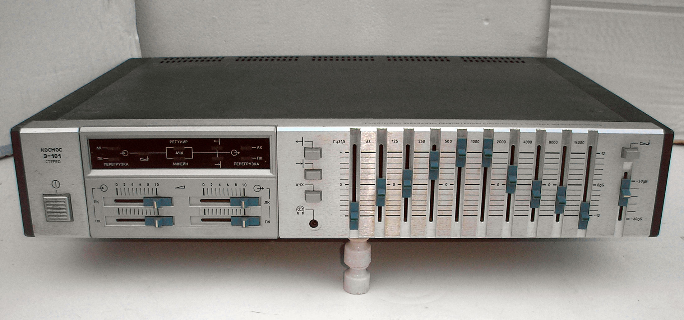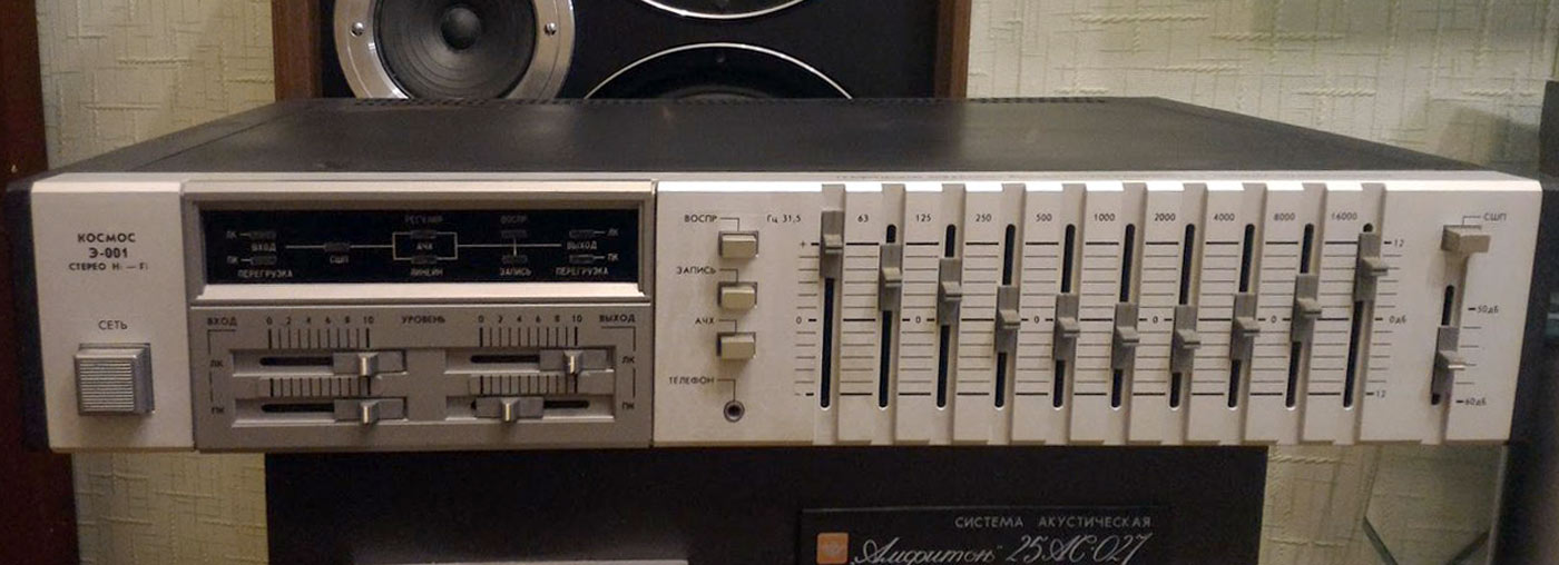 Графические эквалайзеры *Космос-Э-001С* и *Космос Э-101С* с 1988 и 1990 года выпускал Омский завод *Автоматика*. Эквалайзер **Космос-Э-001С** представляет собой десятиполосный регулятор тембра, предназначенный для оперативного управления АЧХ звуковых трактов бытовой аппаратуры с целью компенсации её АЧХ и искажений, вносимых АС и помещением. Эквалайзер рассчитан на работу с тюнерами, электропроигрывателями, магнитофонами и УКУ. Встроенная система шумопонижения позволяет уменьшить шум фонограммы. Регуляторы уровня и индикаторы перегрузки дают возможность избежать перегрузки УМ. Имеется слуховой контроль на стереотелефоны. Диапазон рабочих частот 20...20000 Гц. Коэффициент гармоник 0,04%, интермодуляционных искажений 0,12%. Переходное затухание между каналами -60 дБ. Отношение сигнал/ шум -100 дБ. Число полос - 10. Улучшение отношения сигнал/шум при включенной ШП 10 дБ. Потребляемая мощность 15 Вт. Габариты ЭК 460х335х91 мм. Вес 6 кг. Цена 250 рублей. Выпускаемый с 1990 года эквалайзер *Космос Э-101С*, кроме наименования не отличается от описанного выше эквалайзера *Космос-Э-001С*.