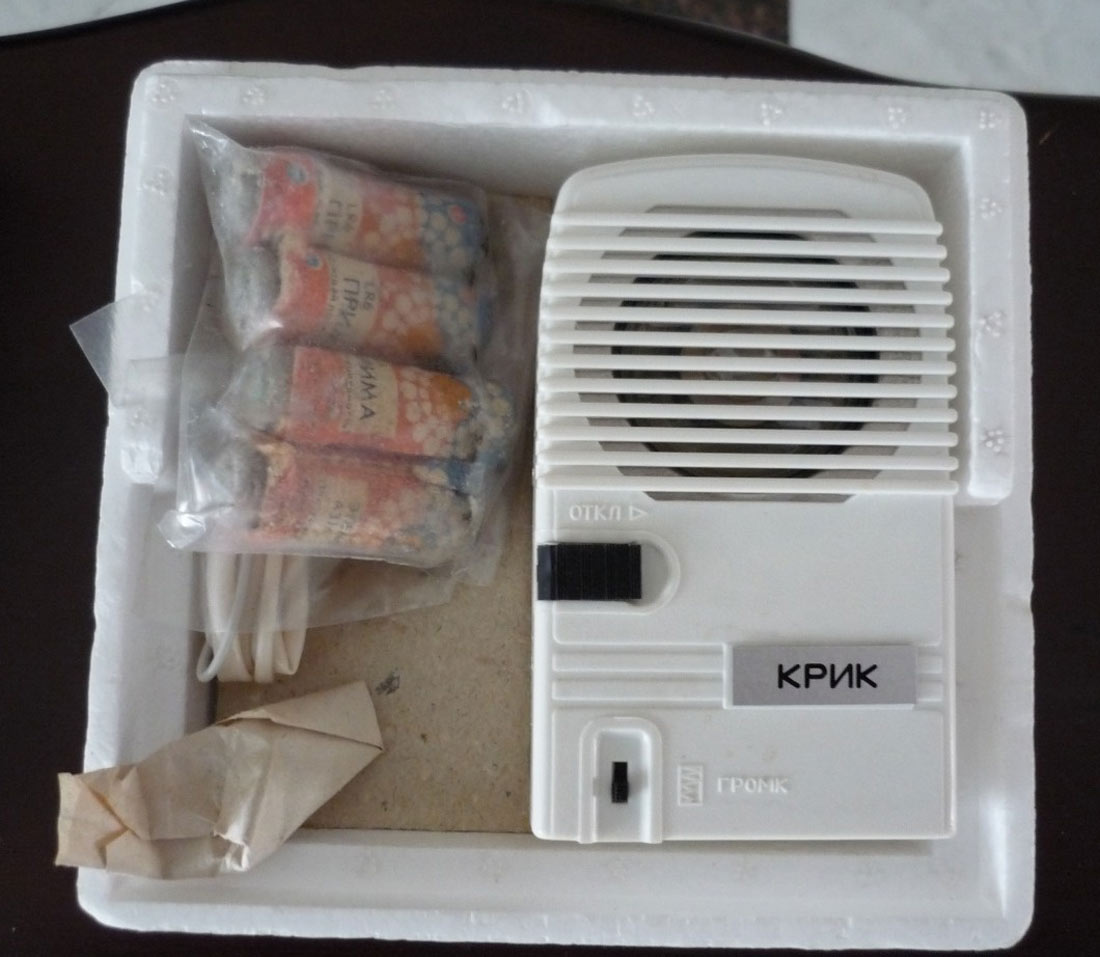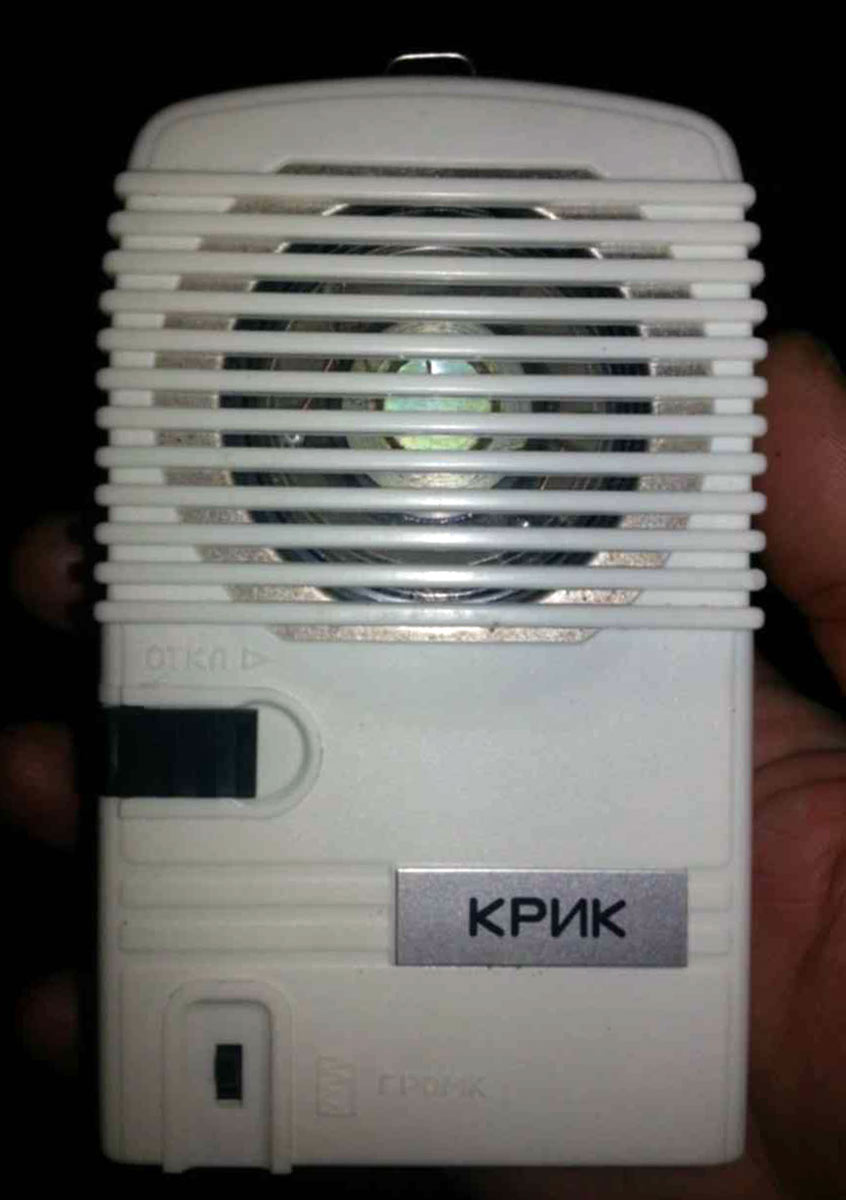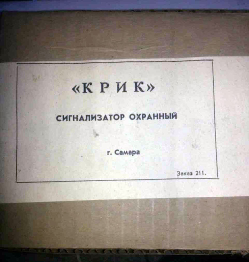 Сигнализатор охранный *Крик* выпускался предположительно с 1987 года Самарским ПО *Завод имени Масленникова*. Сигнализатор служит для выдачи звукового сигнала типа *сирена* при замыкании контактов датчиков, при изменении ориентации сигнализатора или при выдёргивании чеки.