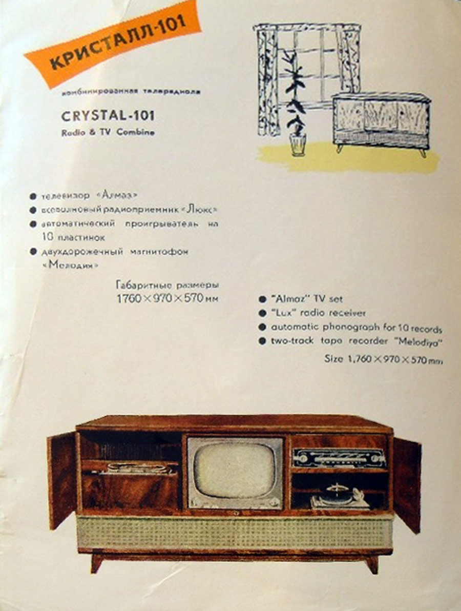 Комбинированная установка *Кристалл-101* в количестве 84 экземпляров была изготовлена на Московском телевизтонном заводе с марта по август 1958 года. Автор разработки Ю.М.Ромадин. Консольная установка **Кристалл-101** объединила в общем футляре телевизор 2 класса **Рубин-102**, с размером изображения 340х450 мм, всеволновый радиоприёмник 1 класса **Люкс**, двухдорожечный реверсивный магнитофон 1 класса **Мелодия МГ-56** и автоматическое универсальное проигрывающее устройство расчитанное на прослушивание 10 грампластинок, c автоматической сменой. Существовал и простой вариант установки, где применено универсальное ЭПУ и магнитофон **МАГ-59**. В установке применено 9 громкоговорителей. Номинальная мощность усилителя 8 Вт. Диапазон частот воспроизводимых АС - 50...14000 Гц. Габариты установки 1450х990х620 мм, масса 67 кг.