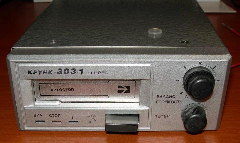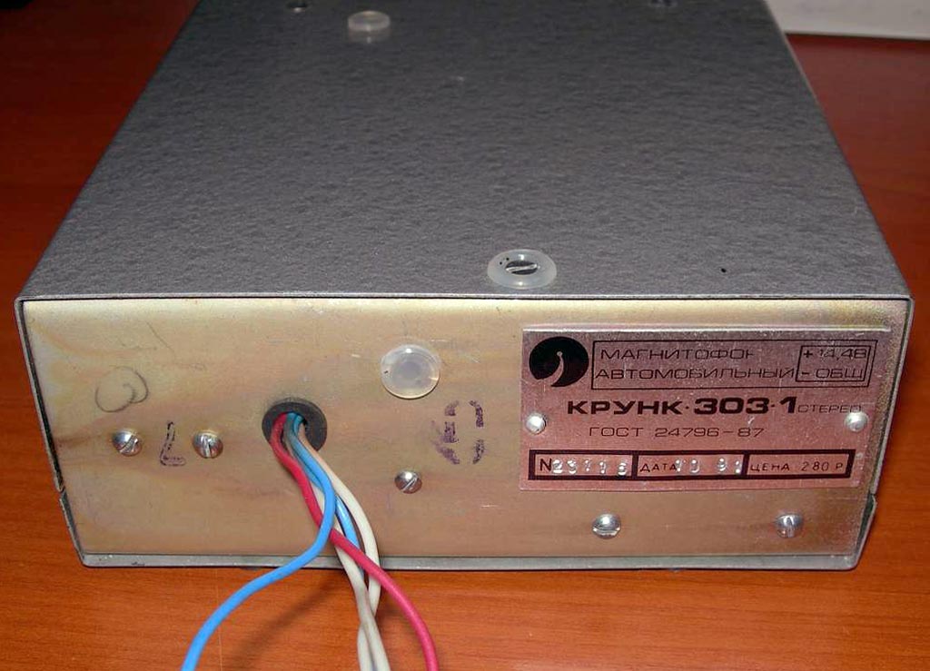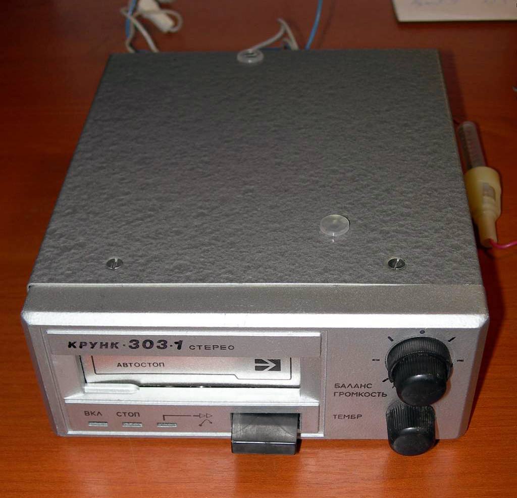 Автомобильный кассетный стереомагнитофон *Крунк-303-стерео* с I-кв 1987 года выпускал Ереванский завод *Гарни*. Автомобильный магнитофон **Крунк-303-стерео** 3-й группы сложности предназнчен для воспроизведения моно и стереофонических фонограмм с компакт-кассет при установке в автомобиле. Выпускаемый с начала 1989 года магнитофон *Крунк-303-1-стерео* кроме немного обновлённого оформления не отличается от базового магнитофона. Основные технические данные магнитофона: Скорость движения ленты 4,76 см/сек. Длительность непрерывного воспро изведения на одной дорожке 30 минут. Длительность перемотки 100 сек. Полоса воспроизводимых звуковых частот 63..10000 Гц. Относительный уровень шумов в канале воспроизведения -46 дБ. Коэффициент детонации 0,4%. Номинальная выходная мощность 2х2, максимальная 2х4 Вт. Питание - бортовая сеть автомобиля. Габариты магнитофона - 170х133х56 мм. АкС 162х75 мм. Масса магнитофона 1,2 кг. Одной АС 1,1 кг. Цена комплекта 280 рублей.