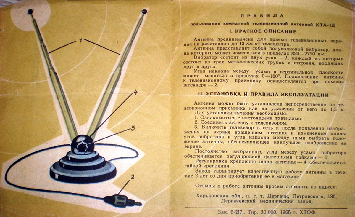 Комнатная телевизионная антенна *КТА-1Д* выпускалась предположительно с 1966 года Дергачёвским механическим заводом. Антенна служит для приёма ТВ в МВ диапазоне.