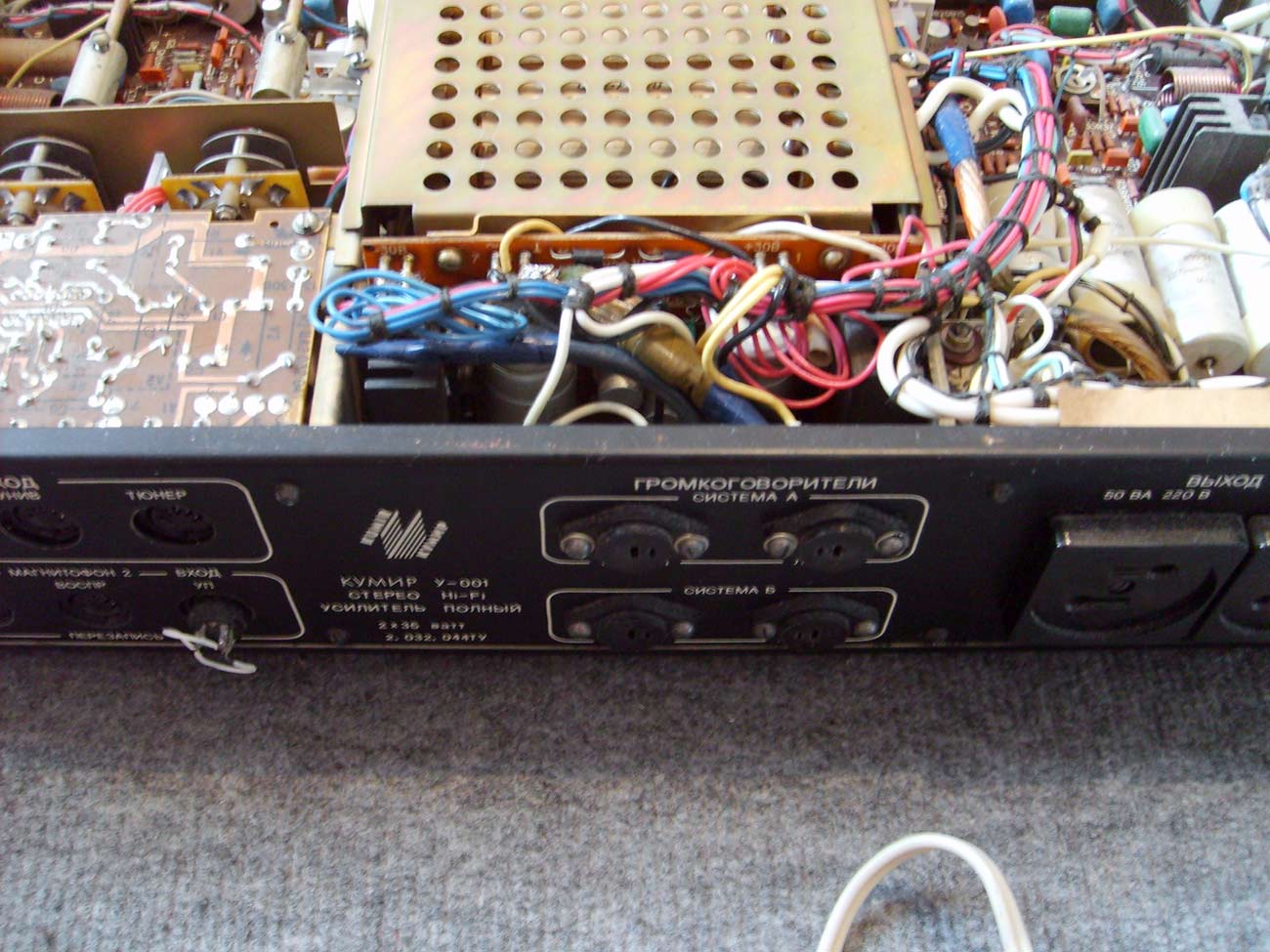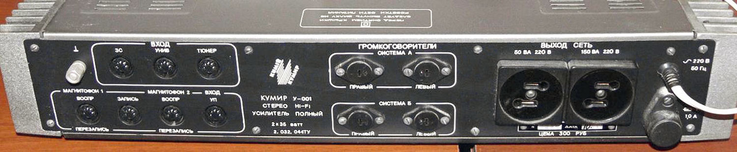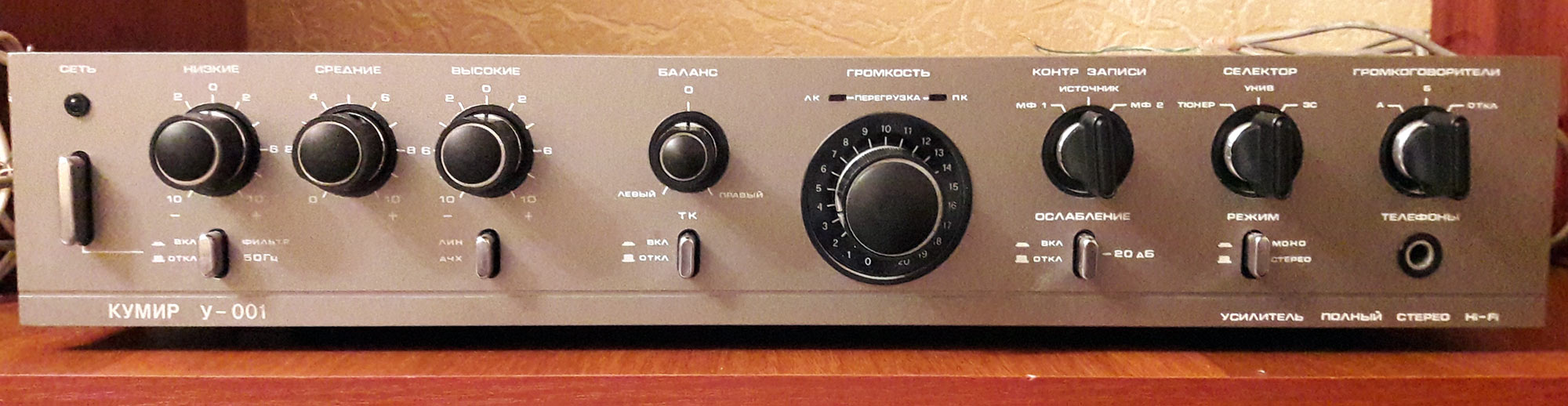Стереофонический полный усилитель *Кумир У-001-стерео* с 1988 года выпускал Ульяновский механический завод. Усилитель **Кумир У-001-стерео** предназначен для усиления и коммутации сигналов от различных источников. В нём предусмотрена регулировка тембра по низшим, средним и высшим частотам, ступенчатое ослабление уровня громкости на 20 дБ, есть отключаемый фильтр инфранизких частот. К усилителю *Кумир У-001-стерео* можно подключить две пары АС и стереотелефонов, два магнитофона работающие в режимах записи и воспроизведения. В каждом канале предусмотрена электронная защита выходных транзисторов от КЗ в нагрузке. На корпусе установлены розетки к которым подключить к сети два аппарата с общей мощностью 200 Вт. Номинальная выходная мощность 2х35 Вт (4Ом). Коэффициент гармоник 0,15%. Диапазон рабочих частот 20...25000 Гц. Переходное затухание между каналами 48 дБ. Габариты усилителя 460х90х360 мм. Его масса 10 кг. Цена 300 рублей.