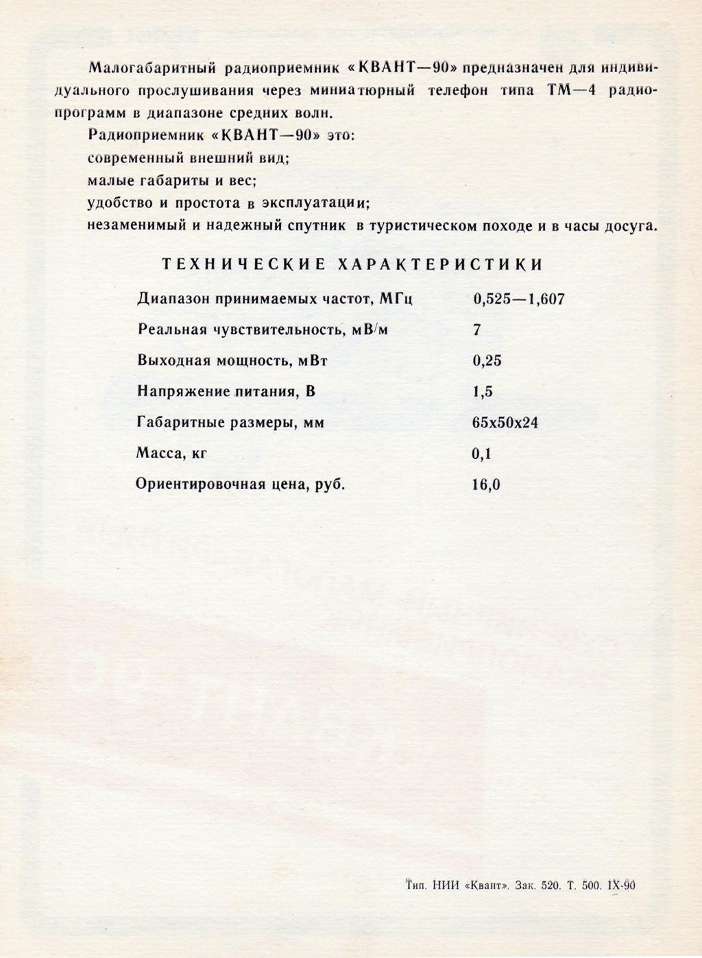 Сувенирный малогабаритный радиоприёмник *Квант-90* подготовлен к выпуску с 1991 года Киевским НПО *Квант*. Подробности в проспекте.