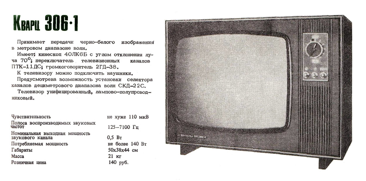 Телевизор *Кварц-306* с 1976 года выпускал Омский телевизионный завод. Унифицированный телевизор **Кварц-306** (УЛПТ-40-III) заменил предыдущую модель, телевизор **Кварц-303**. В модели применён современный кинескоп 40ЛК6Б, а часть радиоламп заменена транзисторами. Выпускали телевизор в настольном оформлении с различными вариантами отделки. Телевизор работает в любом из 12-ти каналов. Органы управления расположены на передней панели. Это ручка гетеродина и ПТК, выключатель сети, громкость, яркость и контрастность. Справа и сбоку на шасси выведены регуляторы линейности по вертикали, размера по вертикали и горизонтали, частоты кадров, строк, а на левую сторону шасси гнёзда для головных телефонов. АРУ делает качественным изображение при изменении уровня сигнала. АПЧ и Ф обеспечивает устойчивость синхронизации при помехах. Сзади аппарат закрыт дюралевой крышкой, с вентиляционными отверстиями. Гнёзда для телефонов можно использовать и для записи звукового сопровождения на магнитофон. АС состоит из громкоговорителя 1ГД-36. Питание от сети 110, 127 или 220 В. Чувствительность ТВ - 100 мкВ. Номинальная выходная мощность 0,5 Вт. Диапазон звуковых частот 125...7000 Гц. Потребляемая мощность 140 Вт. Размеры модели 383х502х438 мм. Масса 22 кг. Телевизор **Кварц-306-1** (УЛПТ-40-III-I) выпускаемый с 1986 года, по оформлению, конструкции и электрической схеме не отличается от телевизора **Кварц-306**, но подешевел. Начиная с 1977 года телевизор **Кварц-306**, как позже и *Кварц-306-1* выпускали рассчитанным на питание от сети только 220 В.