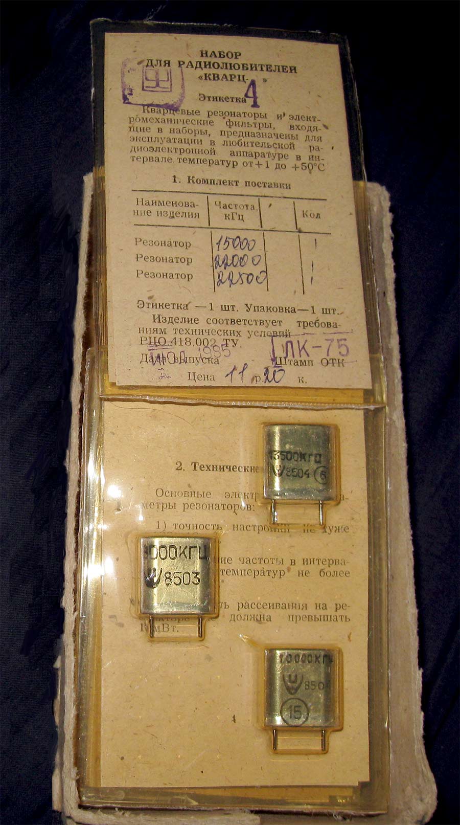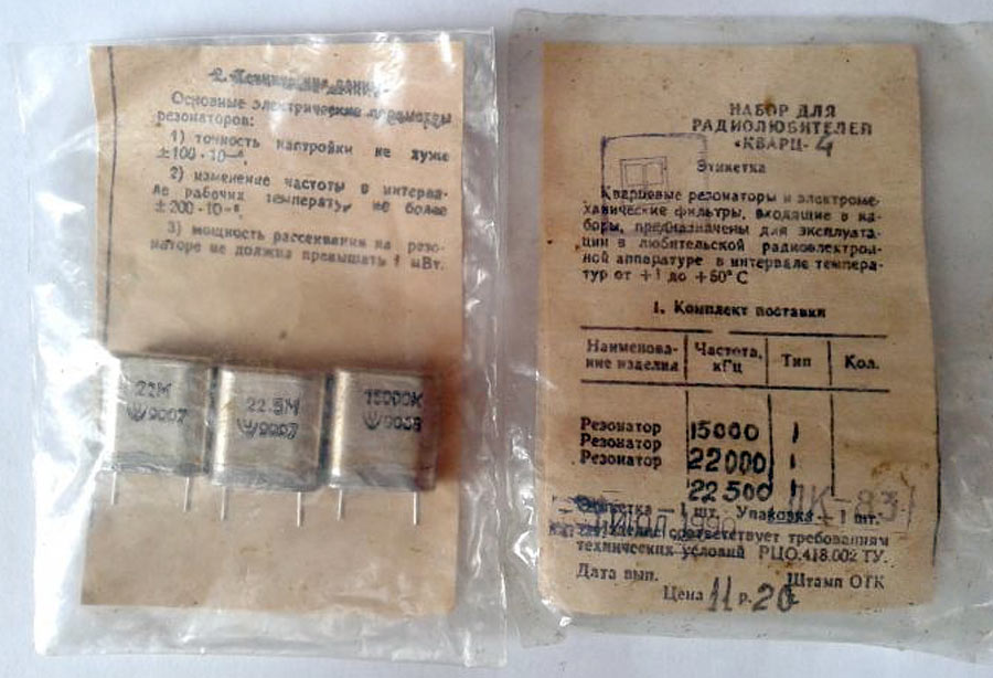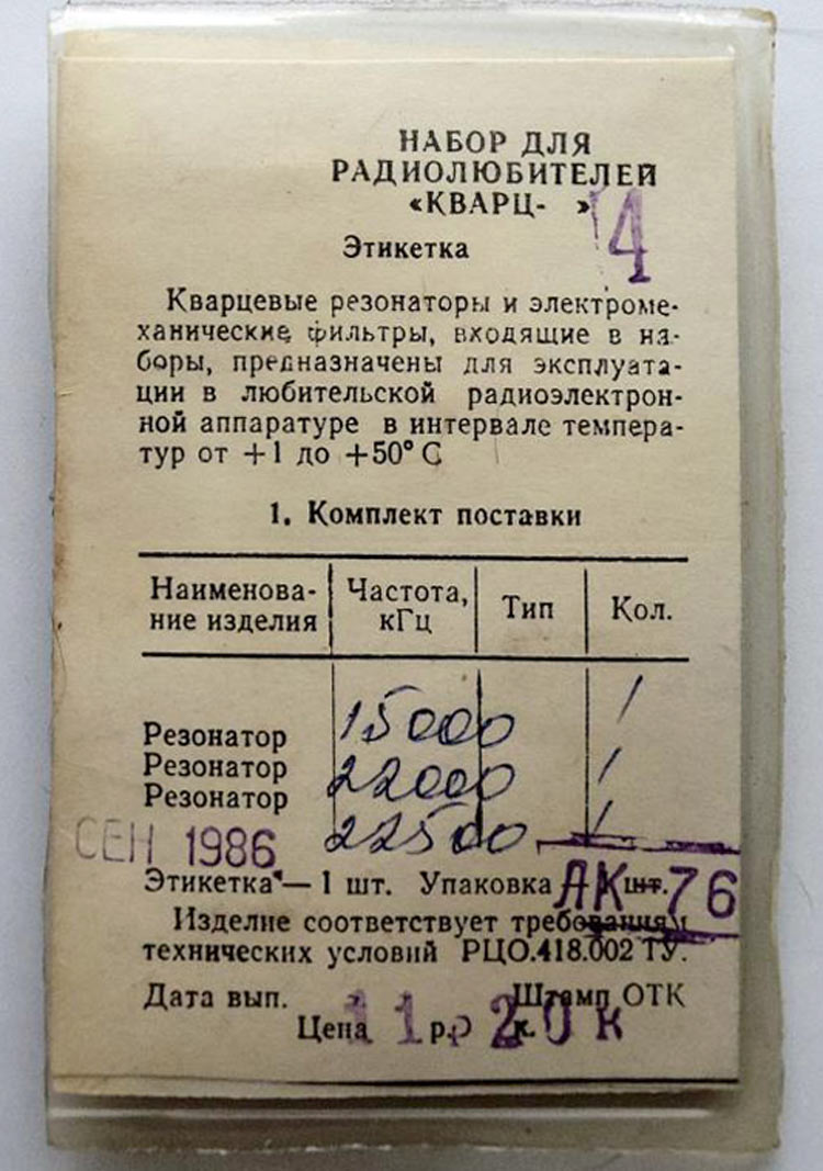 Набор для радиолюбителя *Кварц-4* выпускался предположительно с 1971 года. Набор кварцев (резонаторов) предазначен для применения в любительской приёмо-передающей радиоаппаратуре, в частности в популярном ламповом трансивере UW3DI.