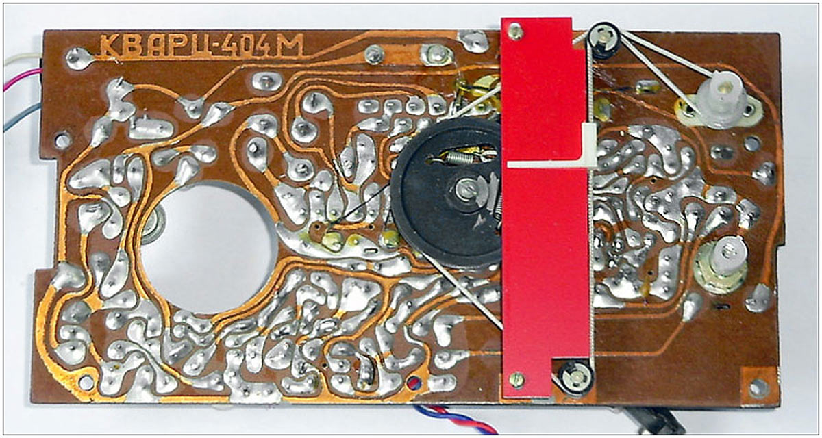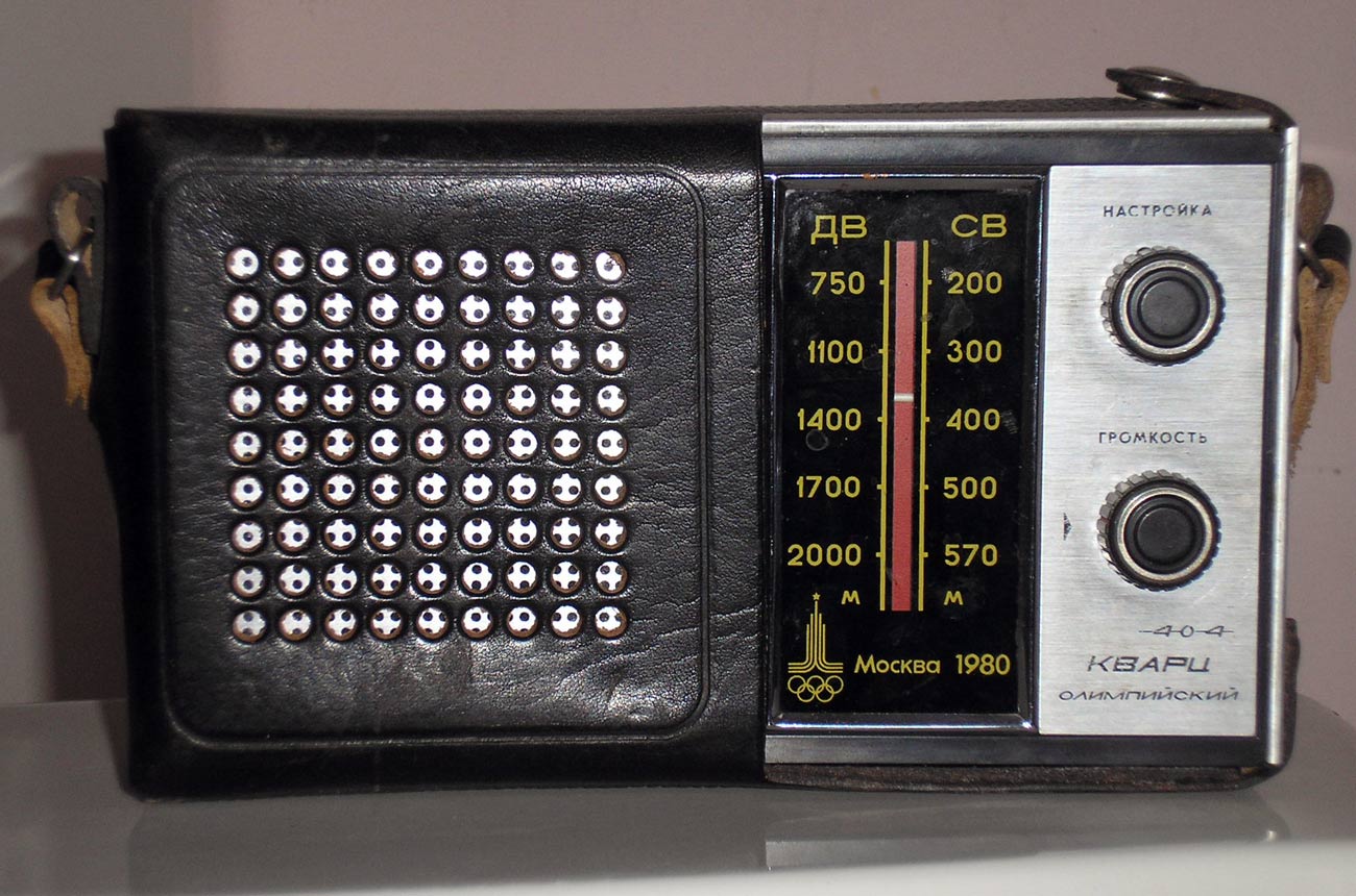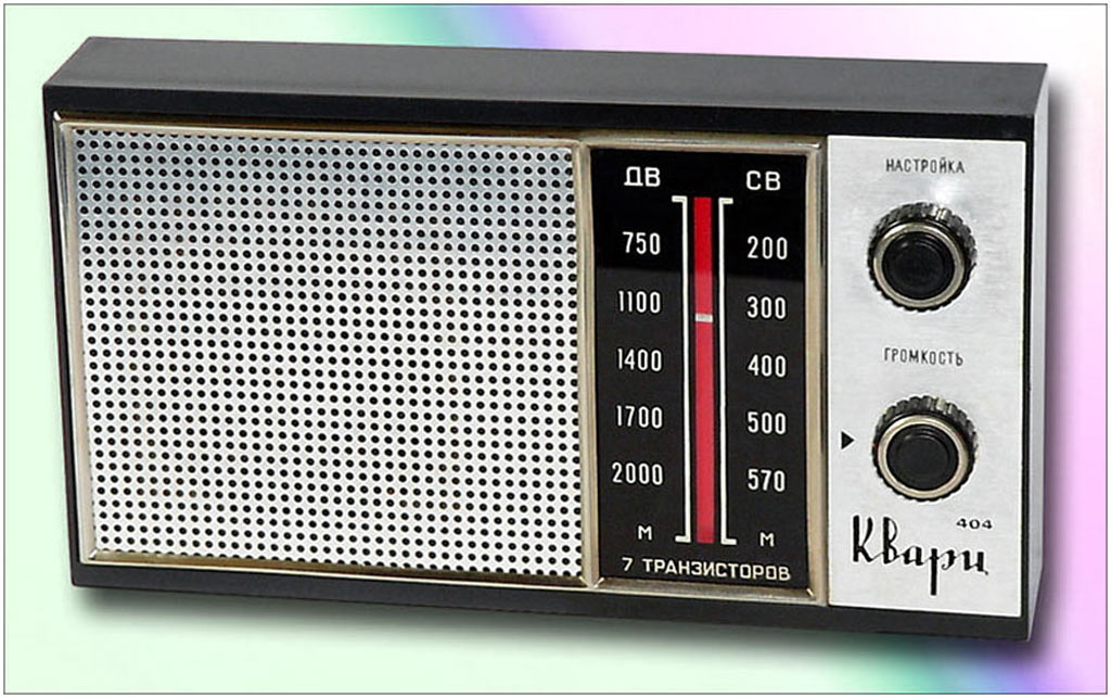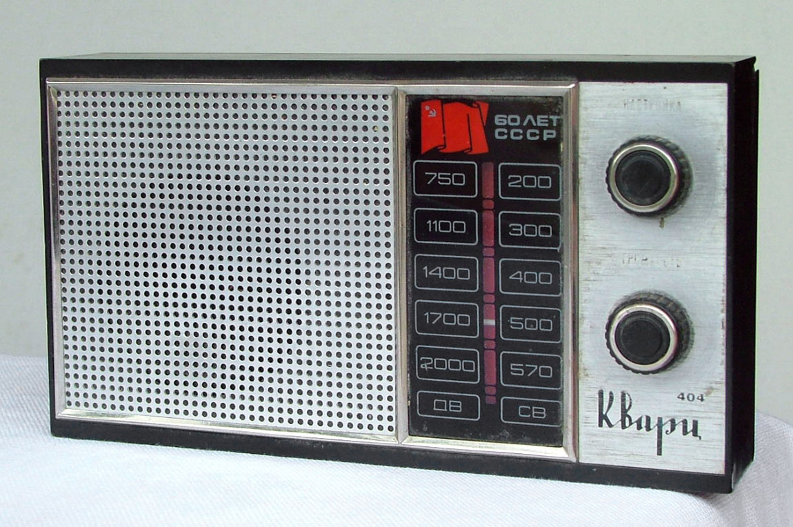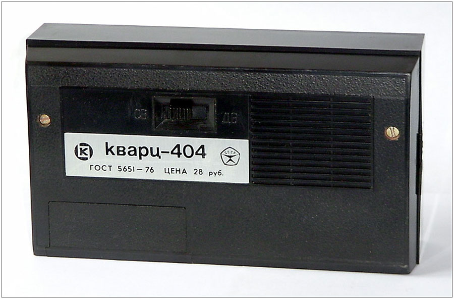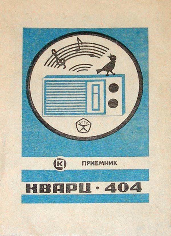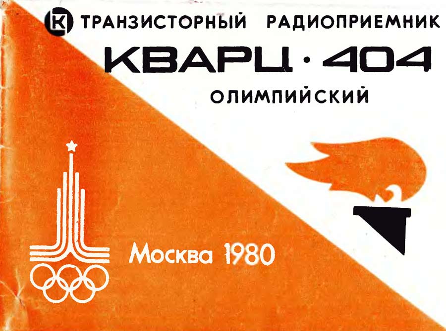 Переносной радиоприёмник *Кварц-404* с 1973 года выпускал Кыштымский радиозавод. С 1972 года Кыштымский радиозавод приступил к серийному выпуску малогабаритного переносного транзисторного радиоприёмника 4-го класса **Кварц-403**. В июле 1973 года он был заменён радиоприёмником **Кварц-404**, а с начала 1974 года радиоприёмником **Кварц-405**, при этом выпуск модели **Кварц-404** продолжался до 1982 года, а в 1979 году в связи с присвоением радиоприёмнику олимпийской символики он был модернизирован в приёмник **Кварц-404М**, в 1980 году вместо буквы **М** приёмнику было присвоено наименование **Кварц-404** Олимпийский. Все модели построены на базе радиоприёмника **Сокол-403** имеют одинаковые электрические и монтажные схемы и отличаются только внешним оформлением. Они работают в диапазонах ДВ и СВ. Приём производится на внутреннюю магнитную или при необходимости на внешнюю антенну. Чувствительность на внутреннюю антенну 3,0 мВ/м в диапазоне ДВ и 1,0 мВ/м в СВ. Избирательность по соседнему каналу 20 дБ в ДВ диапазоне и 16 дБ в СВ, ослабление зеркального канала 20 дБ. АРУ обеспечивает изменение напряжения сигнала на выходе на 10 дБ, при изменении на входе на 26 дБ. Диапазон ручной регулировки громкости -40 дБ. Диапазон звуковых частот 450...3150 Гц, среднее звуковое давление 0,15 Н/м2, номинальная выходная мощность 100 мВт. Питание от батареи **Крона** или аккумулятора 7Д-0,1. Работоспособность приёмников сохраняется при снижении напряжения до 5,6 В. Размеры приёмников - 170 х 100 х 40 мм, их масса 480 грамм. Радиоприёмник *Кварц-404* выпускался в трёх вариантах цветового оформления. Основной чёрный, но были красный и голубой варианты. Чехол имел два варианта оформления.