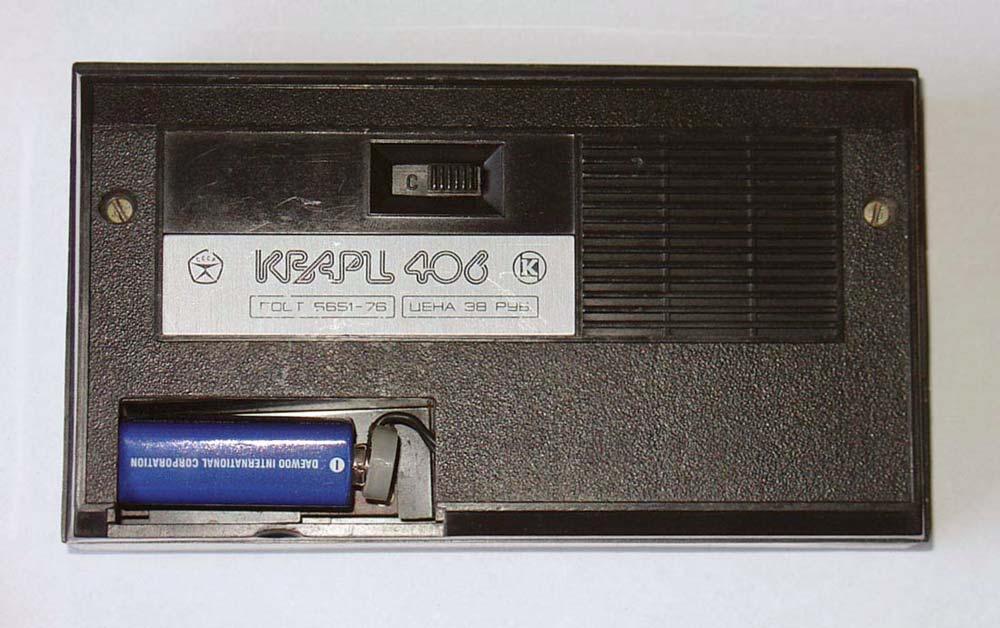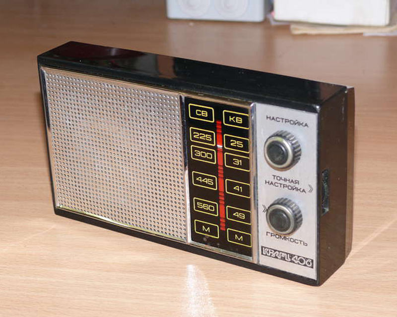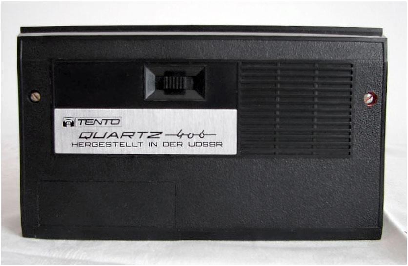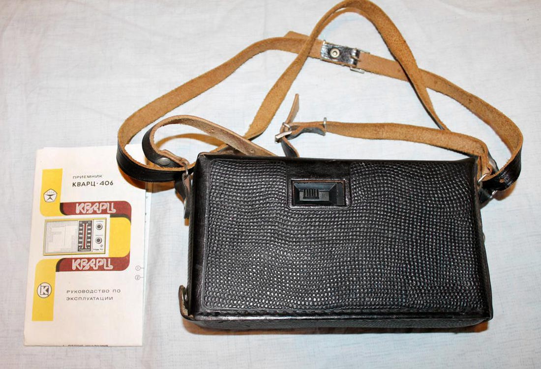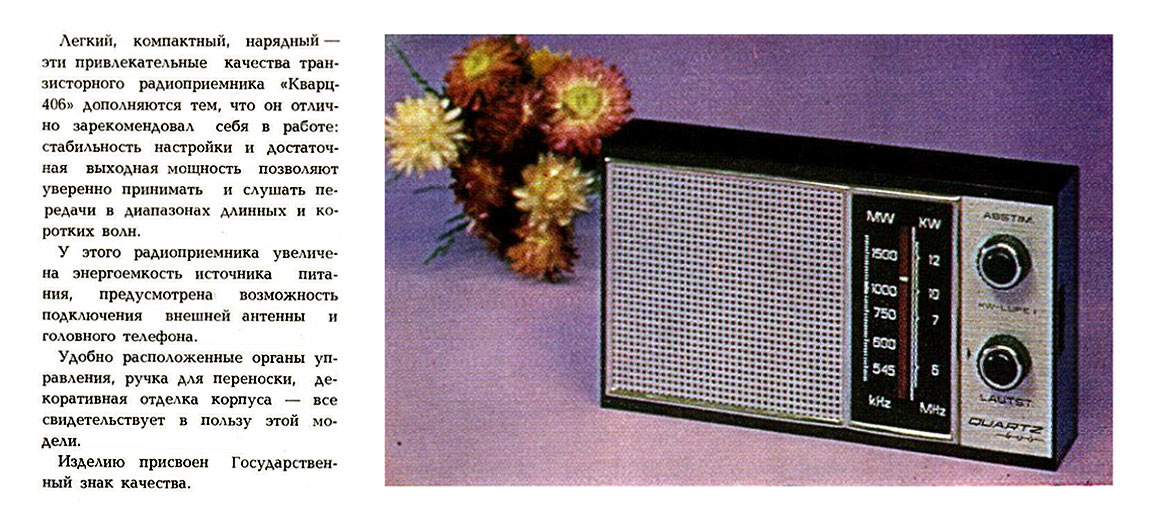 Портативный радиоприёмник *Кварц-406* с начала 1980 года выпускал Кыштымский радиозавод. Радиоприёмник **Кварц-406** или его экспортный вариант **Quartz-406** создан на основе радиоприёмника **Кварц-404** и кроме диапазона КВ, вместо ДВ по построению своей электрической схемы и оформлению схож с ним. Радиоприёмник *Кварц-406* рассчитан на приём радиовещательных станций работающих в 2-х диапазонах СВ - 525...1605 кГц и КВ - 5,75...12,2 МГц. Приём в обоих диапазонах производится на магнитную антенну. Чувствительность в диапазонах СВ - 1,0 мВ/м, КВ - 0,05 мВ/м. Селективность по соседнему каналу 20 дБ. Диапазон воспроизводимых звуковых частот 450...3150 Гц. Номинальная выходная мощность 100 мВт. Питание осуществляется от батареи **Крона** или от аккумулятора **7Д-0,1**. Габариты модели 170 х 100 х 40 мм. Масса 480 грамм без батареи.