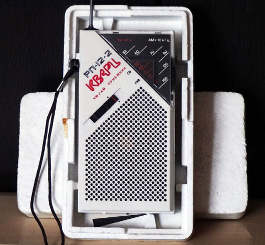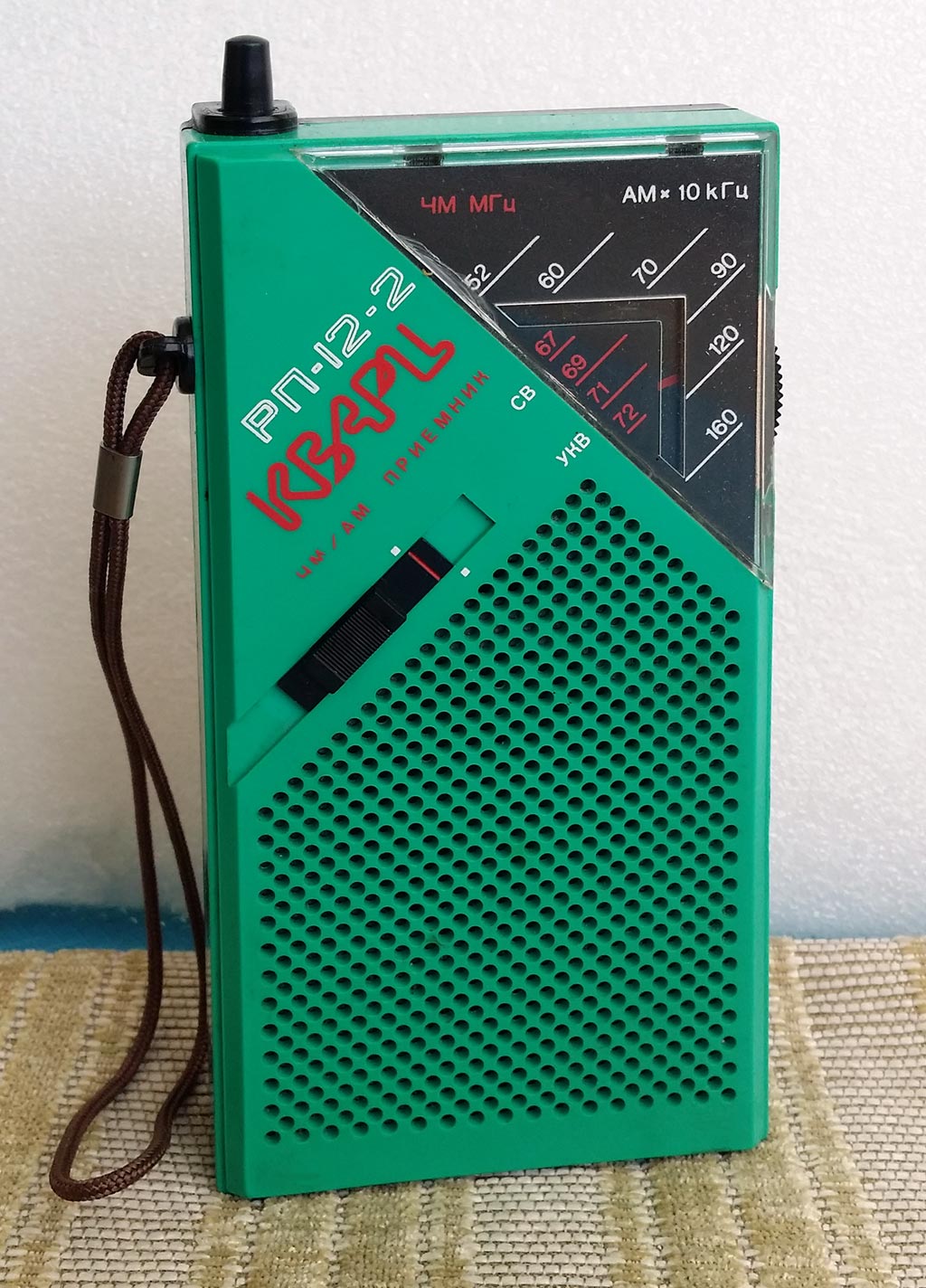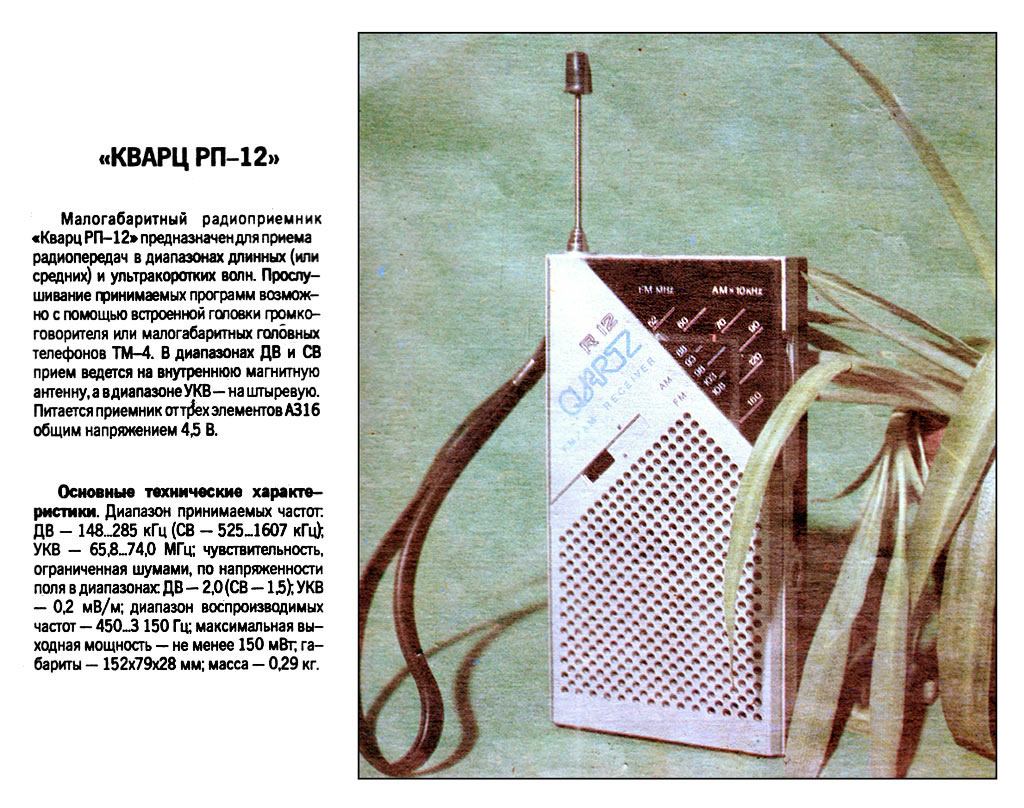 Портативный радиоприёмник *Кварц РП-12* с 1991 года выпускал Кыштымский радиозавод. Малогабаритный транзисторный радиоприёмник **Кварц РП-12** (1) и его варианты с номерами 2,3,4 предназначен для приёма в диапазонах ДВ или СВ и УКВ ЧМ или FM. Цифра обозначала сочетание диапазонов. Прослушивание программ возможно на громкоговоритель или головной телефон ТМ-4. В диапазонах ДВ, СВ приём ведется на внутреннюю магнитную антенну, а в диапазоне УКВ на штыревую телескопическую. Питание осуществляется от 3-х элементов A-316. Экспортный вариант именовался **Quartz R12** соответственно дополненный цифрой, поставлялся на экспорт и радиоприёмник с наименованием *Кварц-12*. Диапазоны: ДВ 148...285 кГц; СВ 525...1607 кГц; УКВ 65,8...74,0 МГц или 88...108 МГц. Чувствительность в диапазонах ДВ 2, СВ 1,5, УКВ 0,2 мВ/м. Диапазон воспроизводимых звуковых частот 450...3150 Гц. Максимальная выходная мощность 150 мВт. Габариты приёмника 152х79х28 мм. Масса 290 гр. Для России и стран бывшего СССР в основном выпускался радиоприёмник *Кварц РП-12-2*.