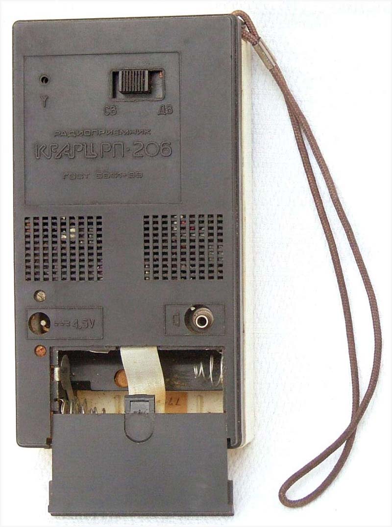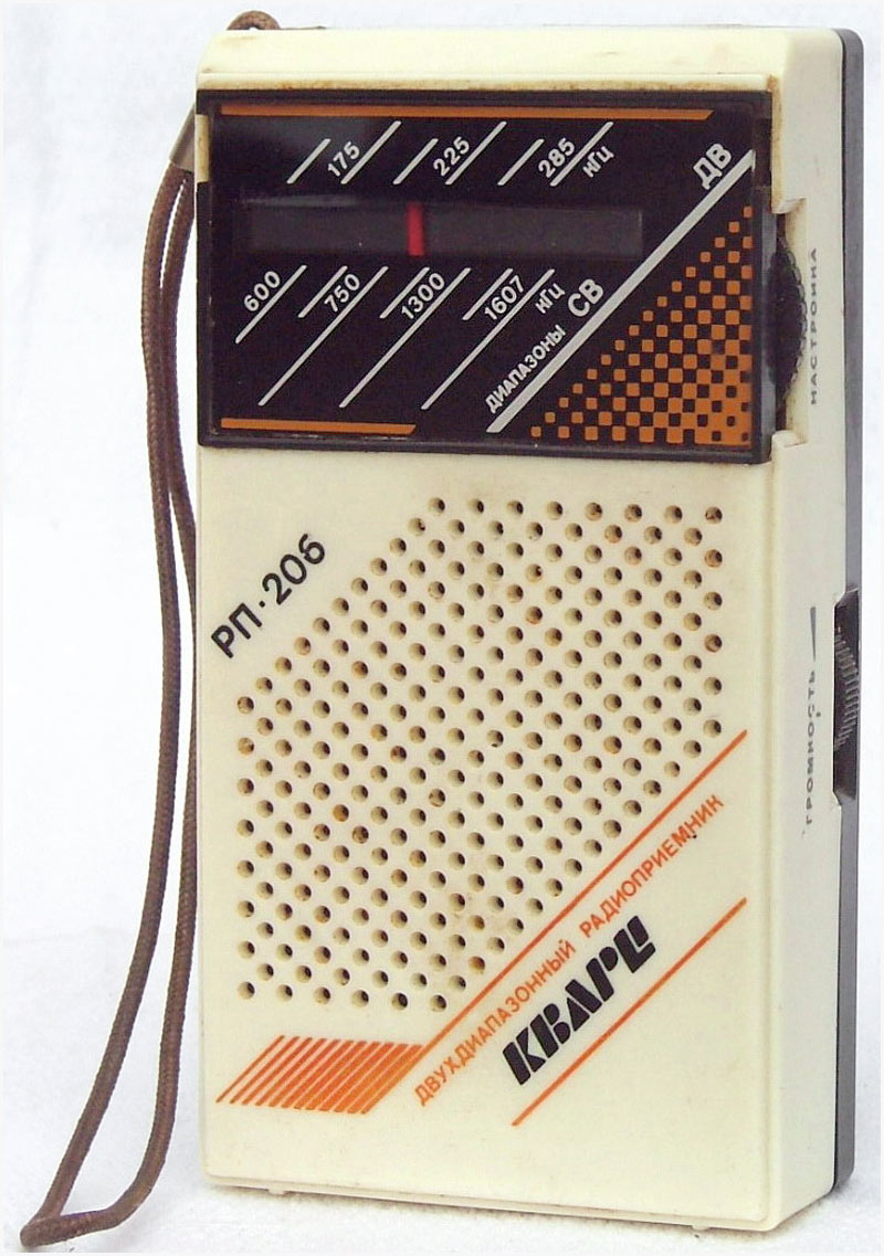 Портативный радиоприёмник *Кварц РП-206* с 1992 года выпускал Кыштымский радиозавод. Радиоприёмник **Кварц РП-206** - малогабаритный СВ и ДВ супергетеродин, собранный на одной многофункциональной микросхеме К-174ХА10 и содержит небольшое количество деталей. Диапазоны частот: ДВ 148...285 кГц, СВ 525...1607 кГц. Чувствительность в диапазонах ДВ 2,5 мВ/м, СВ 1,3 мВ/м. Избирательность 30 дБ. Диапазон воспроизводимых частот 450...4000 Гц. Максимальная выходная мощность 150 мВт. Габариты приёмника 74х158х37 мм, вес с батареями 340 гр.