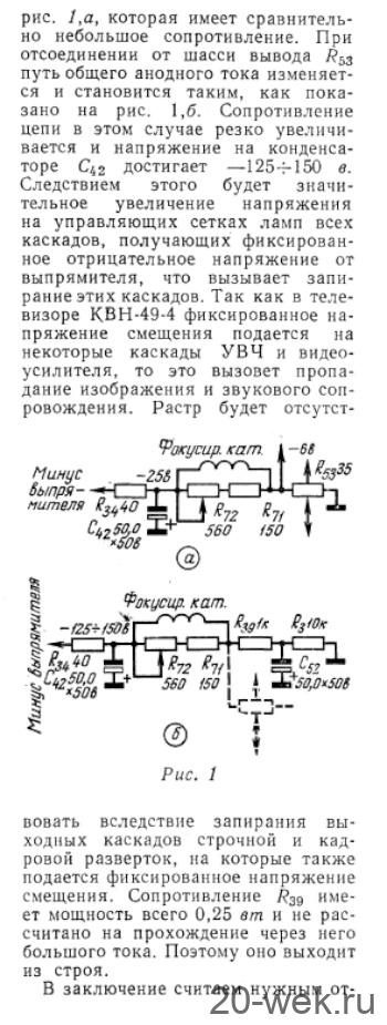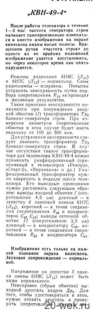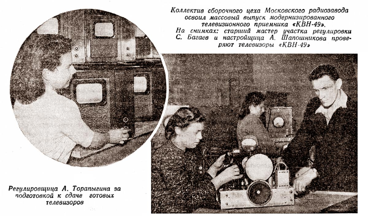 Телевизионный приёмник чёрно-белого изображения *КВН-49* выпускался с начала 1949 года. Известные заводы изготовители: Александровский радиозавод. Бакинский радиозавод. Воронежский завод *Электросигнал*. Киевский завод *Маяк*. Ленинградский завод *Россия*. Ленинградский НИИ телевидения. Московский радиозавод. Новгородский завод *Квант*. Одним из первых массовых серийных телевизоров был **КВН-49** разработанный в Ленинградском НИИ телевидения в 1947 году и выпущенный на его опытном заводе в 1948 году в количестве 20 штук. Сочетание **КВН** произошло от первых букв фамилий разработчиков: В.К.Кенигсона, Н.М.Варшавского и И.А.Николаевского, а цифровое дополнение **49** год начала производства. Очень трудно разобраться в буквах и цифрах после *49*, так как первые телевизоры именовались как *КВН-49* (Т-1) и *КВН-49* и *КВН-49-1*, были и модернизации *КВН-49-А* и *КВН-49-Б*. Первым будем считать всё же телевизор **КВН-49-1**, который представляет собой 16-ламповый приёмник прямого усиления. Применение такой схемы для канала изображения позволило достигнуть чёткости и устойчивости картинки, а также использование разноса между несущими частотами изображения и звука в качестве ПЧ звука уменьшило число радиоламп в приёмнике и снизило его стоимость. Телевизор **КВН-49-1** рассчитан на приём в любом из 3 каналов. Изображение размером 105х140 мм воспроизводится на экране кинескопа ЛК-715-А, который вскоре был заменён на 18ЛК1Б. Звук воспроизводится громкоговорителем 1ГД-1. Питание телевизора осуществляется от сети переменного тока: 110, 127 или 220 В. Потребляемая мощность 220 Вт. Телевизор выполнен в настольном оформлении с размерами 380х400х490 мм и весом 29 кг. В телевизоре 11 ручек управления, из них четыре основных выведены на переднюю стенку, это слева контрастность и громкость (нижняя), справа выключатель сети, объединённый с яркостью и фокусировкой (внизу), остальные 7 ручек расположены справа, на боковой стенке. На задней стенке расположены: клеммы антенны, переключатель программ, колодка переключения сети и предохранитель. Чувствительность телевизора по каналам изображения и звукового сопровождения 800...1000 мкВ. Разрешающая способность изображения 350...400 линий. При окончании передач телевизор автоматически отключался от сети. Небольшая серия телевизоров до 1951 года имела возможность приёма программ в 2-х стандартах 441 и 625 строк. Статья Радио №5/1964, ст.53 Радио №12/1964, ст.28