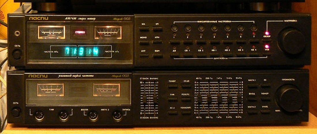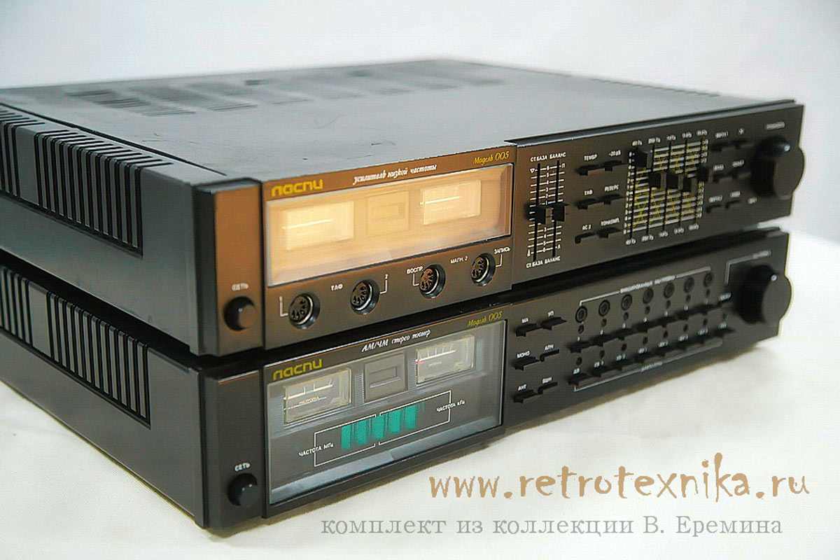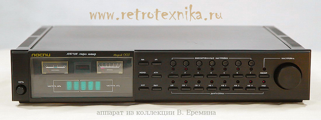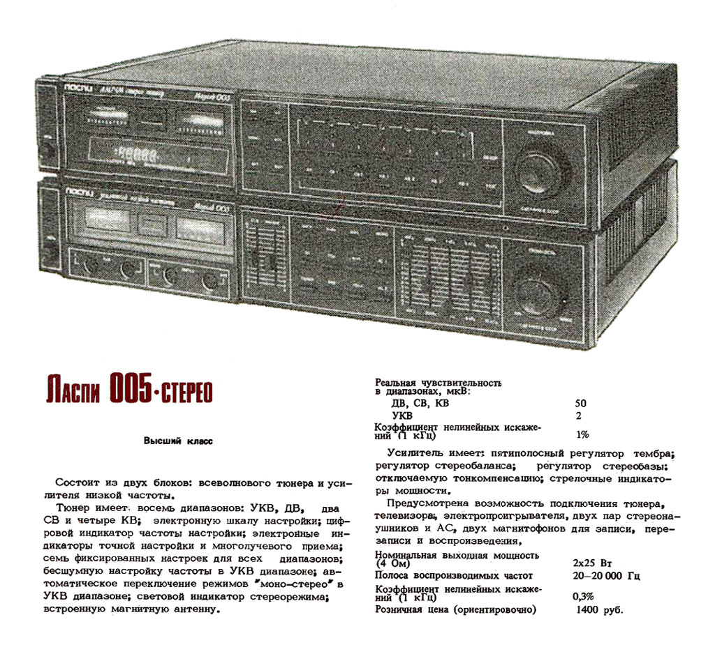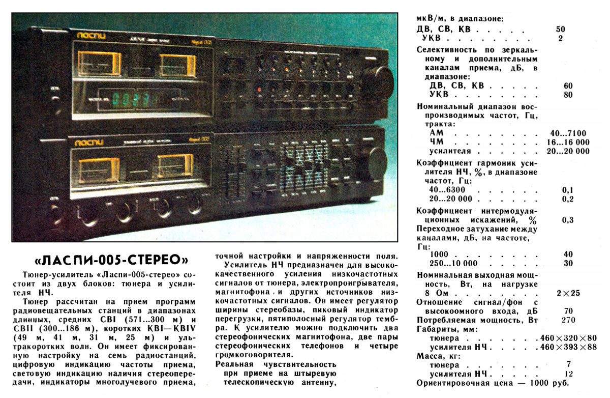 Тюнер и полный усилитель *Ласпи-005-стерео* с 1981 года малосерийно выпускал Севастопольский радиозавод имени Калмыкова. Тюнер работает в диапазонах ДВ, СВ-1 571-300 м, СВ-2 300...186 м, четырёх КВ 49, 41, 31, 25 м и УКВ. Тюнер имеет фиксированную настройку на семь радиостанций, цифровую индикацию частоты приёма, световую индикацию наличия стереопередачи, индикаторы многолучевого приёма, точной настройки и напряженности поля. Усилитель ЗЧ предназначен для высококачественного усиления сигналов с тюнера, электропроигрывателя, магнитофона и других источников звуковых сигналов. Аппарат имеет регулятор ширины стереобазы, индикатор перегрузки, пятиполосный регулятор тембра. К усилителю можно подключить два магнитофона, две пары стереофонических телефонов или четыре АС. Чувствительность при приёме на штыревую антенну в диапазонах АМ - 50 мкВ, ЧМ - 2 мкВ. Селективность по зеркальному каналу в диапазоне: ДВ, СВ, KB 60 дБ. УКВ - 80 дБ. Диапазон частот тракта: AM - 40...7100 Гц. ЧМ - 16...16000 Гц, усилителя 20...20000 Гц. Коэффициент гармоник усилителя - 0,2 %. Коэффициент искажений 0,3 %. Переходное затухание между каналами 30 дБ. Номинальная выходная мощность (8 Ом) - 2х25 Вт. Потребляемая мощность от сети около 270 Вт. Габариты тюнера 460 х 320 х 80 мм, усилителя - 460 х 393 х 88 мм. Вес тюнера 7 кг, усилителя 12 кг. Одновременно завод выпускал тюнеры *Ласпи-006-стерео* и *Ласпи-008-стерео*. Первый отличался от базового электронными индикаторами, вместо стрелочных, а второй аналогичен модели *Ласпи-006-стерео* но со светлой передней панелью из алюминия, вместо литой панели чёрного цвета.