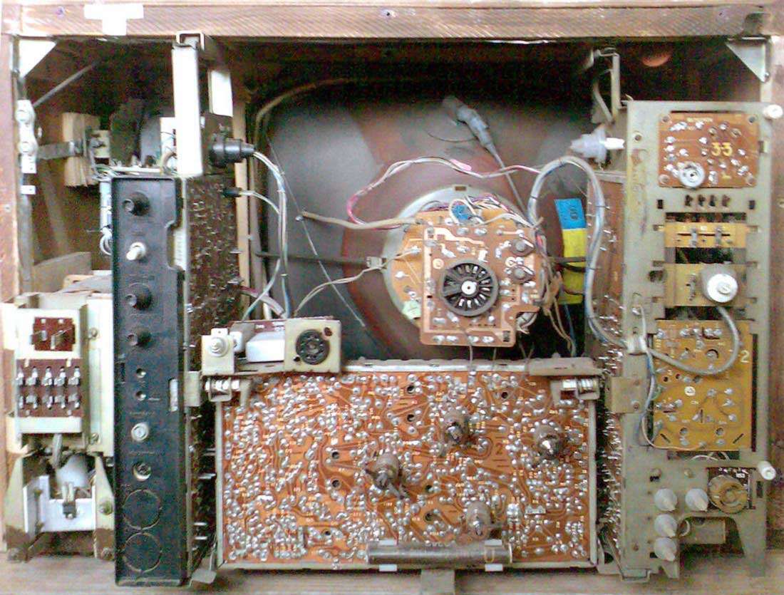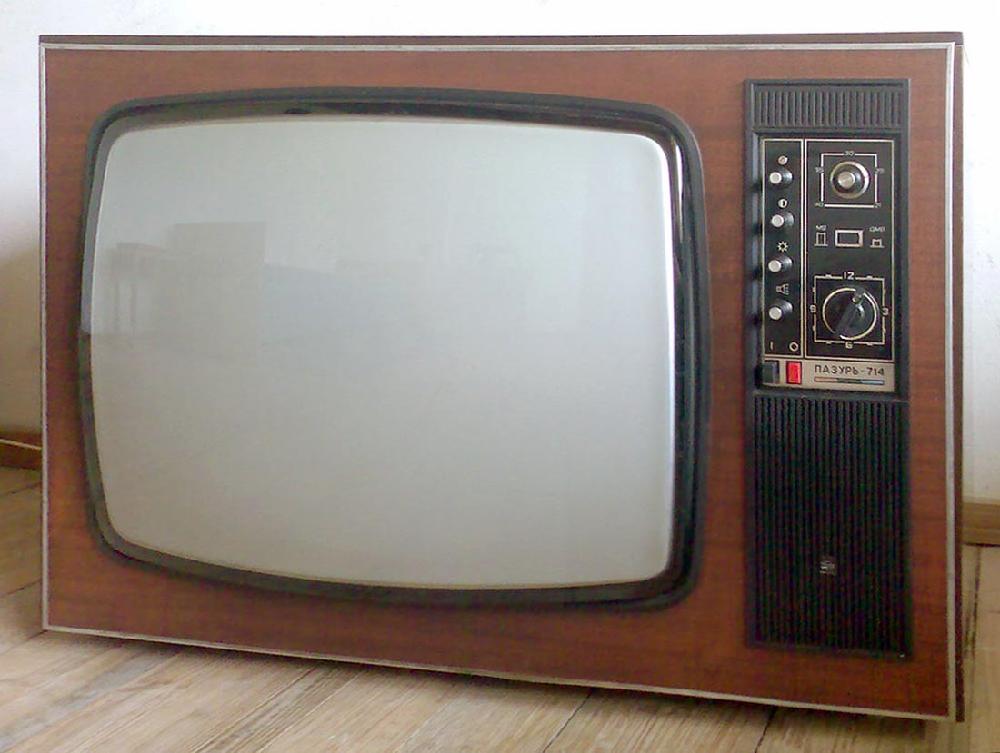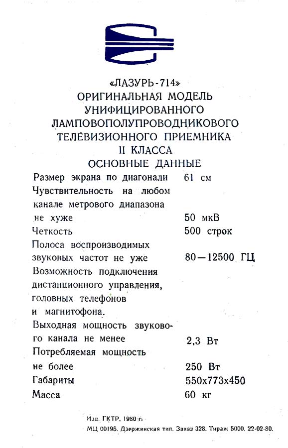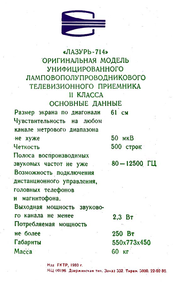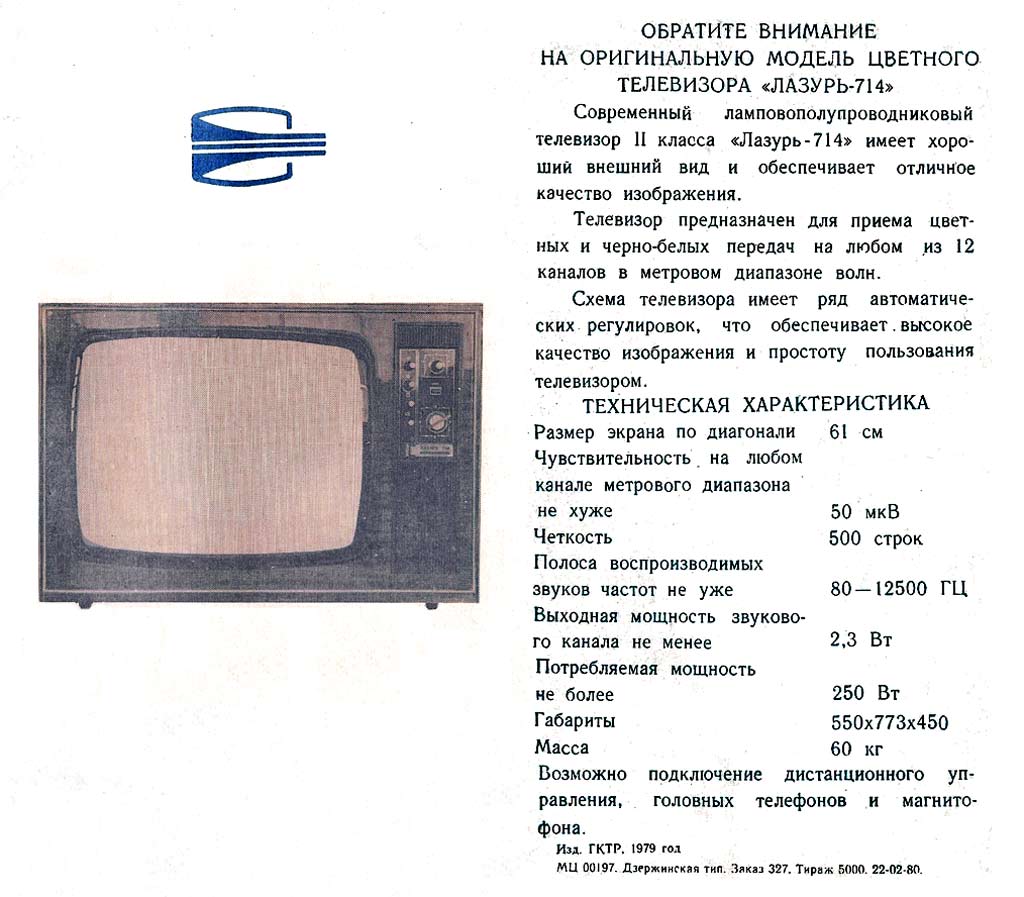 Телевизионный приёмник цветного изображения *Лазурь-714* с 1976 года выпускал Сормовский телевизионный завод *Лазурь*. **Лазурь-714** (УЛПЦТ-61-II-11) унифицированный лампово-полупроводниковый цветной телевизор 2 класса на кинескопе 61ЛК3Ц. Телевизор обеспечивает приём телевизионных передач ч/б и цветного изображения на любом из 12 каналов МВ диапазона, а при установке селектора СК-Д-1 и на любом канале ДМВ диапазона. В модели предусмотрены: включение магнитофона на запись звукового сопровождения; прослушивание звука на головные телефоны с выключением АС. Имеется система АРУ и АПЧГ. Размер изображения 362 x 482 мм. Чувствительность ТВ - 50 мкВ. Разрешающая способность 450 линий. Выходная мощность канала звука 2,3 Вт. Диапазон частот - 80...12500 Гц. Потребляемая мощность 250 Вт. Габариты телевизора 550 x 773 x 540 мм. Вес 60 кг. С 1977 года Горьковский телевизионный завод имени Ленина начал выпуск телевизора *Чайка-714*, аналогичному по оформлению, схеме и конструкции описанному.