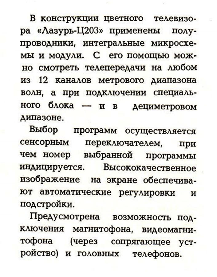 Цветной телевизионный приёмник *Лазурь Ц-203* подготовил к выпуску с 1984 года Сормовский телевизионный завод *Лазурь*. Информация из каталога *Товары народного потребления* за 1984 год.