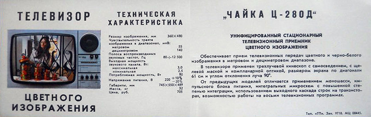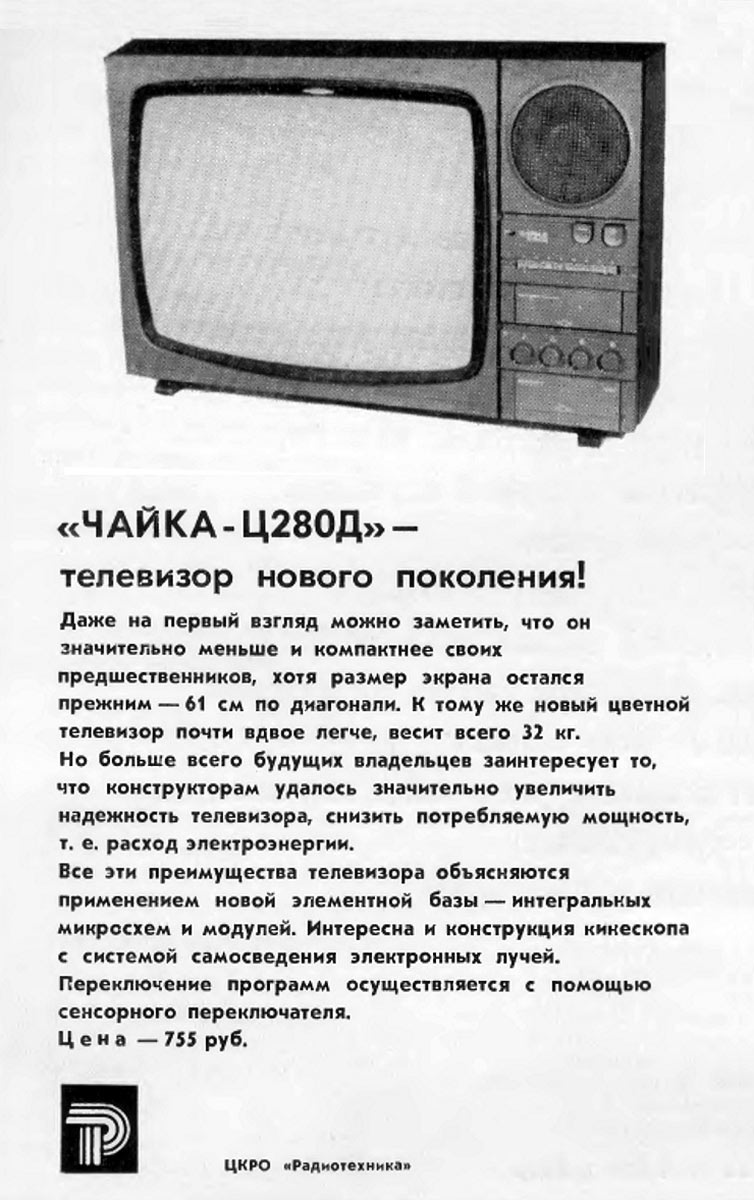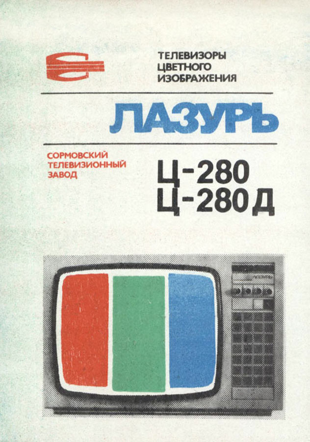 Цветной телевизор *Чайка Ц-280Д* с 1985 года выпускал Горьковский телевизионный завод им. Ленина. Унифицированный полупроводниково-интегральный модульный цветной телевизор **Чайка Ц-280Д** предназначен для приёма в диапазонах МВ и ДМВ. В ТВ имеются автоматические регулировки. Выбор любой из 8-ми программ осуществляется сенсорным переключателем. Применение импульсного блока питания и новой элементной базы, позволили уменьшить габариты, вес и потребляемую мощность аппарата. Применены: цветной масочный кинескоп 61ЛК5Ц с углом отклонения лучей 90°, с самосведением; сенсорный переключатель телепрограмм УСУ-1-15; селекторы типа СК-М-24 и СК-Д-24; световая индикация канала. Есть возможность подключения магнитофона; видеомагнитофона при установке модуля сопряжения; прослушивания звука на телефоны; подключения диагноз-тестера. Размер изображения 362х482 мм. Диапазон рабочих частот 80...12500 Гц. Чувствительность в МВ 55, ДМВ 90 мкВ. Номинальная выходная мощность 2,5 Вт. Потребляемая мощность 80 Вт. Габариты ТВ - 500х745х550 мм. Вес 32 кг. С 1986 года Сормовский телевизионный завод *Лазурь* выпускал телевизор *Лазурь Ц-280* аналог телевизора *Чайка Ц-280Д* отличавшийся оформлением.