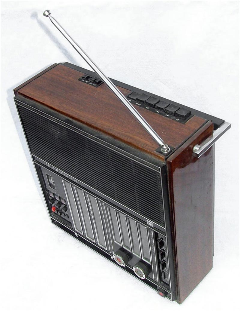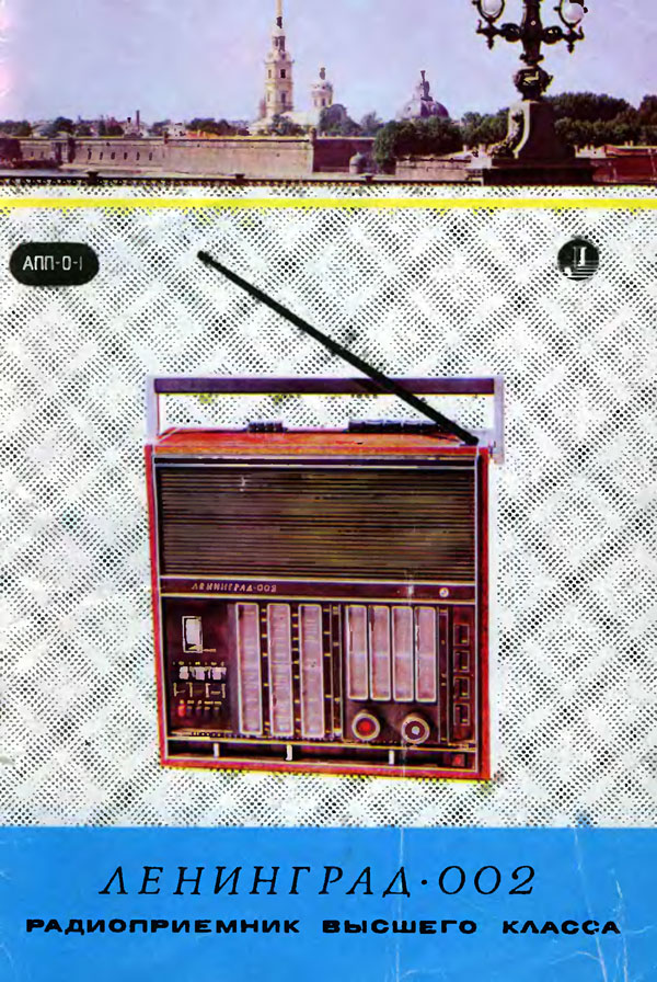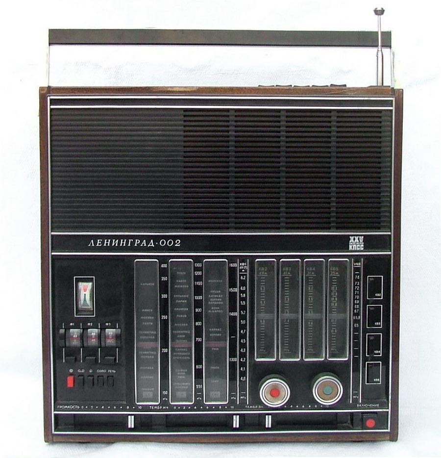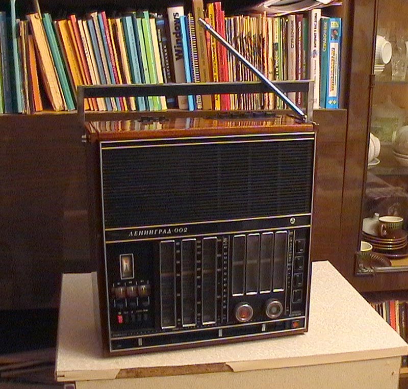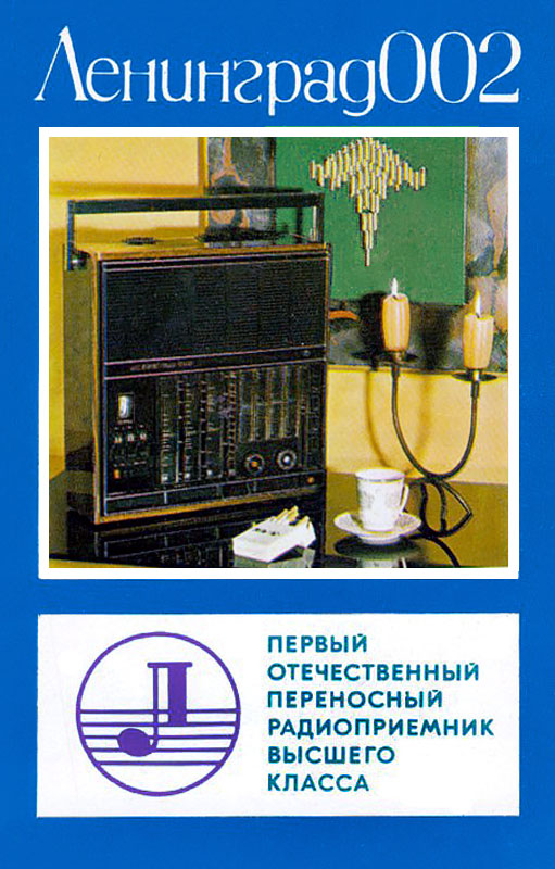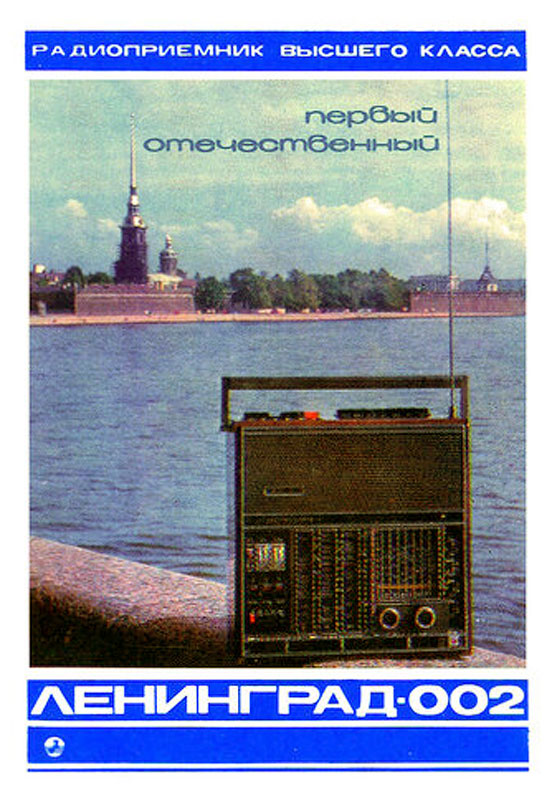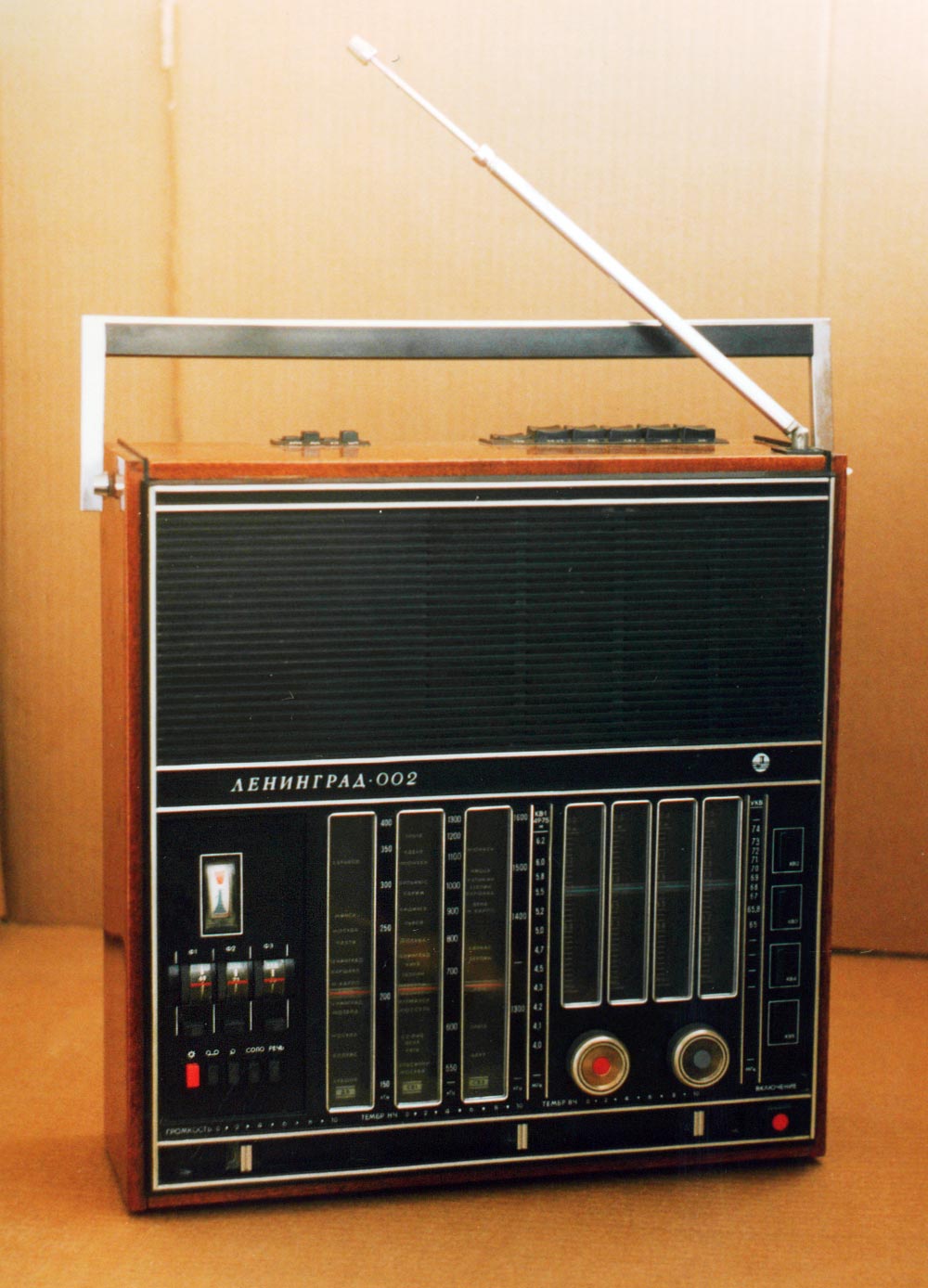 Портативный транзисторный радиоприёмник *Ленинград-002* с осени 1974 года выпускал Ленинградский завод *Радиоприбор*. Первый отечественный переносной приёмник высшего класса **Ленинград-002** обеспечивает высококачественное прослушивание программ радиостанций. Есть возможность зафиксировать настройку на три радиостанции в УКВ диапазоне. Есть регуляторы тембров ВЧ и НЧ, переключатель речь-соло, стрелочный индикатор уровня сигнала и питания, две шкалы настройки. Есть гнёзда для подключения магнитофона на запись, электропроигрывателя, для прослушивания через усилитель приёмника, АС, внешней антенны, заземления и головных телефонов. Радиоприёмник собран на 36 транзисторах и 1-й микросхеме. Деревянный корпус облицован шпоном ценных пород, передняя и задняя стенки изготовлены из полистирола. Масса приёмника без элементов - 9 кг.