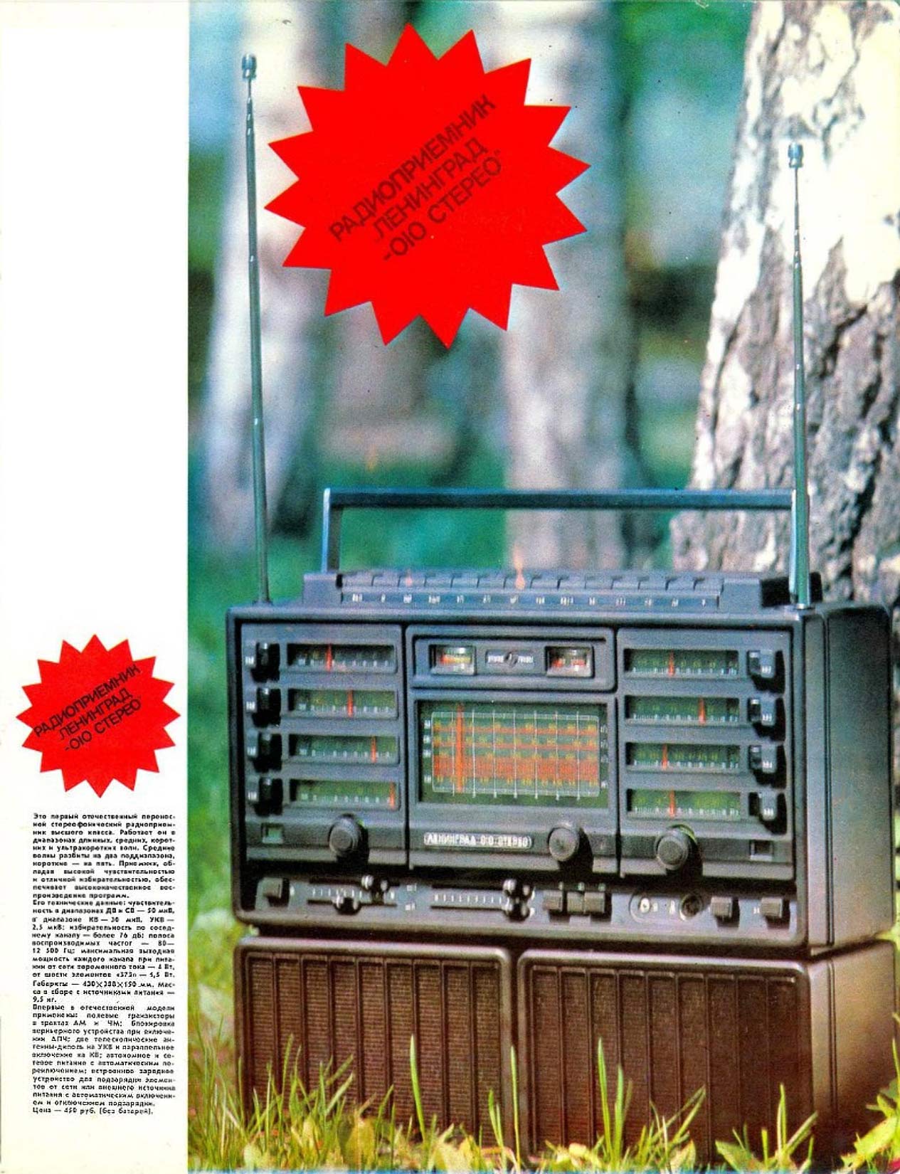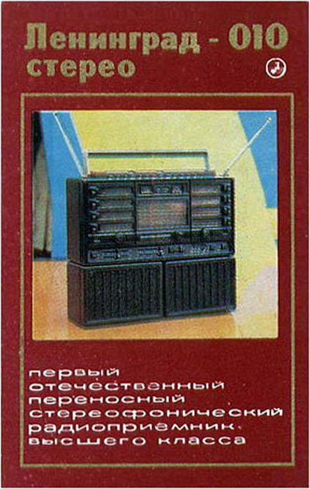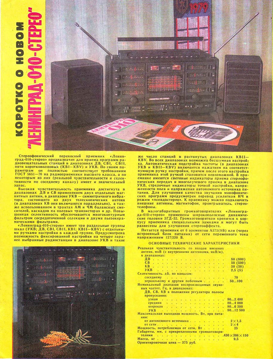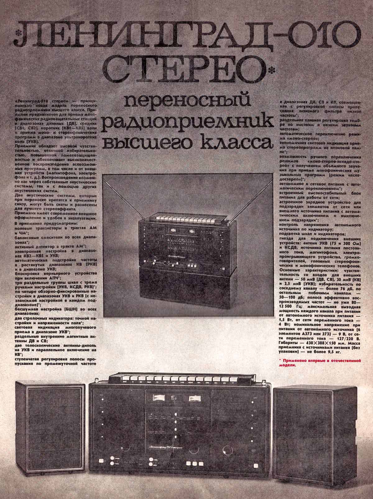 Стереофонический радиоприёмник *Ленинград-010-стерео* с 1979 года выпускал Ленинградский завод *Радиоприбор*. Радиоприёмник **Ленинград-010-стерео** предназначен для приёма радиовещательных станций в диапазонах ДВ, CB-I, CB-II, пяти коротковолновых и УКВ-ЧМ. По параметрам приёмник соответствует требованиям ГОСТ 5651-76 на модели высшего класса, а по некоторым из них имеет и значительный запас. Высокая чувствительность достигнута в диапазонах ДВ и СВ применением 2-х отдельных магнитных антенн, в диапазоне УКВ симметричного вибратора из двух телескопических антенн, в диапазонах KB они включаются параллельно с использованием балансных смесителей каскадов. Высокая селективность обеспечивается многоконтурным ФСС и двумя пьезокерамическими фильтрами. Приёмник имеет три раздельные группы шкал с отдельными ручками для настройки. Предусмотрена и возможность фиксированной настройки на 4 заранее выбранные станции в диапазоне УКВ и такое же число станций в поддиапазонах КВ. Во всех диапазонах возможна бесшумная настройка. Автоматическая подстройка частоты (КВ, УКВ) включается нажатием на соответствующую ручку настройки, причём после этого настройка этой ручкой становится невозможной. В приёмнике имеются световые индикаторы приёма стереофонических передач и многолучевого приёма в диапазоне УКВ, стрелочные индикаторы точной настройки, напряженности поля и напряжения источника питания. Для улучшения звука моно-программ предусмотрен перевод усилителя приёмника в режим псевдостерео. К приёмнику можно подключить внешние антенны, магнитофон, проигрыватель, стереотелефоны. В АС применены широкополосные громкоговорители ЗГД-32. АС крепятся к корпусу и могут разнесены для улучшения стереоэффекта. Питание от 6 элементов А-373 и через встроенный БП от электрической сети. Чувствительность со входов внешних антенн, мкВ (с встроенными антеннами, мкВ/м), в диапазонах; ДВ - 50/800. СВ - 50/500. KB - 30/50. УКВ - 2,5/5. Селективность приёмника; дБ, по каналам: соседнему 70, зеркальному и другим побочным 50...100. Диапазон воспроизводимых частот, Гц, в диапазонах АМ при полосе пропускания: узкая 80...2400, средняя 80...4000, широкая 80...6300, ЧМ - 80...12500. Максимальная выходная мощность, Вт при питании от батарей 2х1,5, от сети 2х4. Потребляемая от сети мощность Вт, 25. Габариты приёмника с прикрепленными АС - 430х388х150 мм. Общая масса 9,5 кг. Розничная цена 375 рублей.