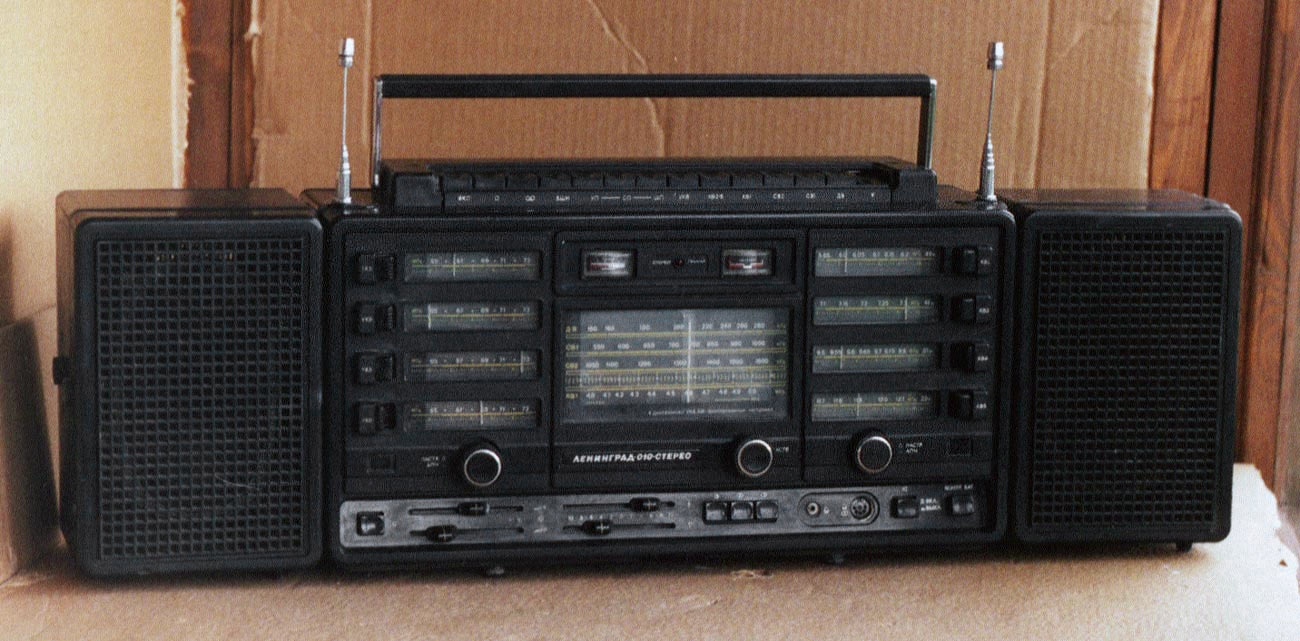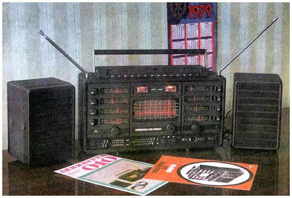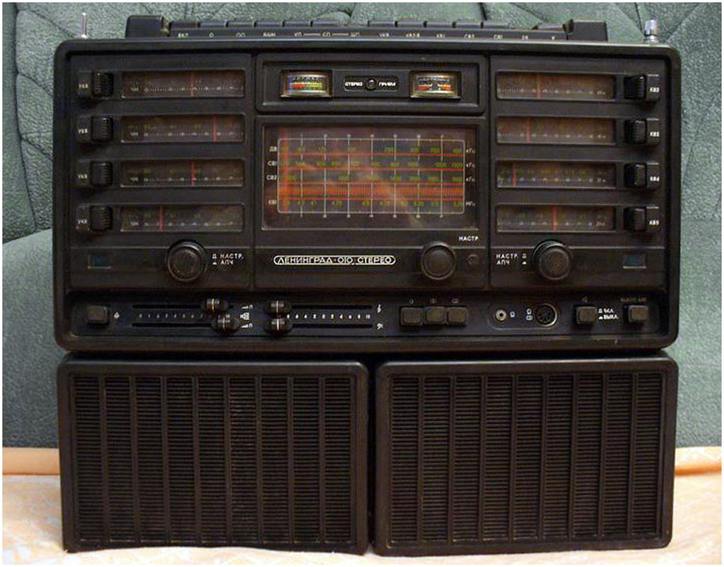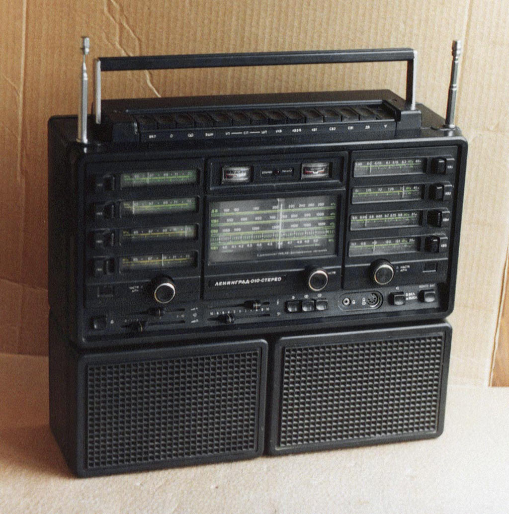 Стереофонический радиоприёмник *Ленинград-010-стерео* с 1979 года выпускал Ленинградский завод *Радиоприбор*. Радиоприёмник **Ленинград-010-стерео** предназначен для приёма радиовещательных станций в диапазонах ДВ, CB-I, CB-II, пяти коротковолновых и УКВ-ЧМ. По параметрам приёмник соответствует требованиям ГОСТ 5651-76 на модели высшего класса, а по некоторым из них имеет и значительный запас. Высокая чувствительность достигнута в диапазонах ДВ и СВ применением 2-х отдельных магнитных антенн, в диапазоне УКВ симметричного вибратора из двух телескопических антенн, в диапазонах KB они включаются параллельно с использованием балансных смесителей каскадов. Высокая селективность обеспечивается многоконтурным ФСС и двумя пьезокерамическими фильтрами. Приёмник имеет три раздельные группы шкал с отдельными ручками для настройки. Предусмотрена и возможность фиксированной настройки на 4 заранее выбранные станции в диапазоне УКВ и такое же число станций в поддиапазонах КВ. Во всех диапазонах возможна бесшумная настройка. Автоматическая подстройка частоты (КВ, УКВ) включается нажатием на соответствующую ручку настройки, причём после этого настройка этой ручкой становится невозможной. В приёмнике имеются световые индикаторы приёма стереофонических передач и многолучевого приёма в диапазоне УКВ, стрелочные индикаторы точной настройки, напряженности поля и напряжения источника питания. Для улучшения звука моно-программ предусмотрен перевод усилителя приёмника в режим псевдостерео. К приёмнику можно подключить внешние антенны, магнитофон, проигрыватель, стереотелефоны. В АС применены широкополосные громкоговорители ЗГД-32. АС крепятся к корпусу и могут разнесены для улучшения стереоэффекта. Питание от 6 элементов А-373 и через встроенный БП от электрической сети. Чувствительность со входов внешних антенн, мкВ (с встроенными антеннами, мкВ/м), в диапазонах; ДВ - 50/800. СВ - 50/500. KB - 30/50. УКВ - 2,5/5. Селективность приёмника; дБ, по каналам: соседнему 70, зеркальному и другим побочным 50...100. Диапазон воспроизводимых частот, Гц, в диапазонах АМ при полосе пропускания: узкая 80...2400, средняя 80...4000, широкая 80...6300, ЧМ - 80...12500. Максимальная выходная мощность, Вт при питании от батарей 2х1,5, от сети 2х4. Потребляемая от сети мощность Вт, 25. Габариты приёмника с прикрепленными АС - 430х388х150 мм. Общая масса 9,5 кг. Розничная цена 375 рублей.