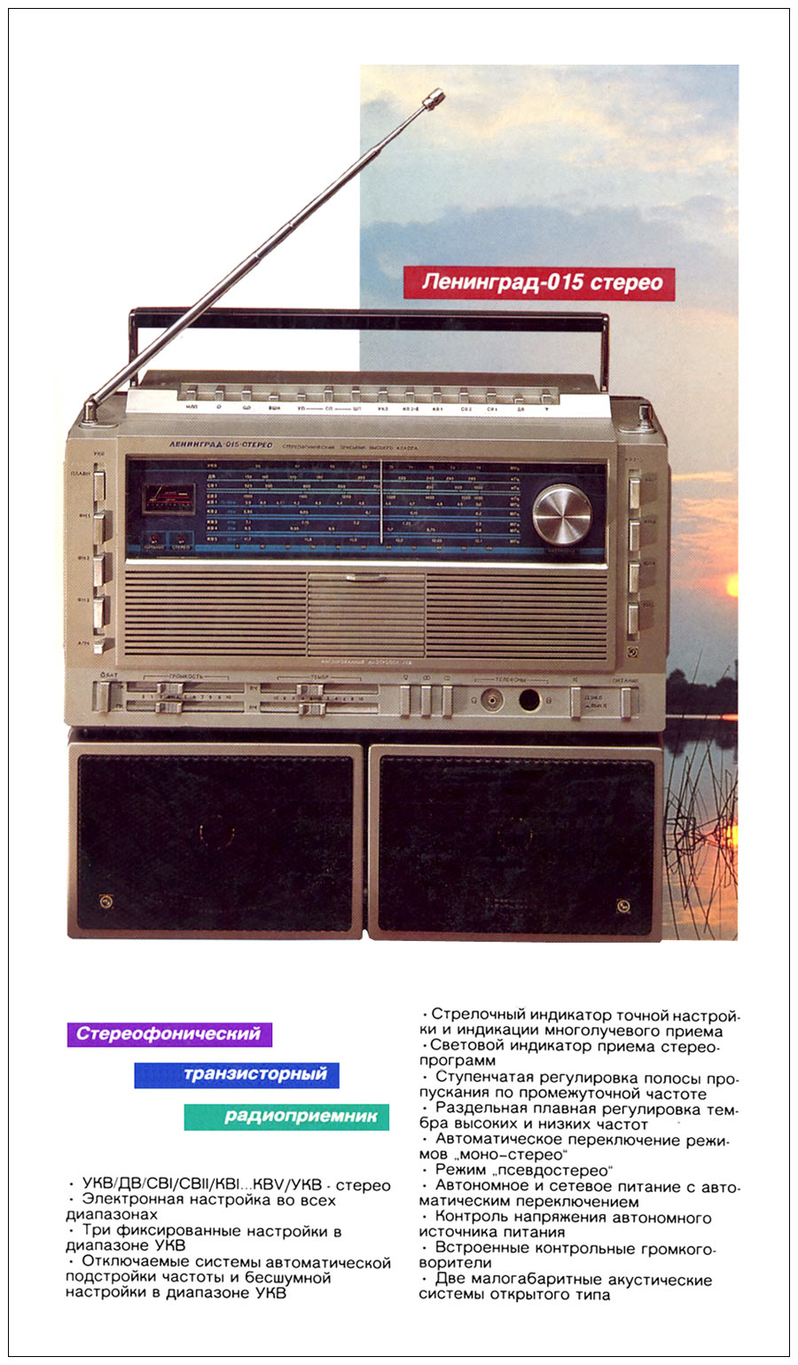 Радиоприёмник *Ленинград-015-стерео* с 1984 года выпускал Ленинградский завод *Радиоприбор*. Переносный стереофонический радиоприёмник **Ленинград-015-стерео** рассчитан на приём в диапазонах ДВ, СВ (2 поддиапазона) КВ (4 поддиапазона) и УКВ. Приёмник может использоваться как звуковоспроизводящее устройство. В приёмнике применена электронная настройка на всех диапазонах, имеется АПЧ, бесшумная настройка и три фиксированные настройки в диапазоне УКВ, световая индикация стереопередач на УКВ-ЧМ, индикация точной настройки и многолучевого приёма, автоматическое переключение режимов моно и стерео и возможность ручного переключения приёмника в режим псевдо-стерео, который позволяет получить эффект объемного звучания при приёме монофонических передач. Прослушивание программ возможно как на встроенные контрольные громкоговорители так и на внешнюю АС из двух громкоговорителей открытого типа. Питание универсальное: от сети и от 6 элементов 373. Реальная чувствительность в диапазонах ДВ, СВ с магнитной антенной 1,0/0,5 мВ/м, в диапазонах KB и УКВ со штыревой антенной 50/5 мкВ. Селективность по соседнему каналу 70 дБ. Максимальная выходная мощность при питании от сети 2х4 Вт. Полоса воспроизводимых частот тракта AM - 80...5600, ЧМ - 80...12500 Гц. Габариты приёмника (без АС) 439х245х150 мм, вес 7 кг. С 1987 года радиоприёмник именовался как *Ленинград РП-015-стерео*.