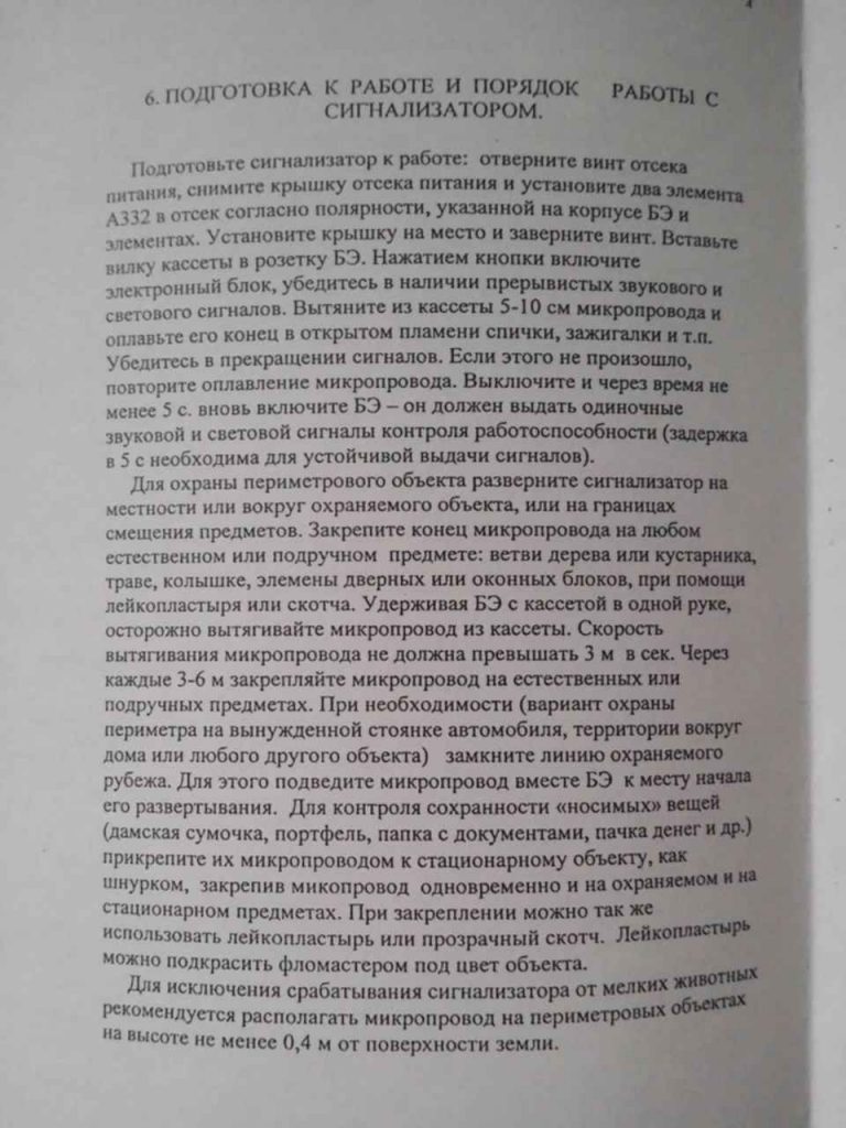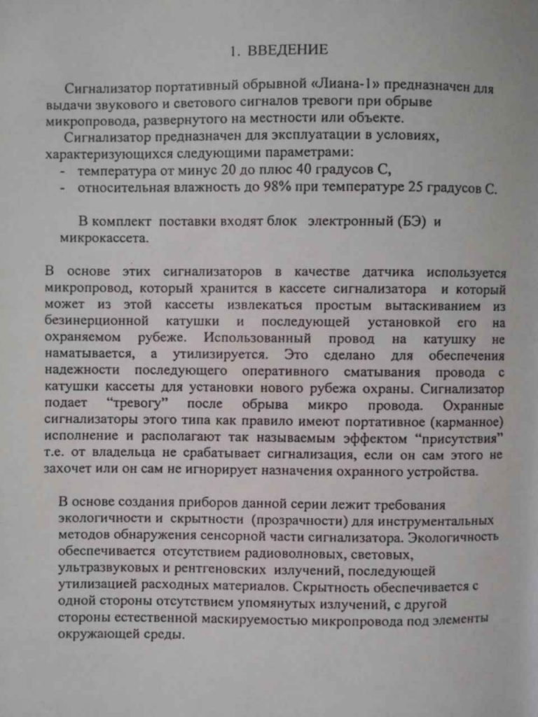 Сигнализатор обрывного типа *Лиана-1* выпускался предположительно с 1990 года. Изготовитель не установлен. Сигнализатор обрывного типа предназначен для обнаружения проникновения посторонних лиц на охраняемую территорию. Подаёт сигнал при обрыве тонкого микропровода. КРАТКОЕ ОПИСАНИЕ СИГНАЛИЗАТОРА Сигнализатор осуществляет непрерывный контроль за целостностью микропровода, состоящего из 2-х токопроводящих жил диаметром 0,05 мм. Жилы предварительно замыкаются на конце микропровода путем оплавления в открытом пламени спички, зажигалки и т.п.Принцип работы сигнализатора основан на регистрации изменения активного сопротивления микропровода при его обрыве.Сигнализатор имеет 2 режима работы: «Дежурный», «Тревога».В режиме «Дежурный» БЭ состыкован с кассетой, конец микропровода оплавлен, при этом БЭ обеспечивает:выдачу однократных звукового и светового сигналов контроля работоспособности при включении питания,контроль целостности микропровода. В режиме «Тревога» (микропровод оборван) БЭ обеспечивает выдачу прерывистых звукового и светового сигналов.